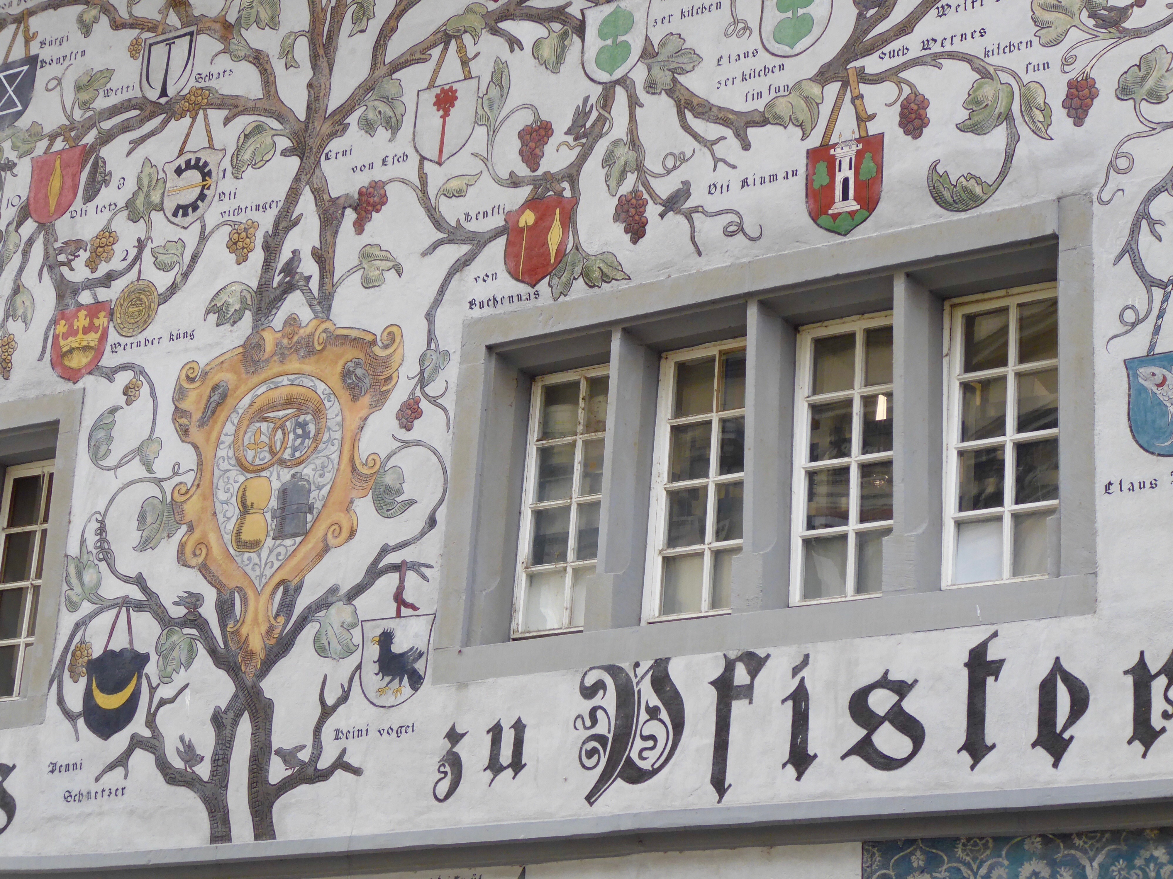 Mural of the Pfistern family tree decorated with local coats of arms.