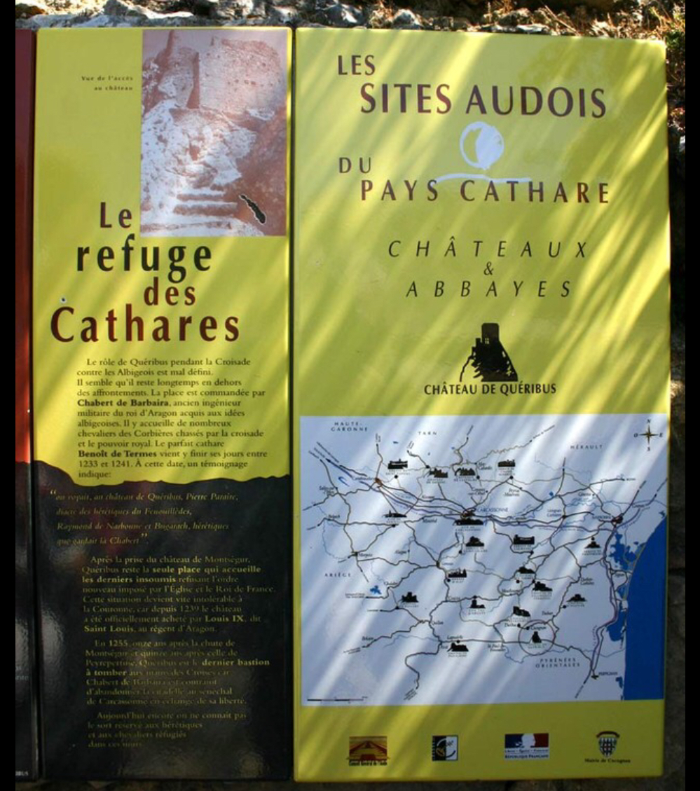 Curiously, the brochure that we received at reception only mentioned in passing the “reconstruction” of the castle after the 13th century. Nothing about the Cathars, or the “crusade” against them. From an information panel: