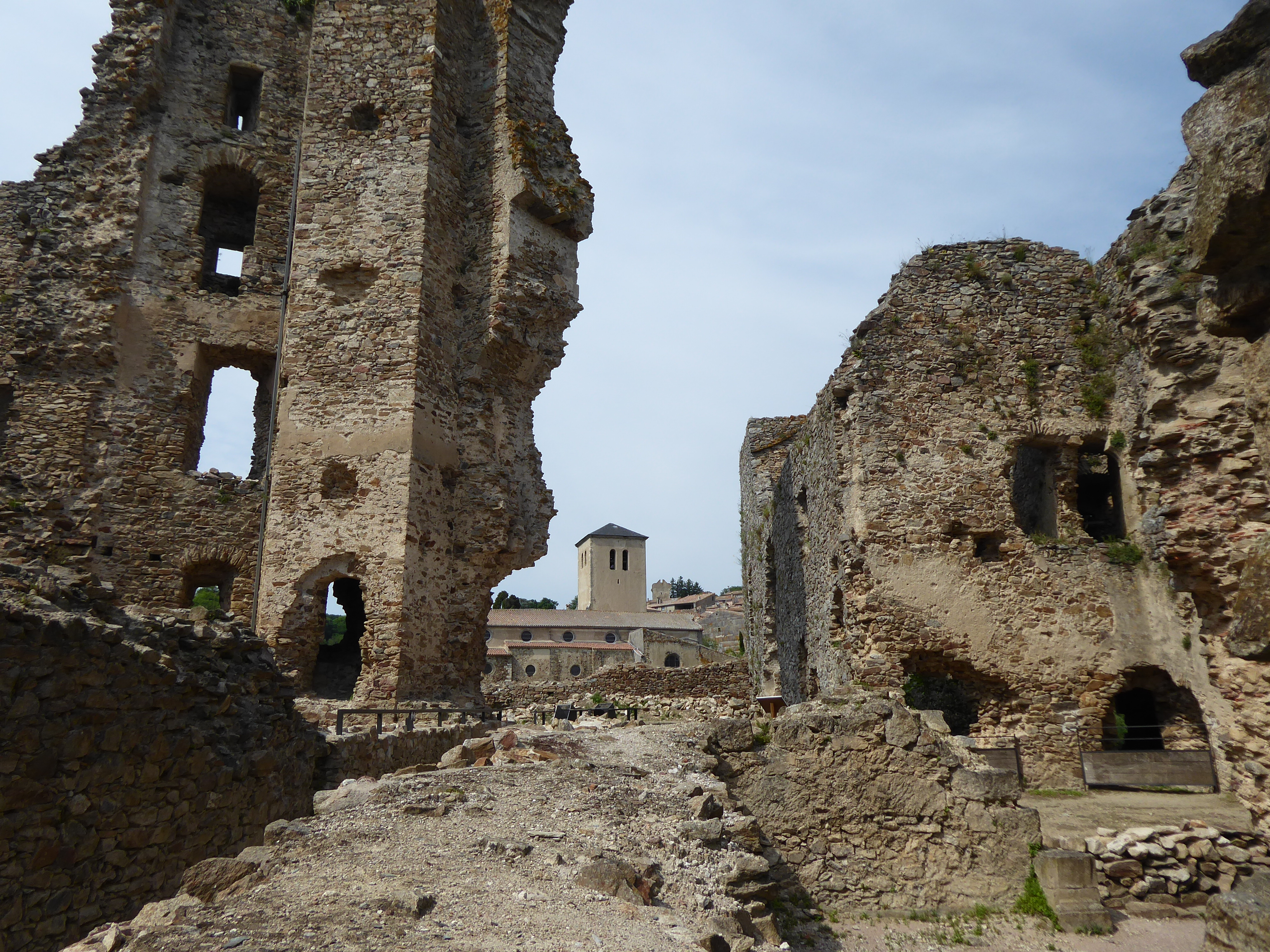 From the museum and the town of Mazamet, we drove through the green forests and fields of the Montagnes Noires, or the Black Mountains, to the village of Saissac. The village overlooks the broad valley that connects the Atlantic and the Mediterranean; this is the valley that is home to Carcassonne. Even on hazy days, you can see the entire range of Pyrenees. Just below the village, but still atop steep promontories, sit the ruined walls of the château. We wanted to experience one of the castles purportedly decimated during the Cathar Crusade.