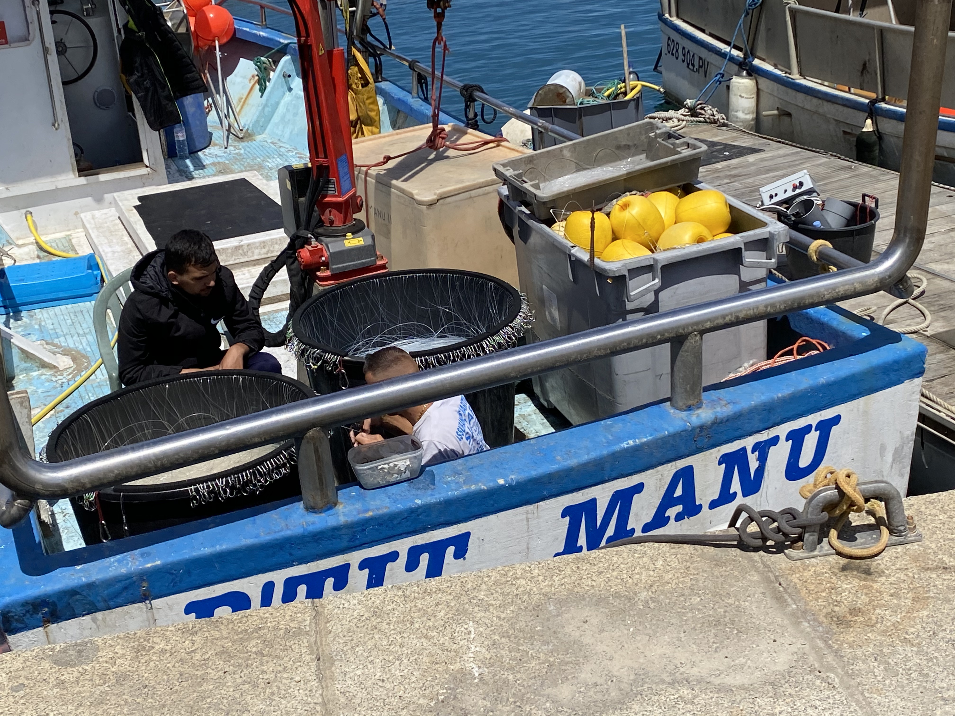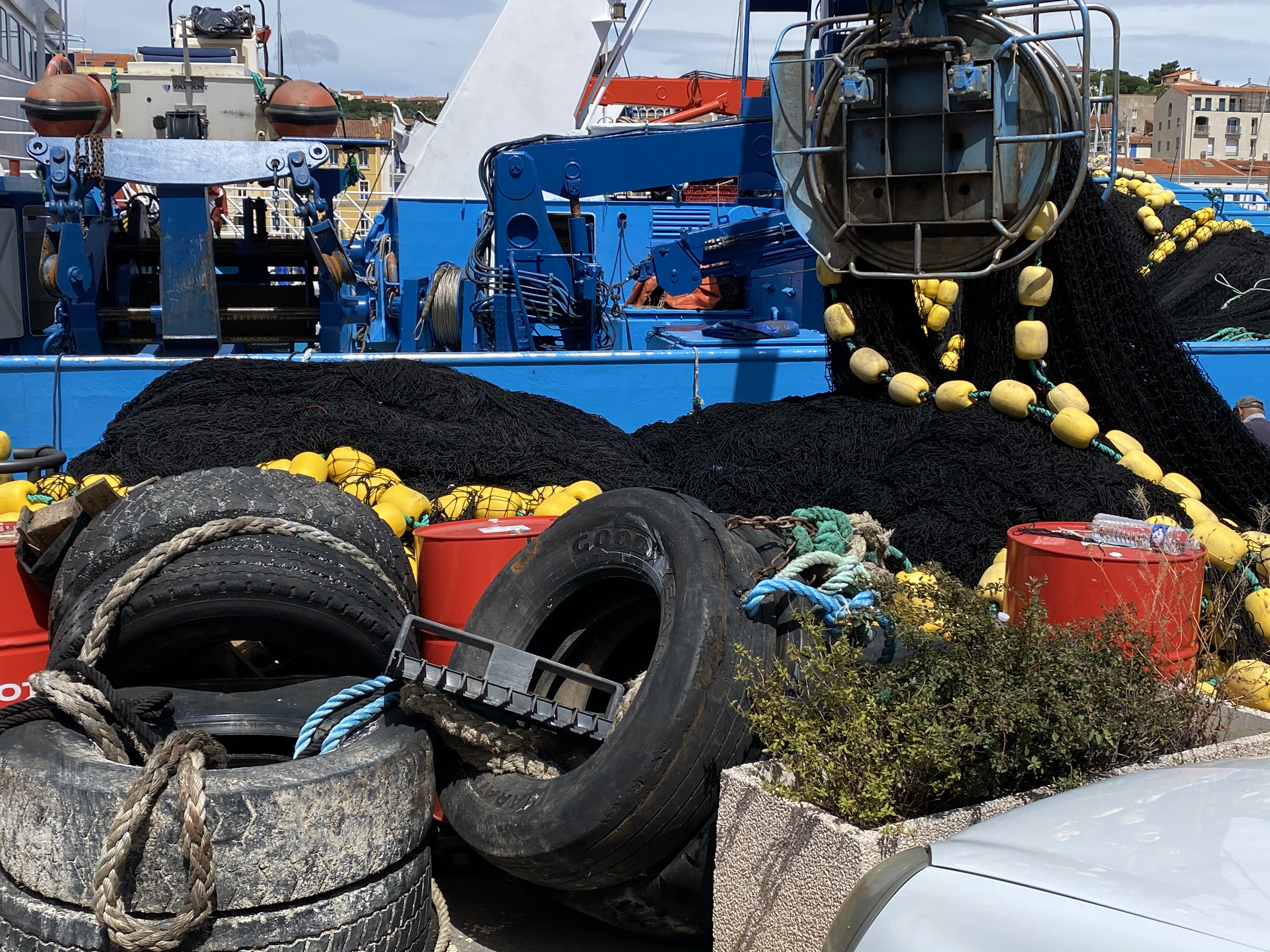 Unlike neighboring Collioure (about which we published a post last year), this port is a working port. Fishermen (we didn’t see any women) were mending nets and stringing hooks.