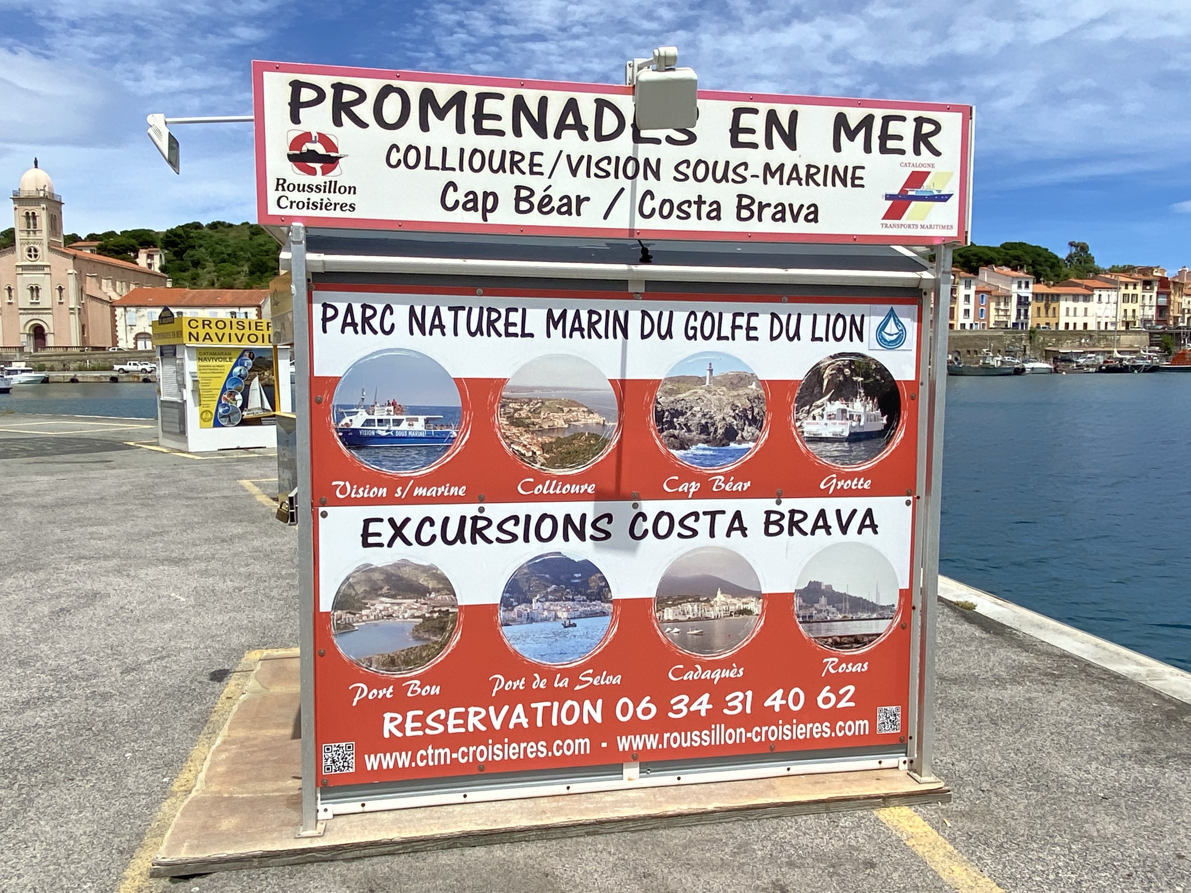 Tour boats for excursions along the Côte Vermeille and the Costa Brava wait for company.