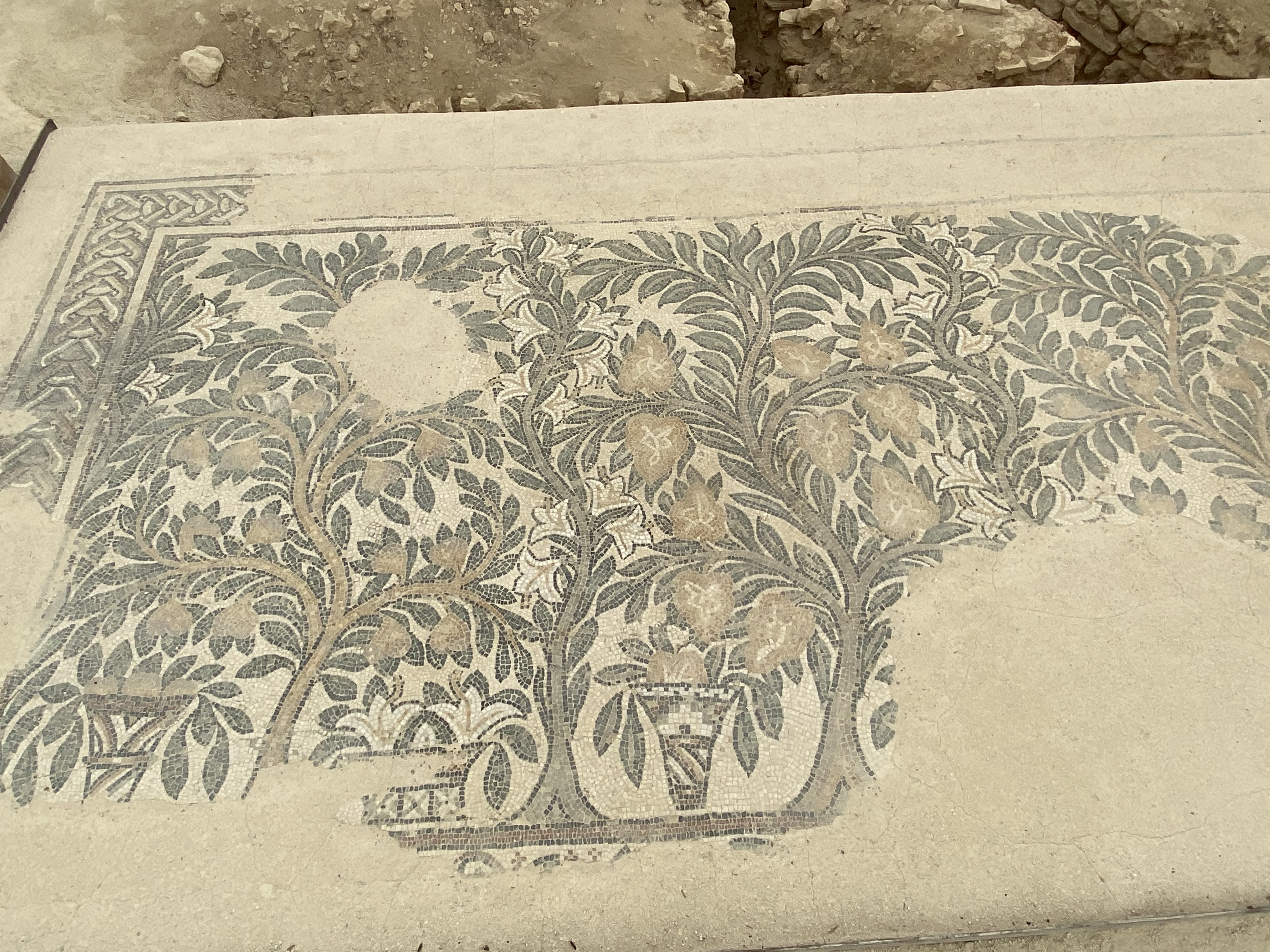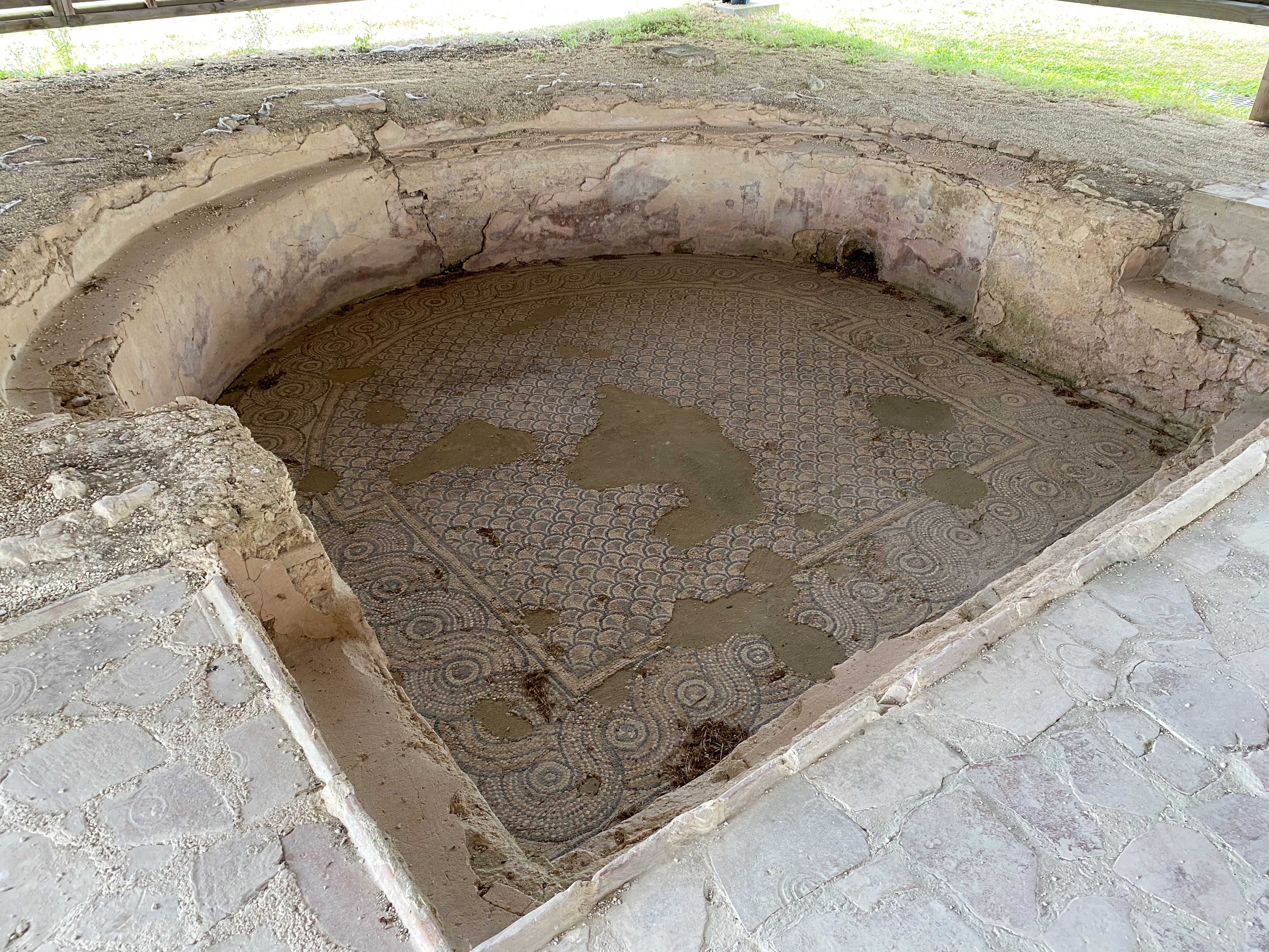We have a weakness for mosaics. We have seen relatively small examples in other ancient sites, as well as those transplanted into museums. But here, it is much easier to imagine walking barefoot around this very big villa, enjoying beautiful patterns underfoot. Areas with showy mosaic patterns of plants and curves were for the owners and their guests. (Did the guests roll their eyes at the ostentation of their hosts, or long to imitate them?) Areas with simpler geometric patters were mostly private and utilitarian areas, zones that were more about running the household than entertaining. (We assume there were slaves serving in this household.)