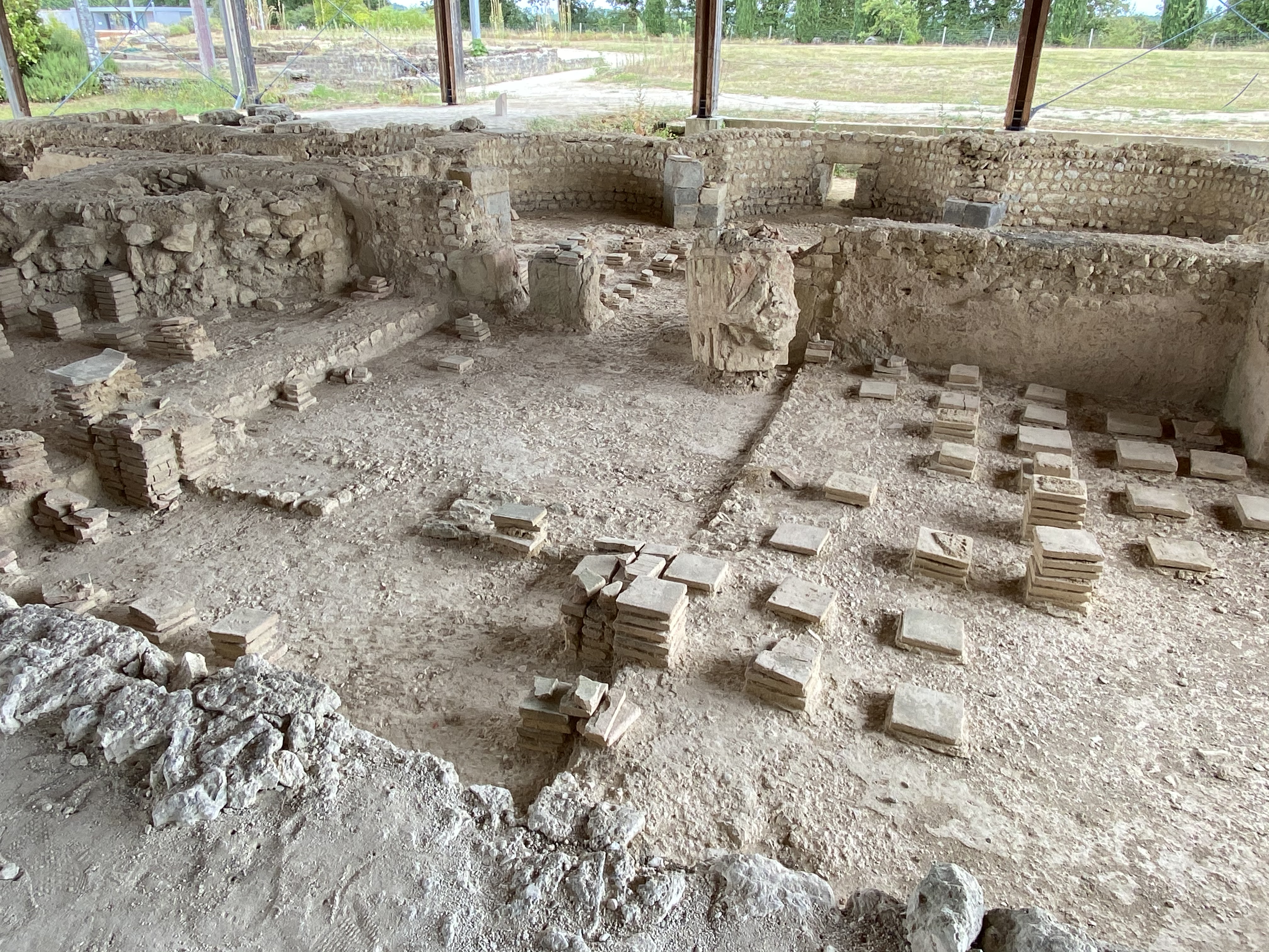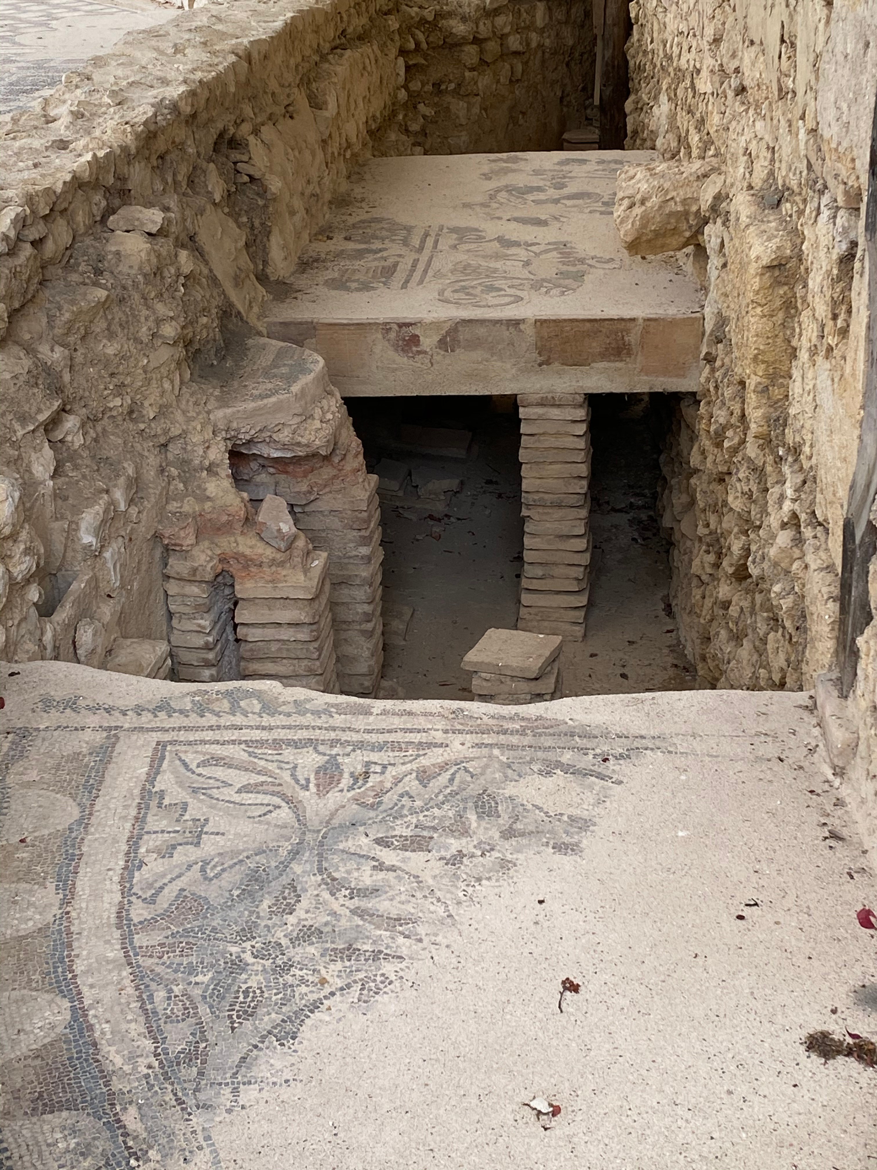 Something very Roman as well as very high-end here was the system of underfloor heating, or hypocaust. The excavations show the spaces through which hot air was pushed. You can see the stacks of tiles that held up the tiles and mortar that underlay the mosaics.