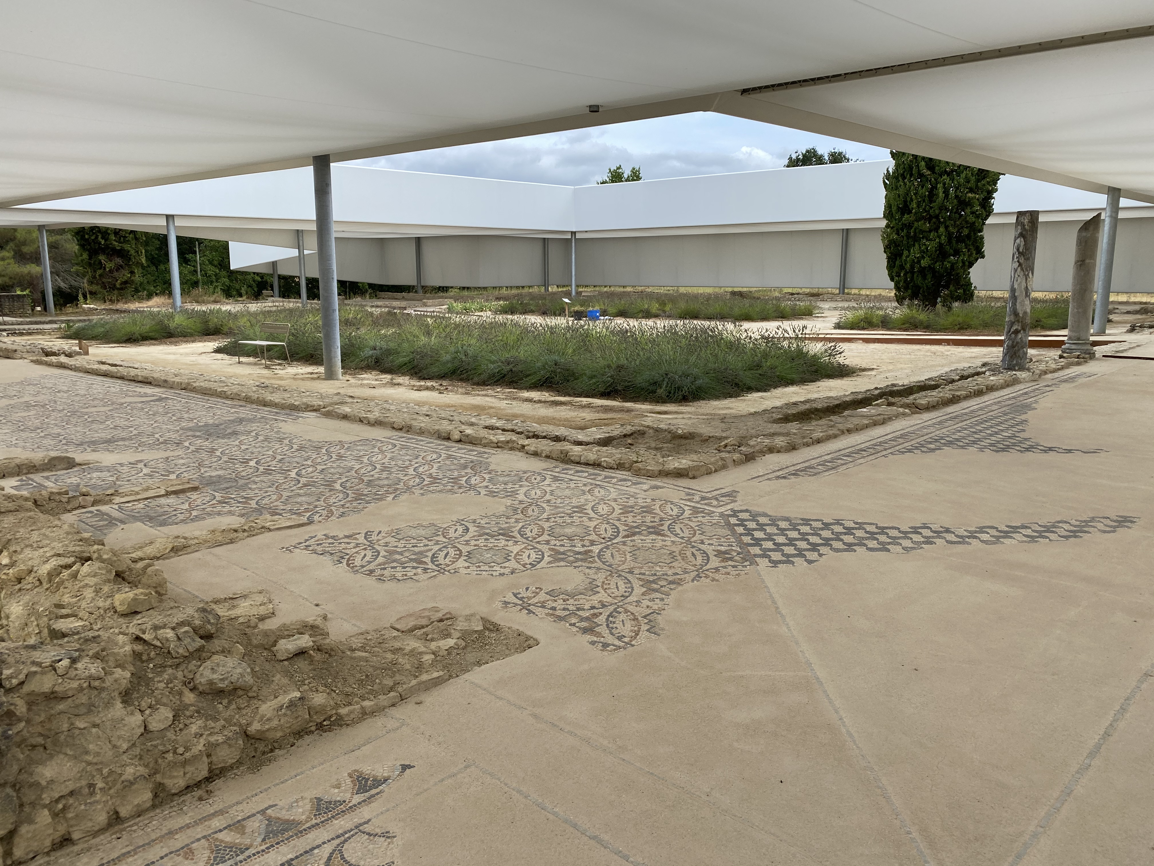 The white fabric structure floating over the villa as added very recently, in 2018. A Portuguese architect, João Luís Carrilho da Graça, is the designer. Its elegance and effectiveness struck us. Its being thoroughly modern and abstract means it doesn’t compete with the delicate mosaics. The white fabric provides an even illumination. The panels that extend almost to the ground protect the site from prevailing winds and the afternoon sun.