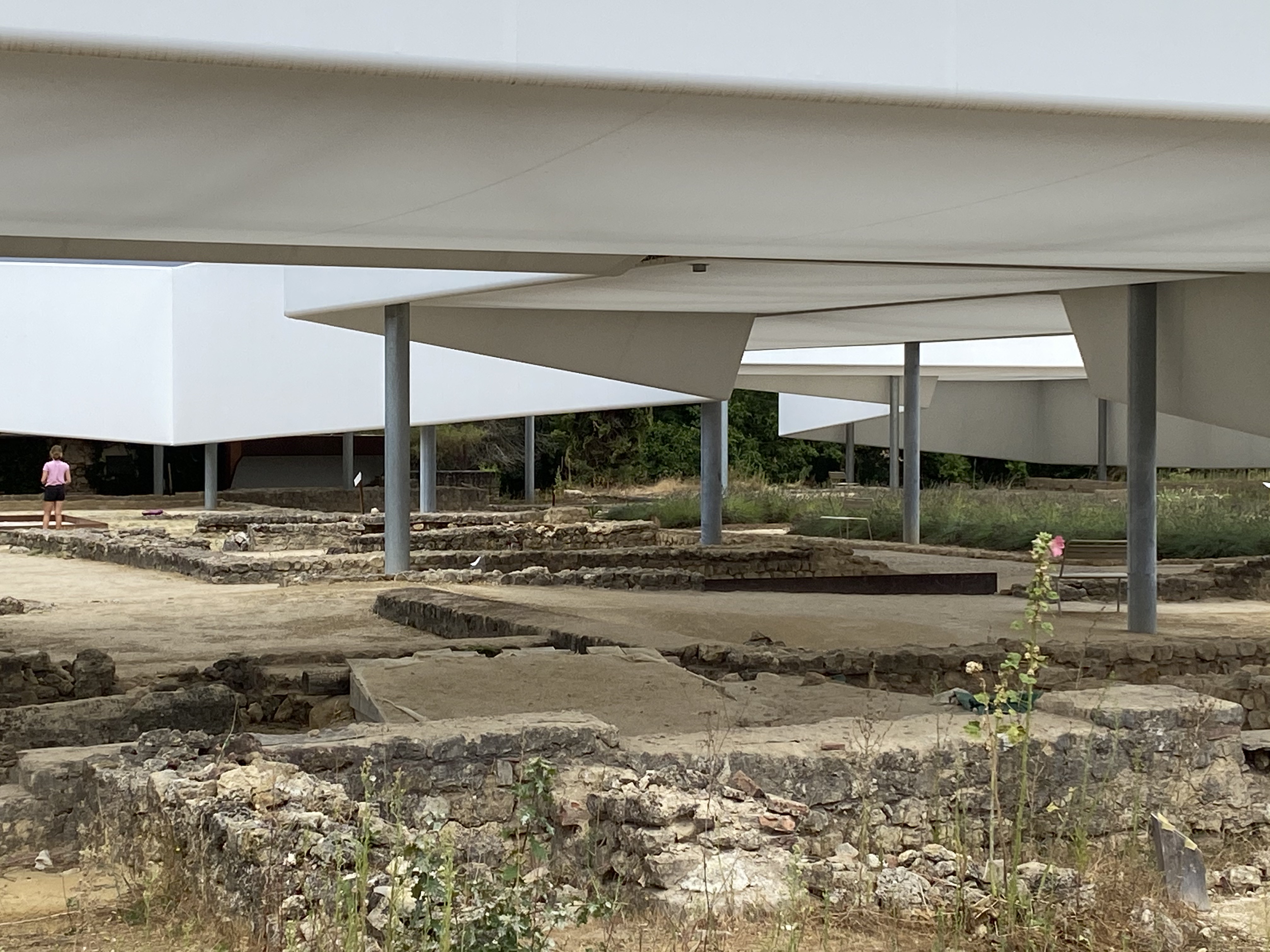 We found an angular white cloud floating over the landscape (more about that in a minute). The translucent fabric protects and illuminates the layout of the large villa from the late Roman Empire.