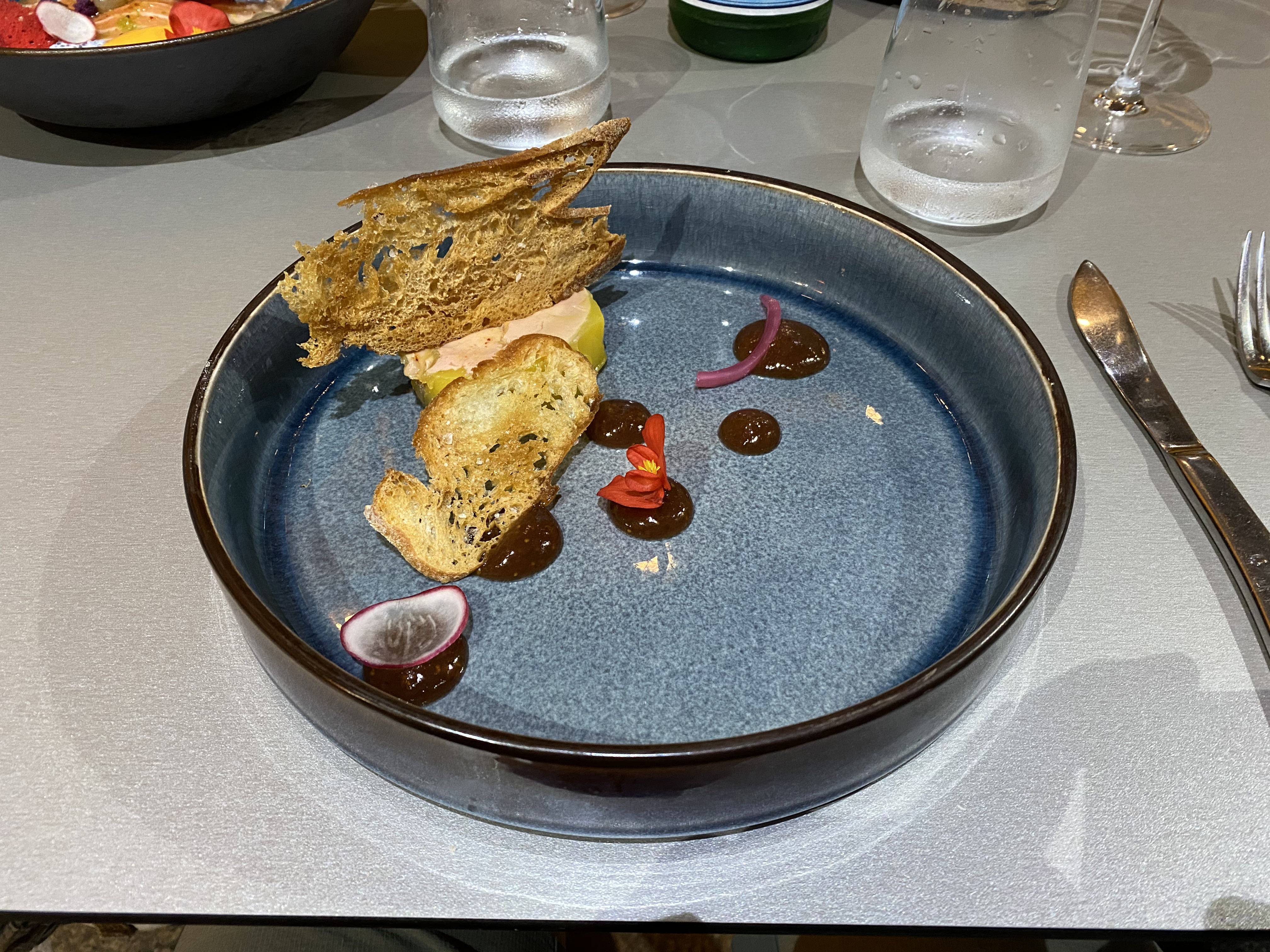 Foie gras semi-cooked at 56 deg C / long pepper of Java, fig condiment / banyuls (a dessert wine of this region) / raspberry vinegar, seared figs with balsamic, toasted slivers of baguette