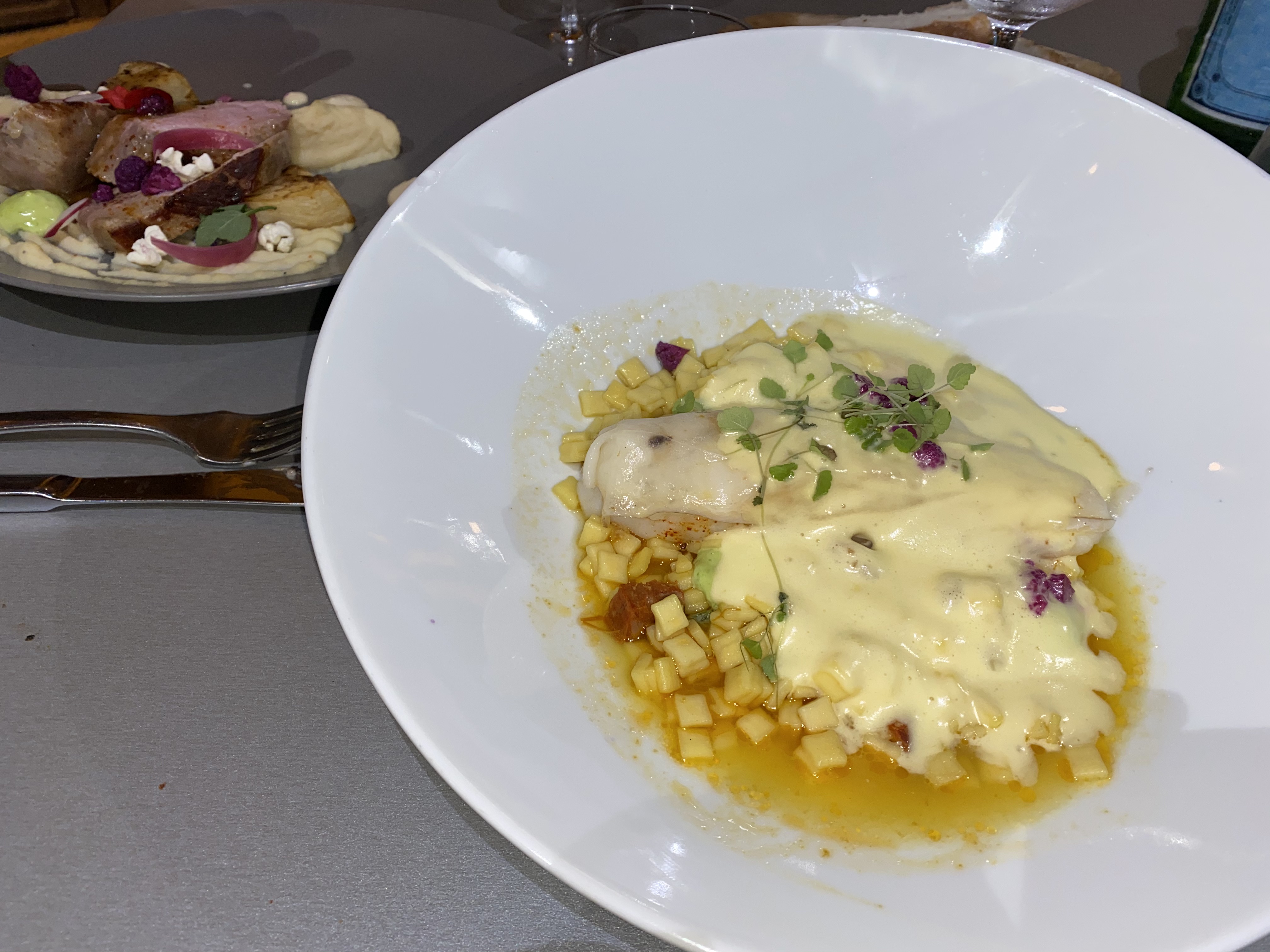 Monkfish gently roasted, covered with lard colonnata (an Italian bacon fat), crozets (little square pasta from the Alps) cooked like a fiduea (a Valencian fish pasta dish), fish bone broth with safran, hollandaise sauce / dots of yuzu and aïoli