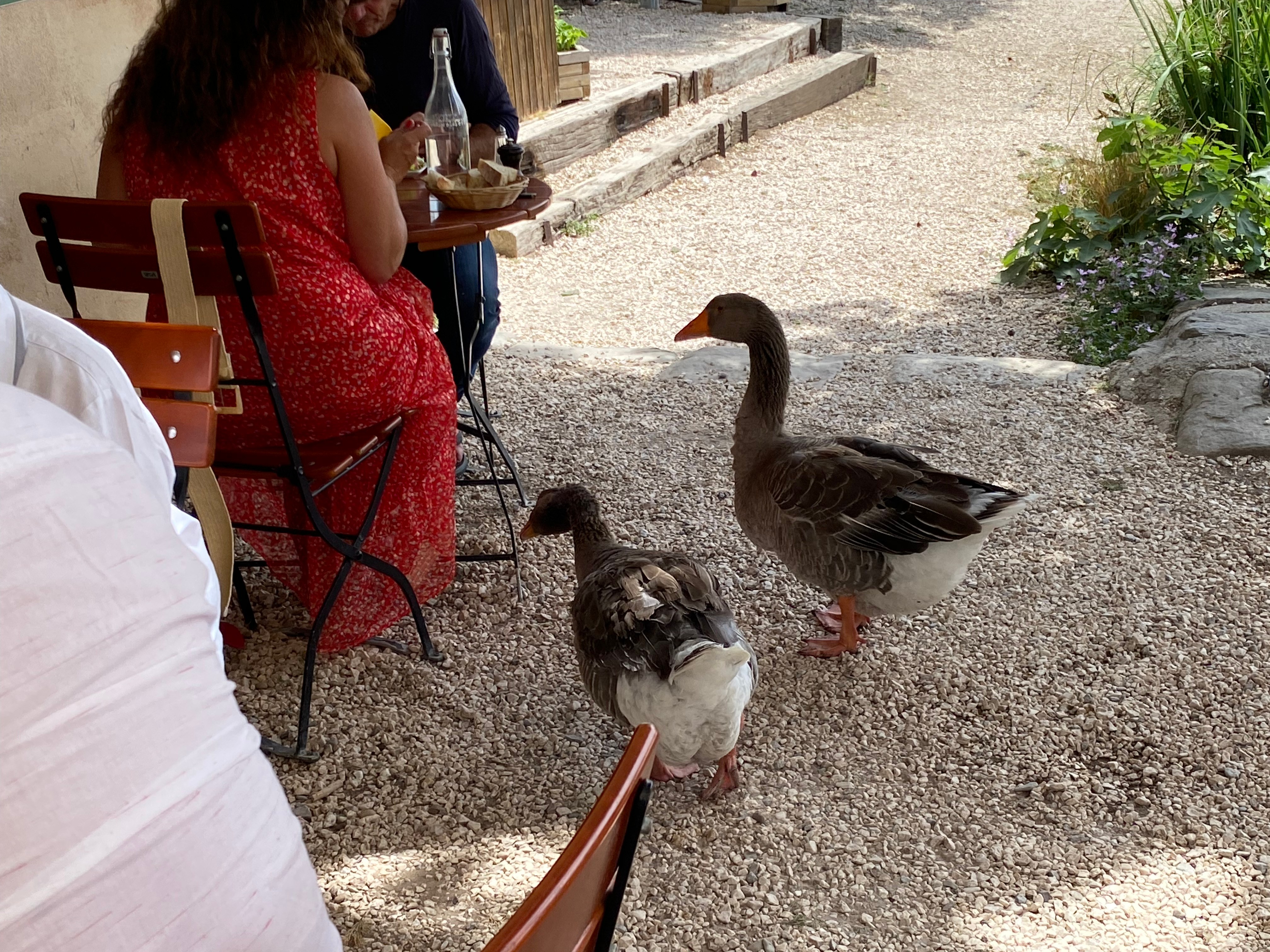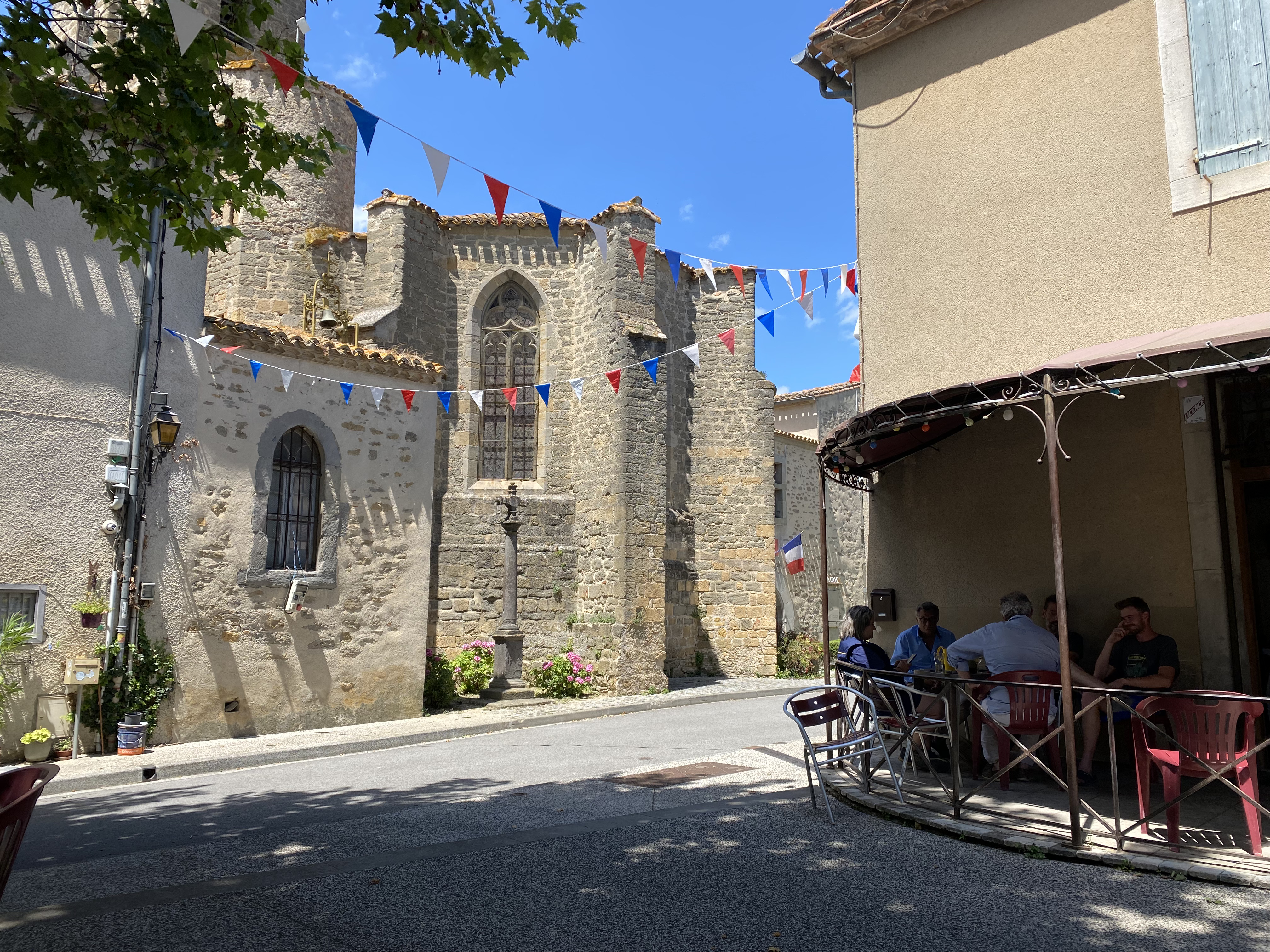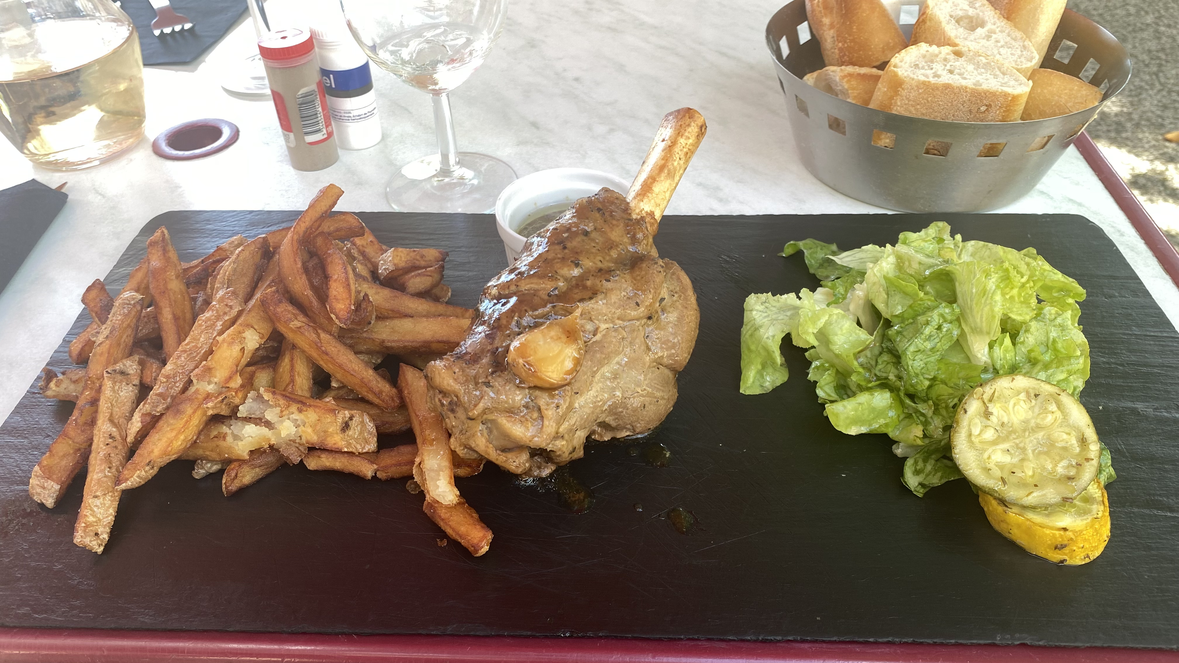 The village where we live is tiny; while it has been here for hundreds of years, today it is really a bedroom community for Carcassonne. The town hall, medieval chapel, a great plane tree, and a bar / café compose the sleepy village square. In the time we’ve lived here, there have been a couple different café owners; the food has been remarkably unremarkable, and the hours unpredictable. During the pandemic, of course there was no activity. In the last few weeks, we have noticed a new liveliness. So one Friday noon, spontaneously, we stopped in. As we sat down at a simple table under the plane tree, we watched the server deliver a platter with an immense slab of beef, frites, and salad to a table of six people. I assumed that this was a platter for the table to share. Then he returned with another platter loaded down with an equally massive slab of beef. Then a platter of a giant lamb shank. And another. And another. When the server came to us, we pointed at the lamb shanks and ordered one each. Way too much food (we didn’t eat dinner that night!). But we are delighted that our little village café is alive again with tasty carnivore platters.