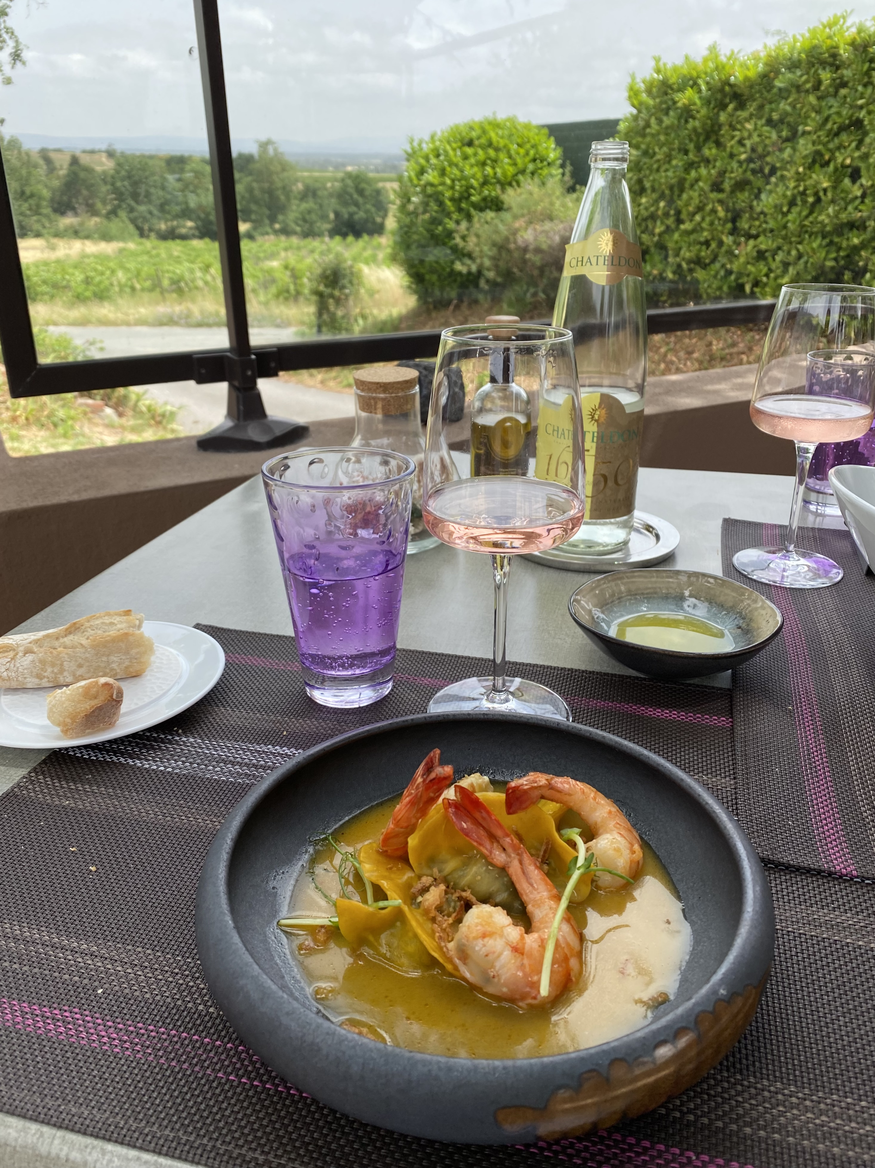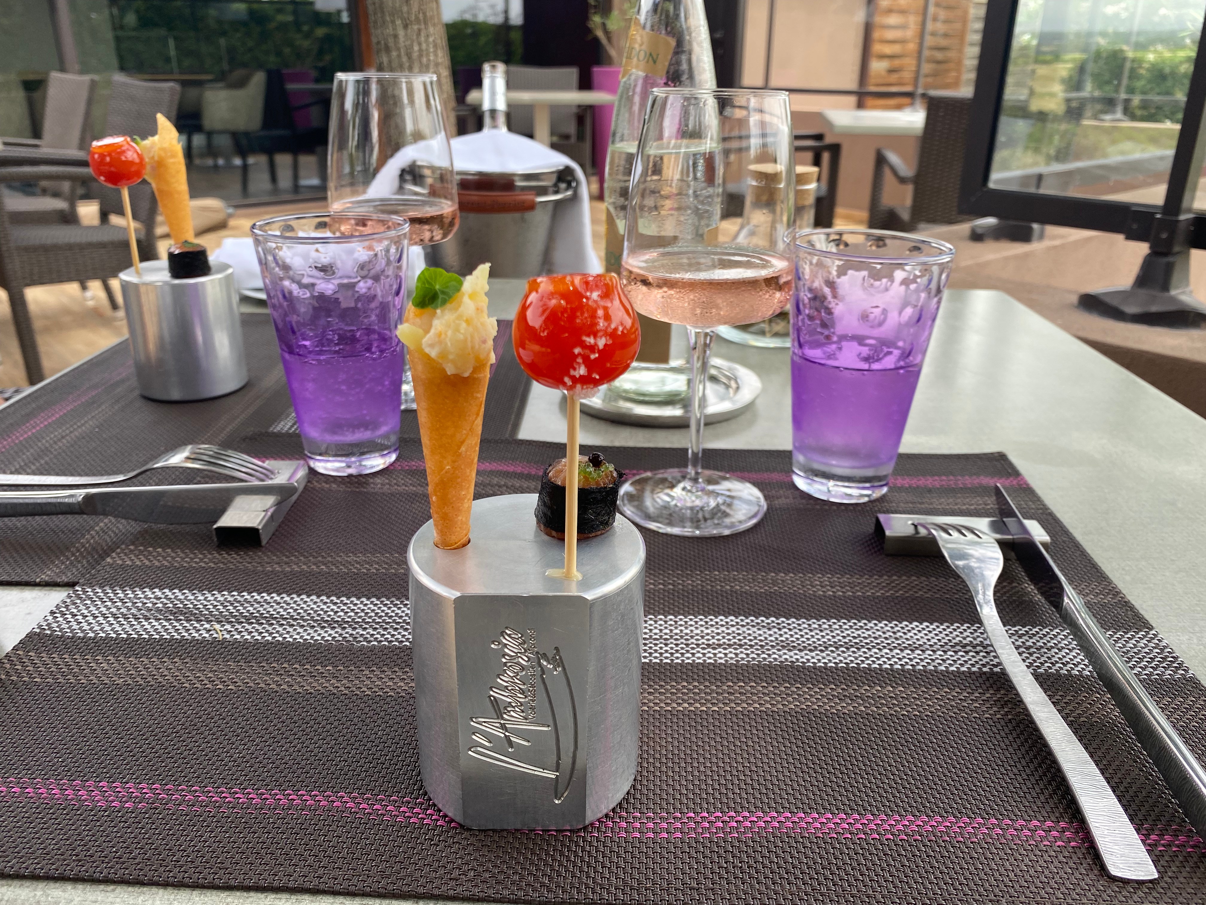 Each Sunday during the pandemic, we picked up dinner from one of our favorite local restaurants, L’Ambrosia, in the village of Pezens, just next to our village. Chef Sébastien and Sommelier Valérie are a charming young couple. We have always enjoyed eating at their restaurant. They offer delicious fine dining at very reasonable prices. When the pandemic first hit, we read so many stories of restaurateurs and other business people suffering from the sudden loss of customers and the government’s scrambling to provide assistance. When we realized that Sébastien and Valérie were offering take-out meals on the weekends, we were more than happy to order — of course to enjoy the food, but also to help them out during the difficult times. Finally, in the middle of June, the government allowed restaurants to open both inside and outside. We just had to go see our friends and enjoy their good food in the proper way. Reheating food at home is nice, but eating it at table, beautifully plated, fresh from the chef’s hands — that’s the way it should be! This meal out on the restaurant terrace, overlooking vineyards and rolling hills, marked for us finally stepping out from the pandemic.