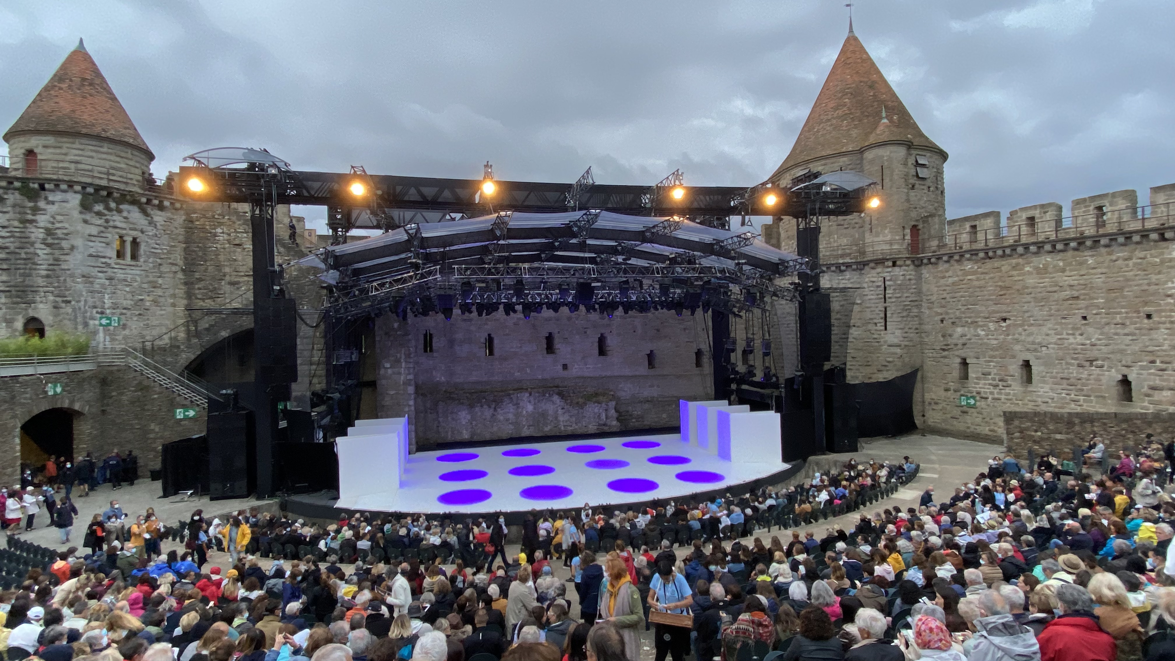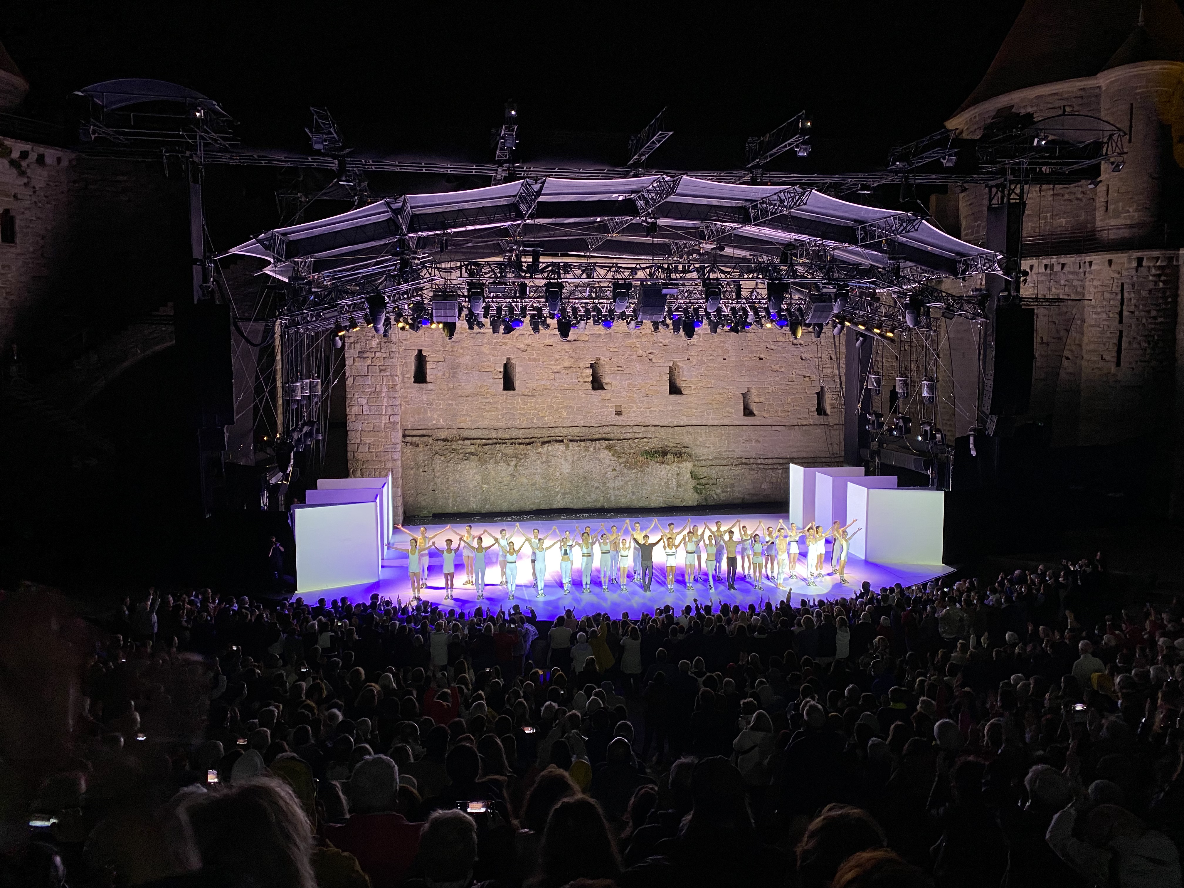 In non-pandemic years, the Festival of Carcassonne takes place throughout July. There are performances of all types and sizes all over town, including in the open-air theater in La Cité. We bought tickets to a performance of the Béjart Ballet. (Long ago, when I lived in New York, I was lucky enough to see a few of their performances. I was eager to experience what they offer now.) In order to get into the theater, everyone needed to stop at a health-security tent; we showed our proof-of-vaccine and received a confirmation bracelet. The performance was outside, but there was no reduction of capacity (all seats were filled); masks were required. This was the most people we had seen in one place in a very long time. It was a fun long performance (no intermissions so that people can’t mingle) with music mash-up of Mozart and Freddy Mercury!