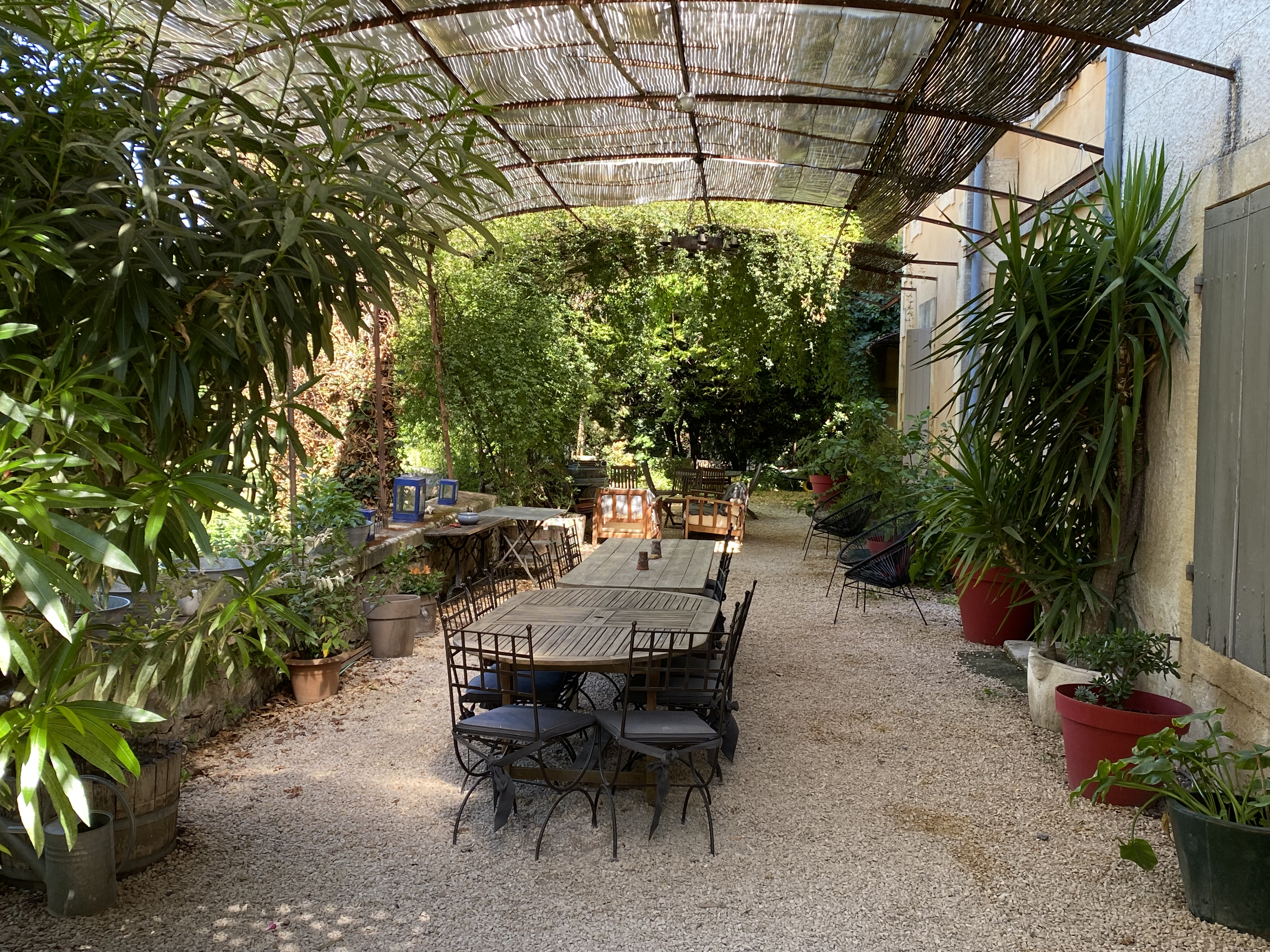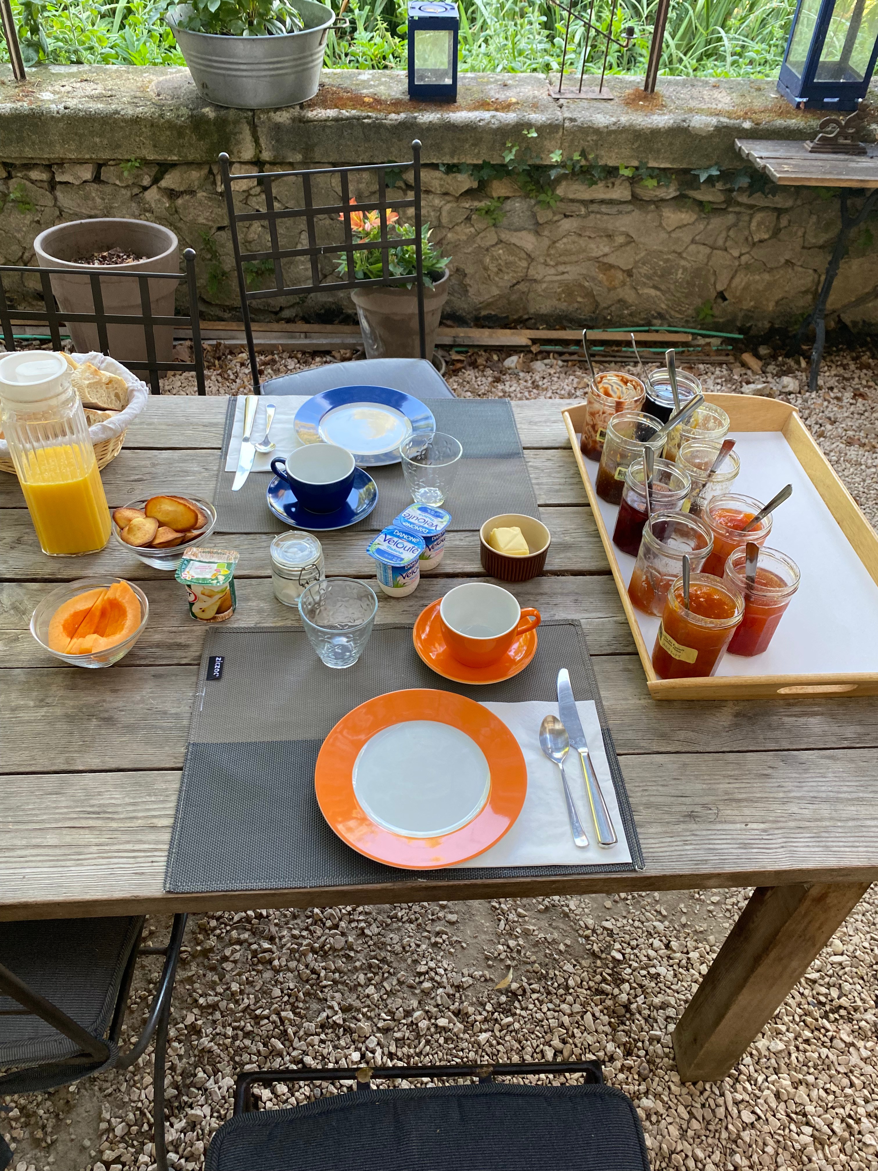 Once again, the simplest things are such a pleasure now. We stayed in a rustic B&B about 20 minutes north of Nîmes, and not far from where Michael and Philippe were staying. Our Belgian host had transformed a very large stone village house into a green oasis. Everything inside and out was found-object casual; no pretense here. Lots of homemade jams for breakfast, and way-too-enticing sweet cornbread madeleines, which are apparently a local favorite.