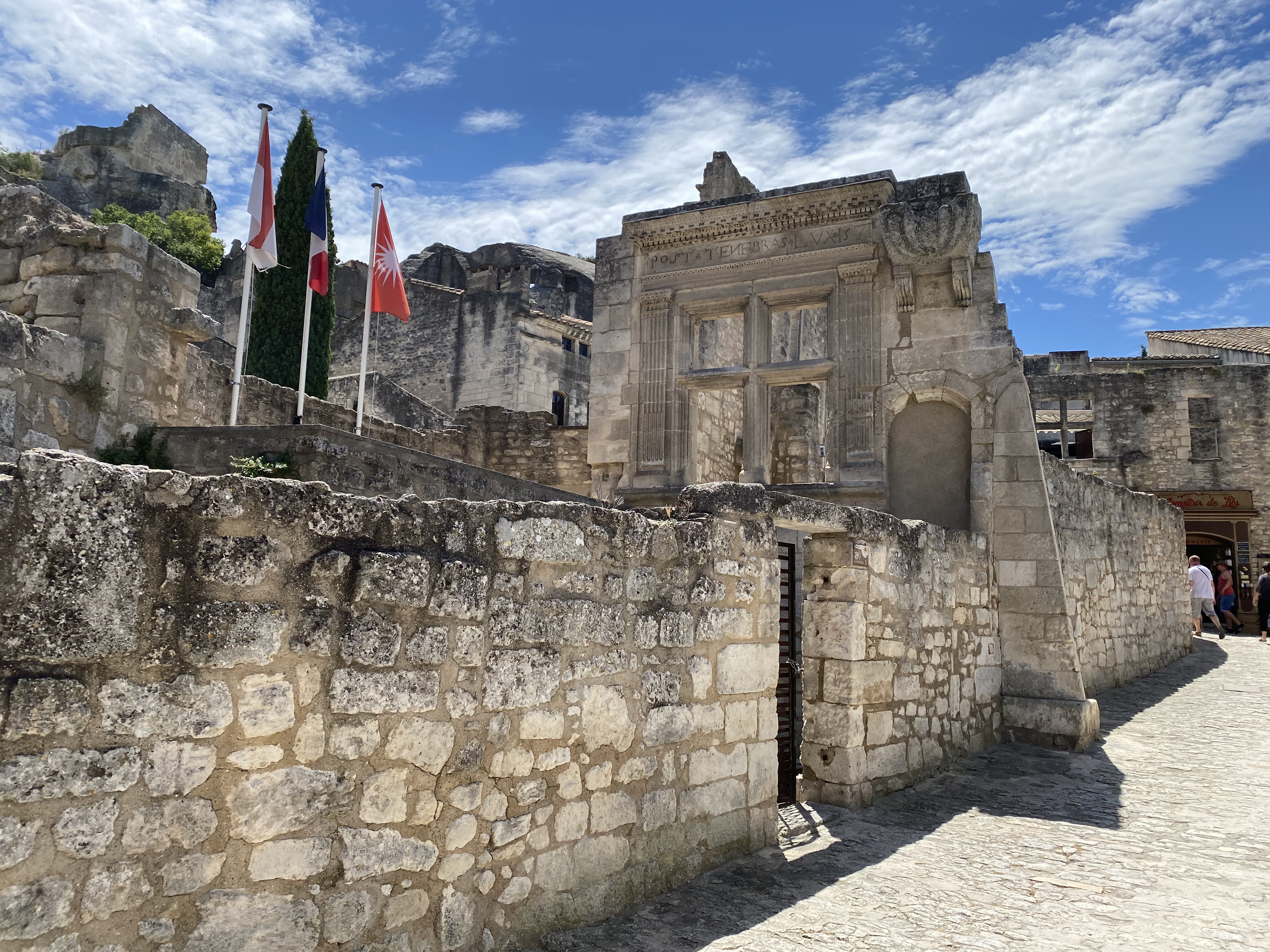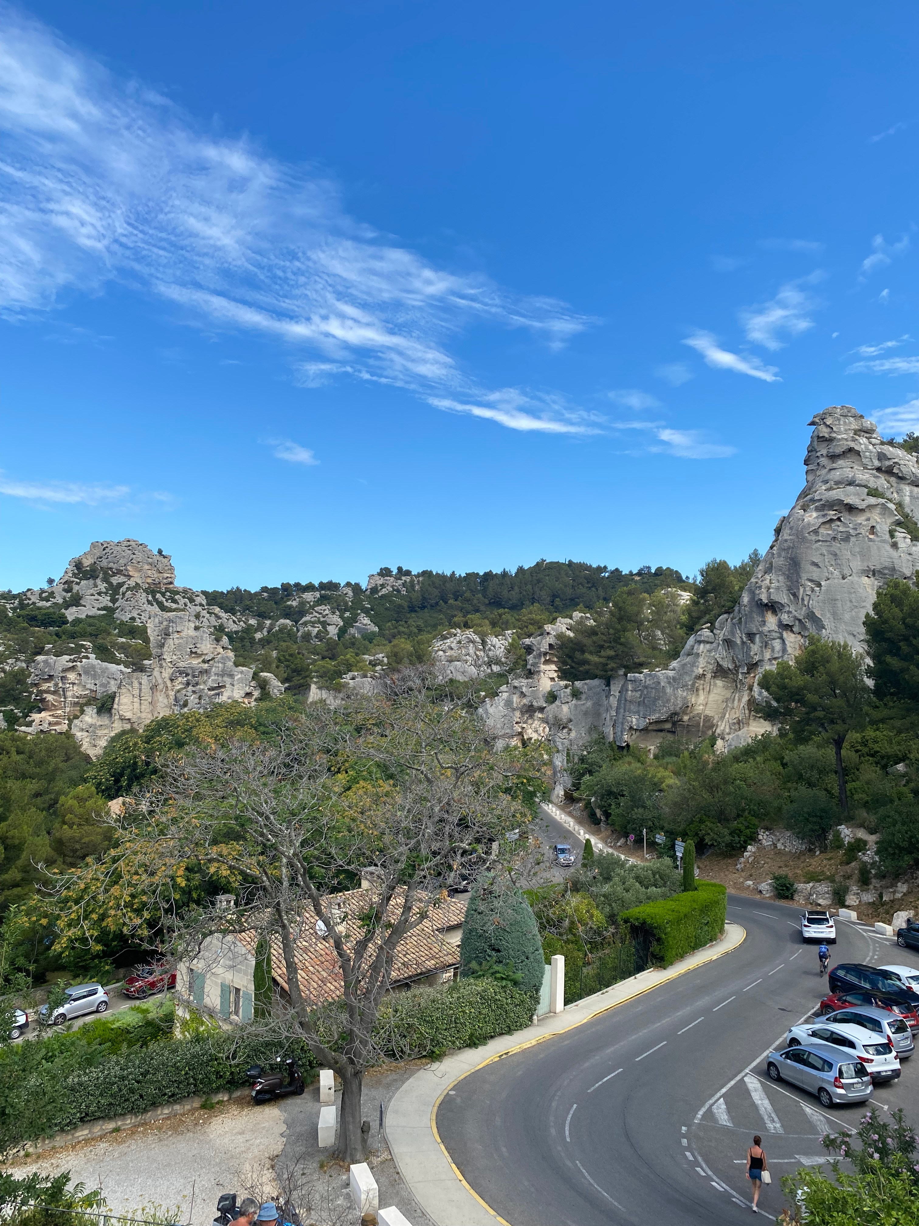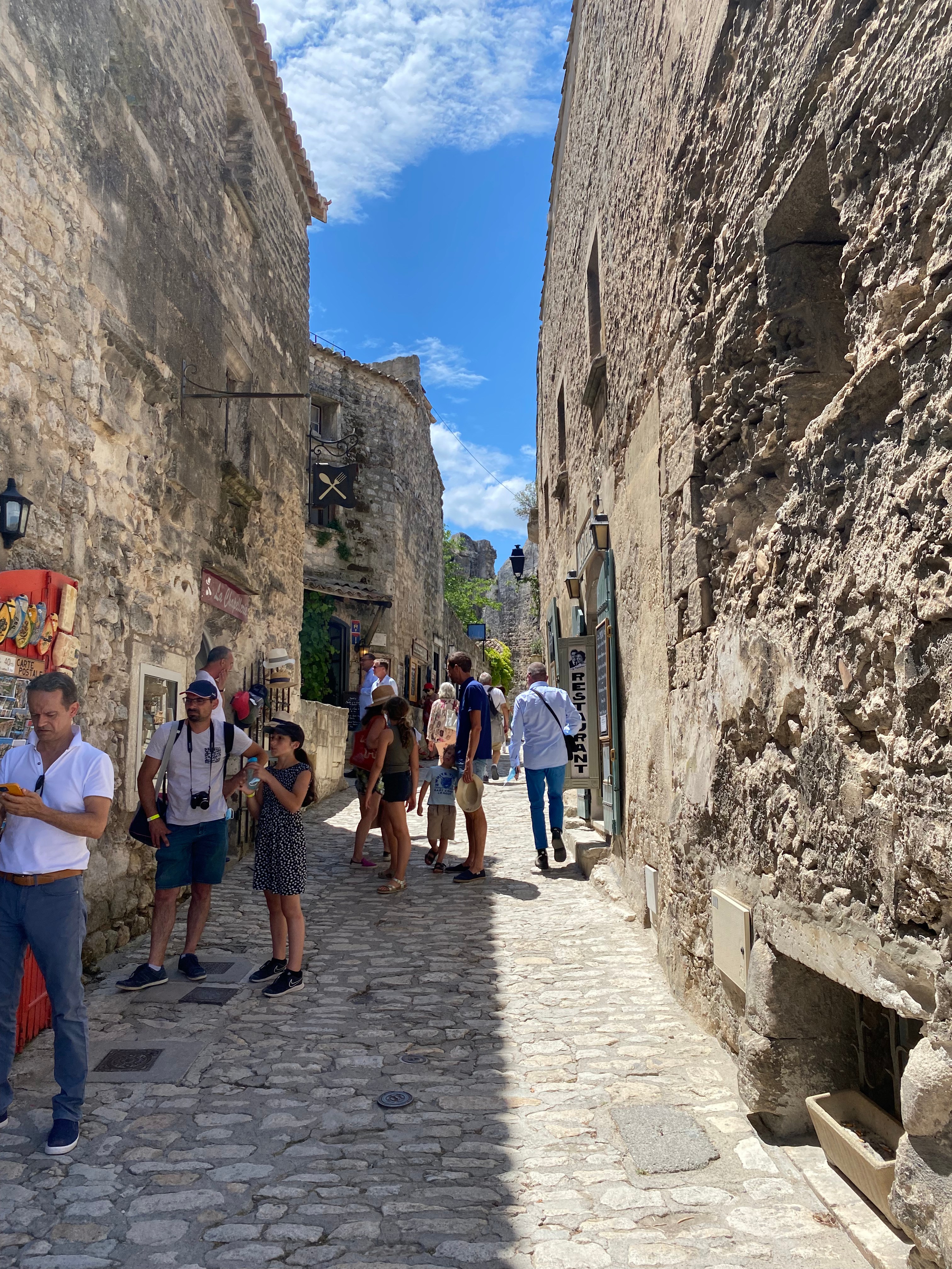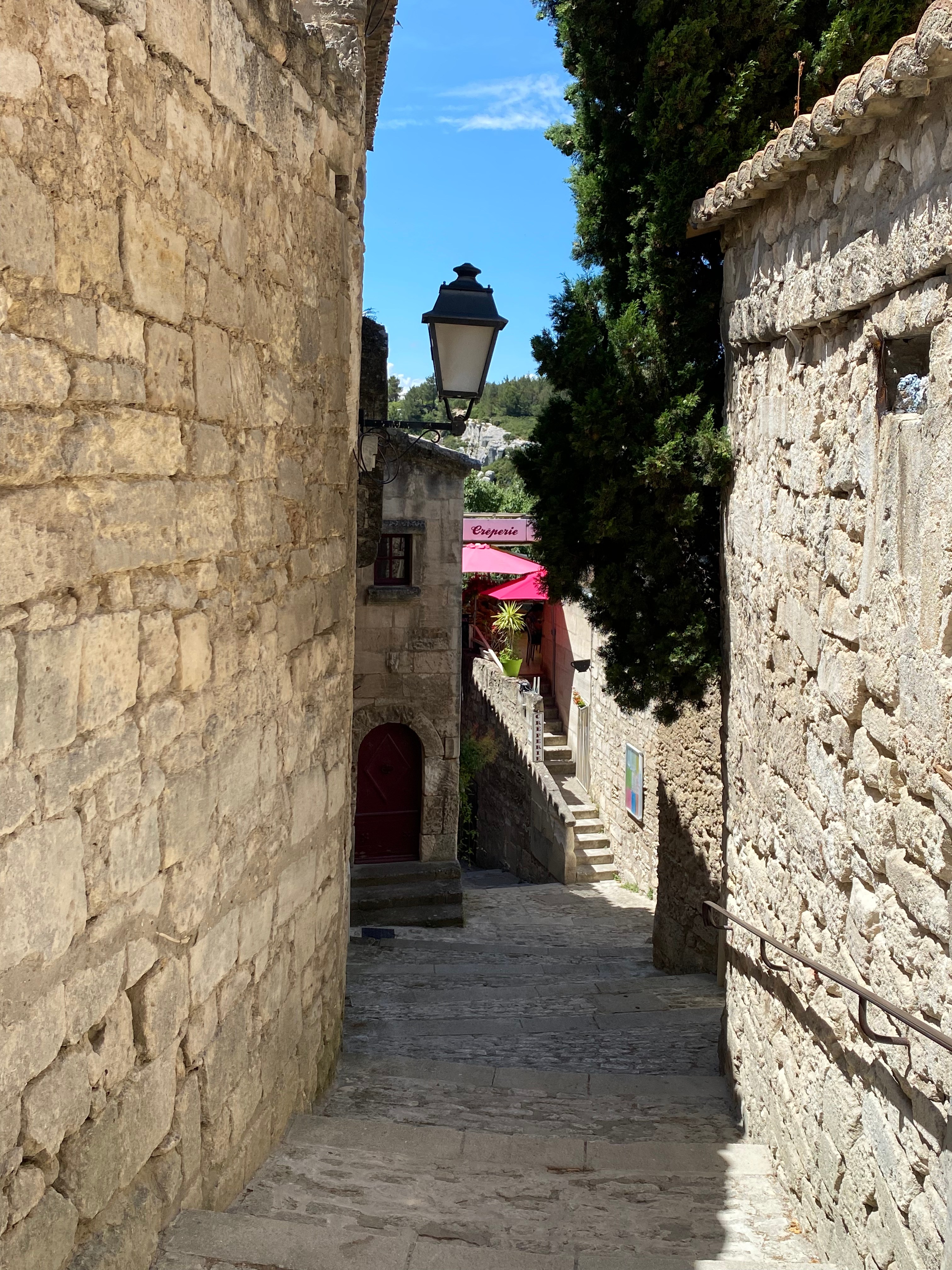 The quarries of the Carrières de Lumières sit just outside and below the promontory of the village of Baux de Provence. We enjoyed some pizzas on a sunny terrace overlooking the valley and rock formations. A wander through the stone streets was fun just because people were out and about. We had noticed previously that many of the shops are the same as the ones in La Cité de Carcassonne, and other historical spots. But no matter; we were glad to find them open for business. We stopped in a what looked like a non-franchise boutique because of some nice ceramics in the window. We found a green and white floral-pattern pitcher that would make a great vase for a wild bunch of flowers. As I was waiting for the credit-card machine to process, I asked where the ceramics were made, thinking of some young artisan in an old village nearby. The saleswoman said, “Oh, Sweden.” And shrugged.
