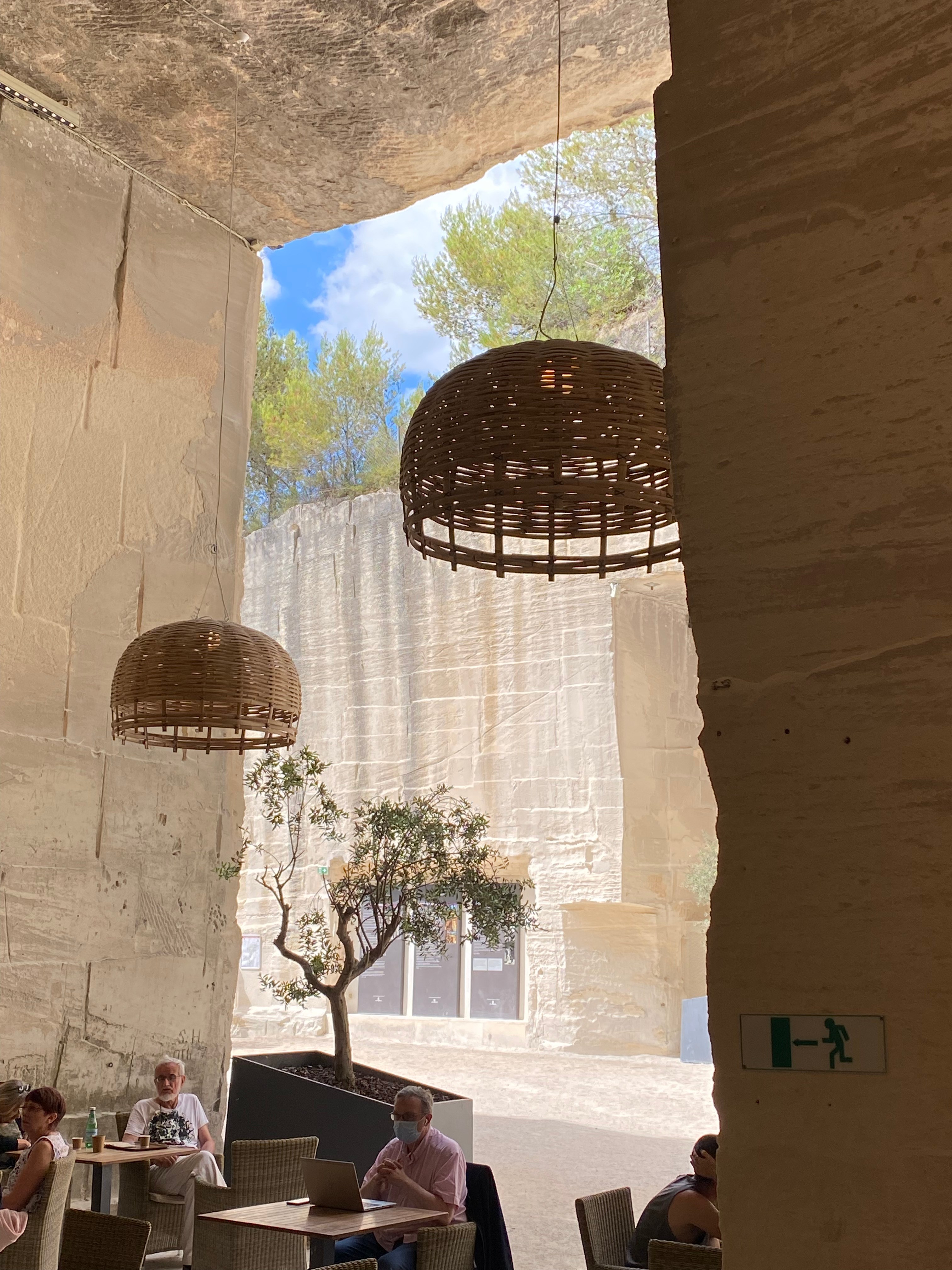 Outside the exhibition space, the café sits in the limestone hill.