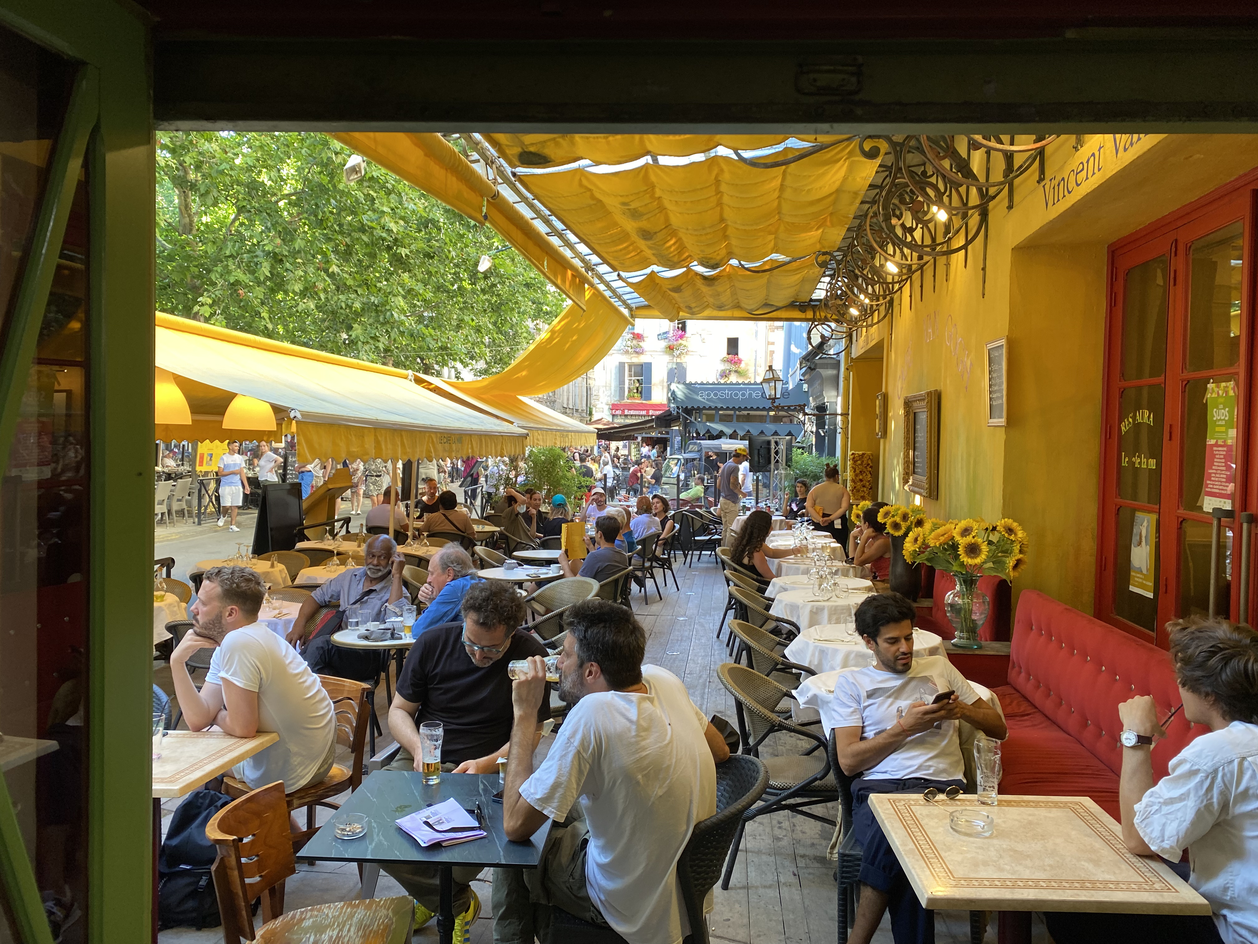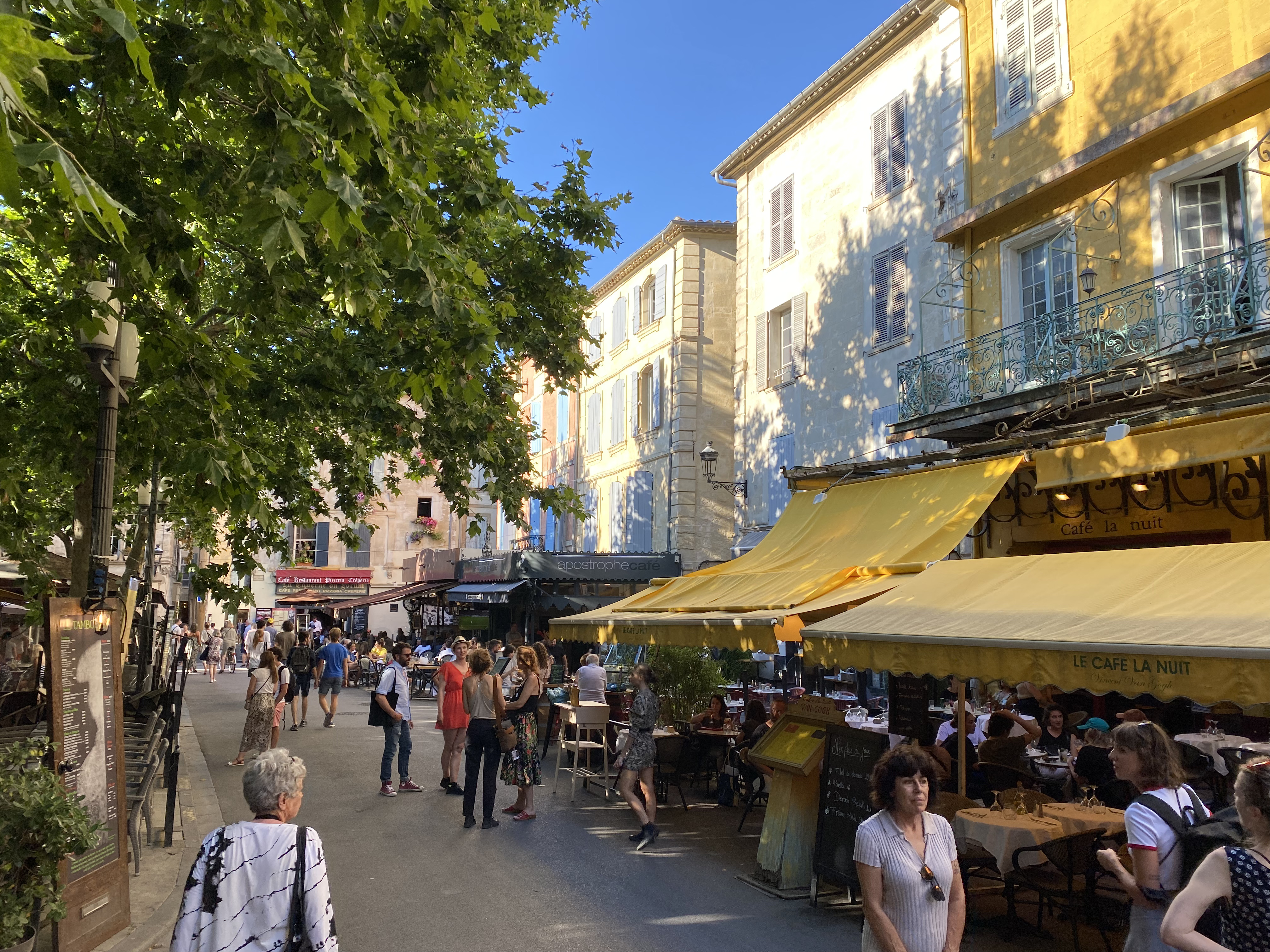 The town of Arles is only about 20 minutes away from the Carrières. (Past blog post.) Perfect for a late-afternoon stroll, and (another!) bite to eat. The main square of the town sits over the ancient Roman forum; only a corner of one of the forum buildings remains. These days, the square is filled edge to edge with cafés and restaurants. Van Gogh made one of the cafés famous – Le Café La Nuit. The current owners make the most of the cultural notoriety.