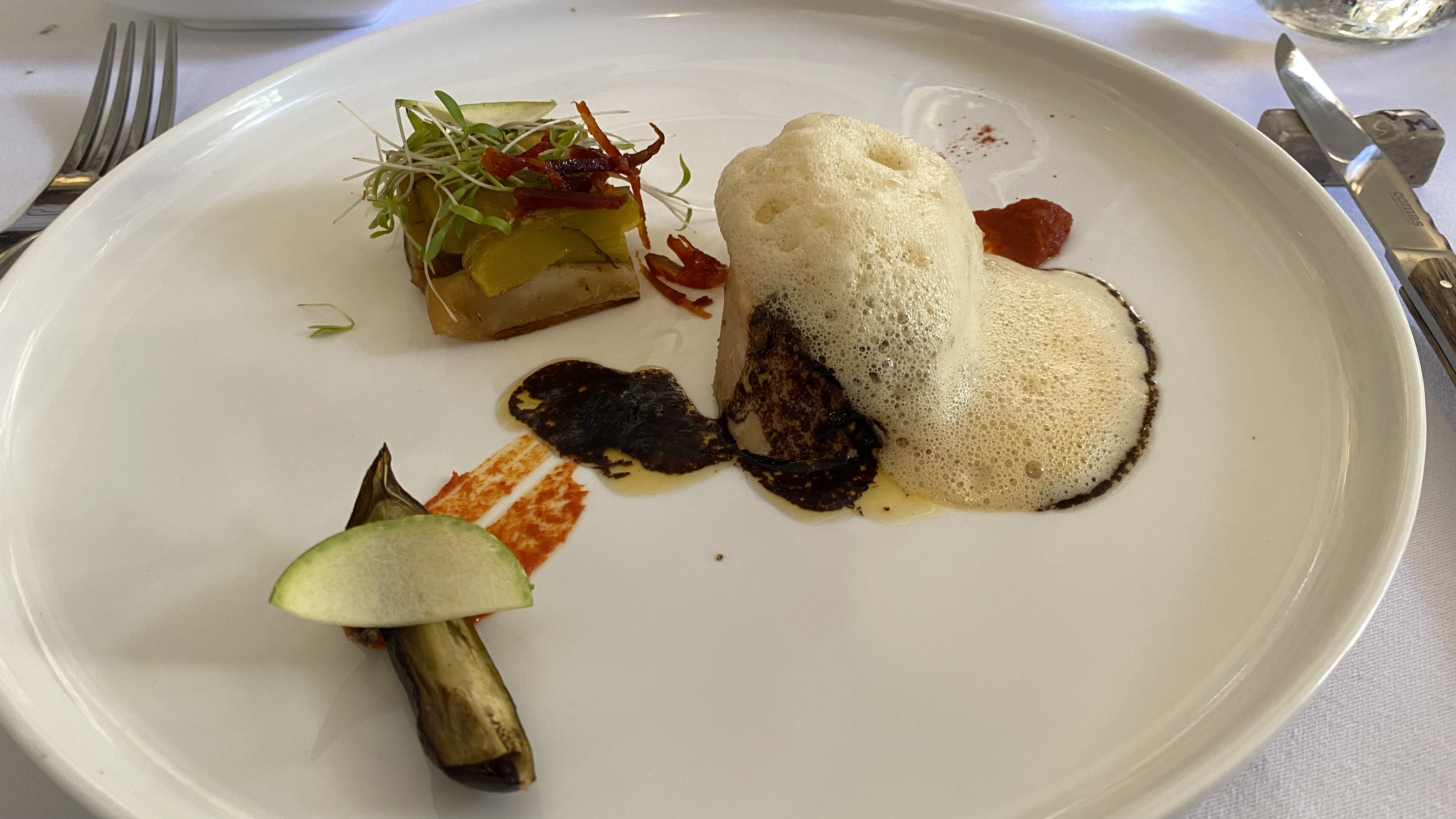 “Mialle” farm chicken, tart of zucchini with thyme, roasted eggplant, chorizo caramel, black garlic jus