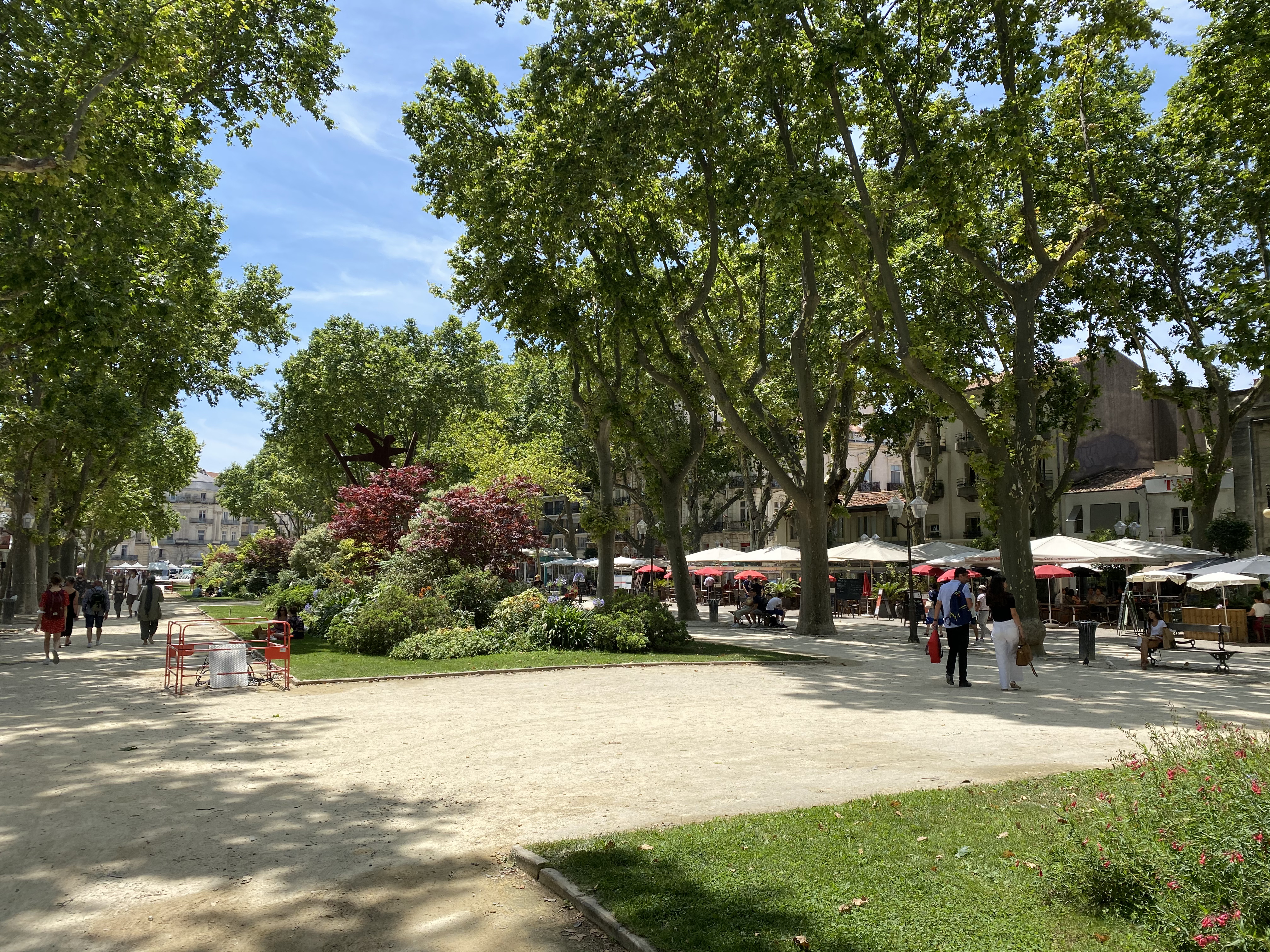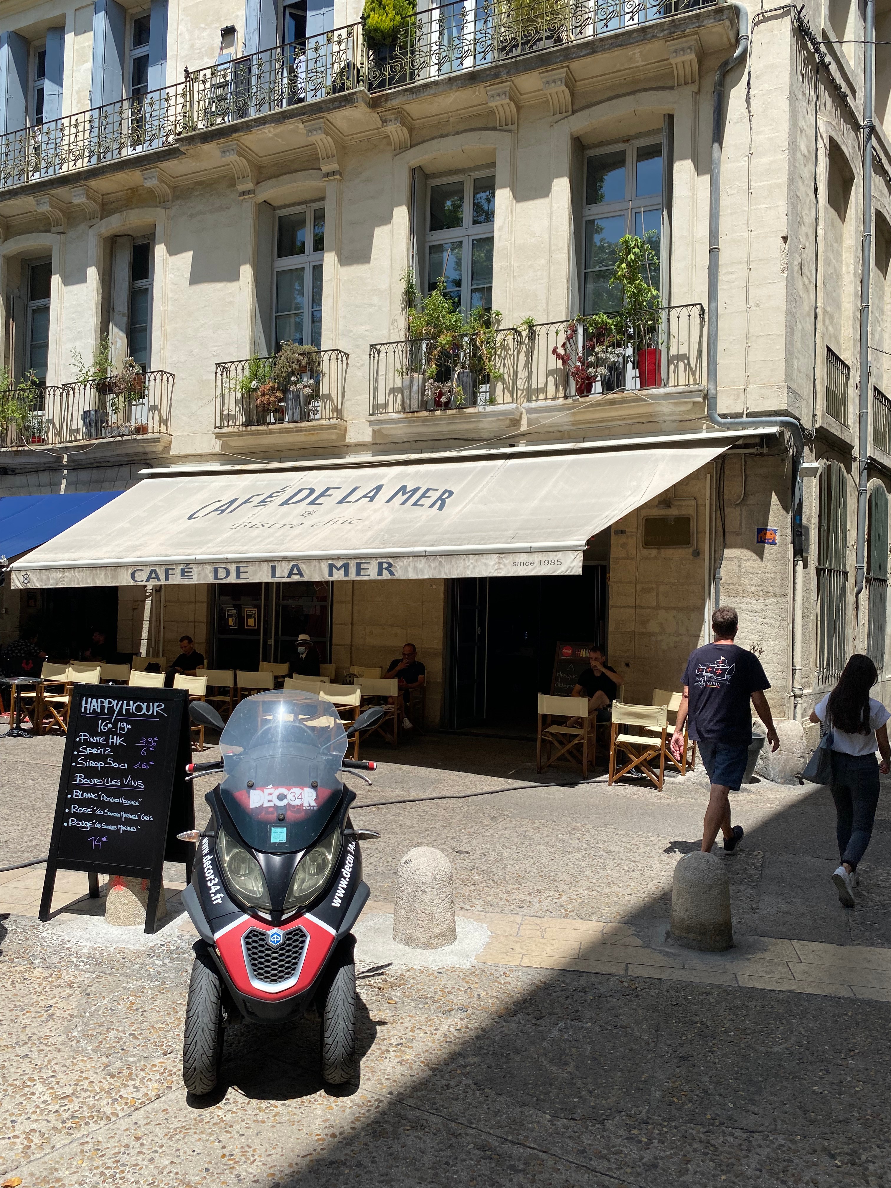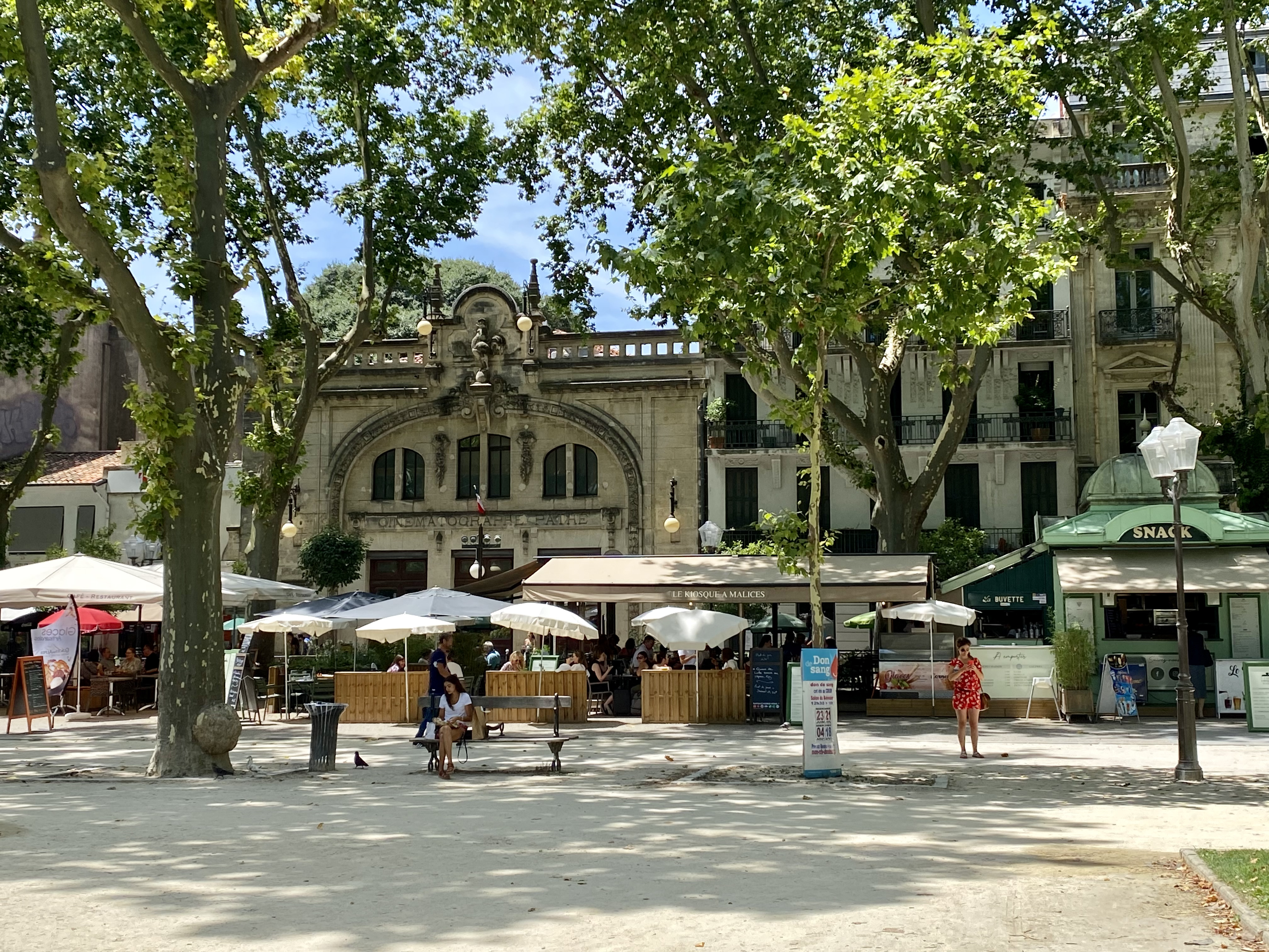 Montpellier can be very hot this time of year, but we were lucky to find a beautiful temperate summer day. The four of us arrived mid-morning in the center of historic Montpellier — with some time to sit at a café and enjoy a fresh beverage. The pleasure was simple: A little time with Jef and Anastasia (who is a charming, intelligent 14-year-old, with a great sense of humor — in three languages!) out at a café in a nice French city. Just watching people go by kept us happy.