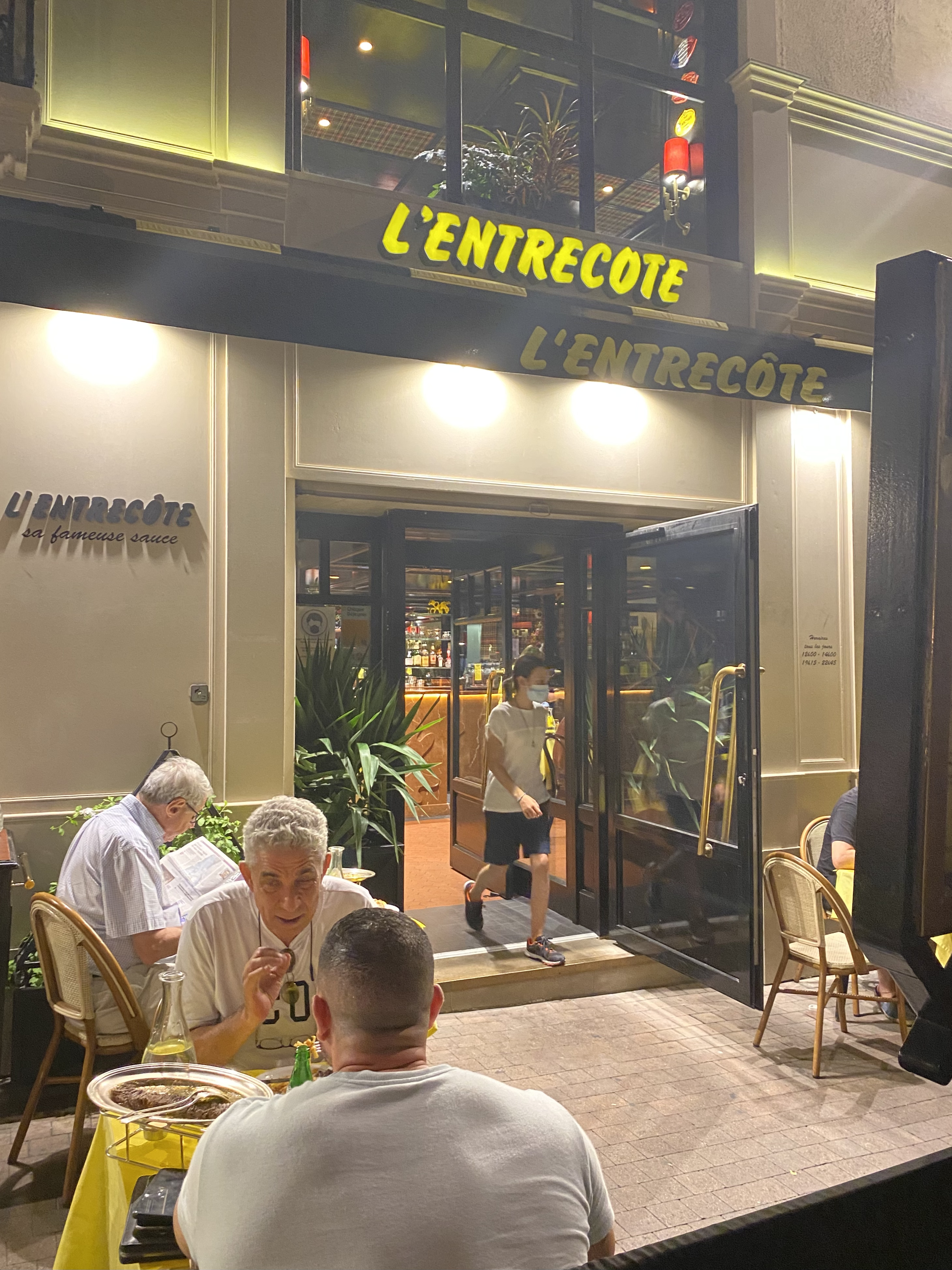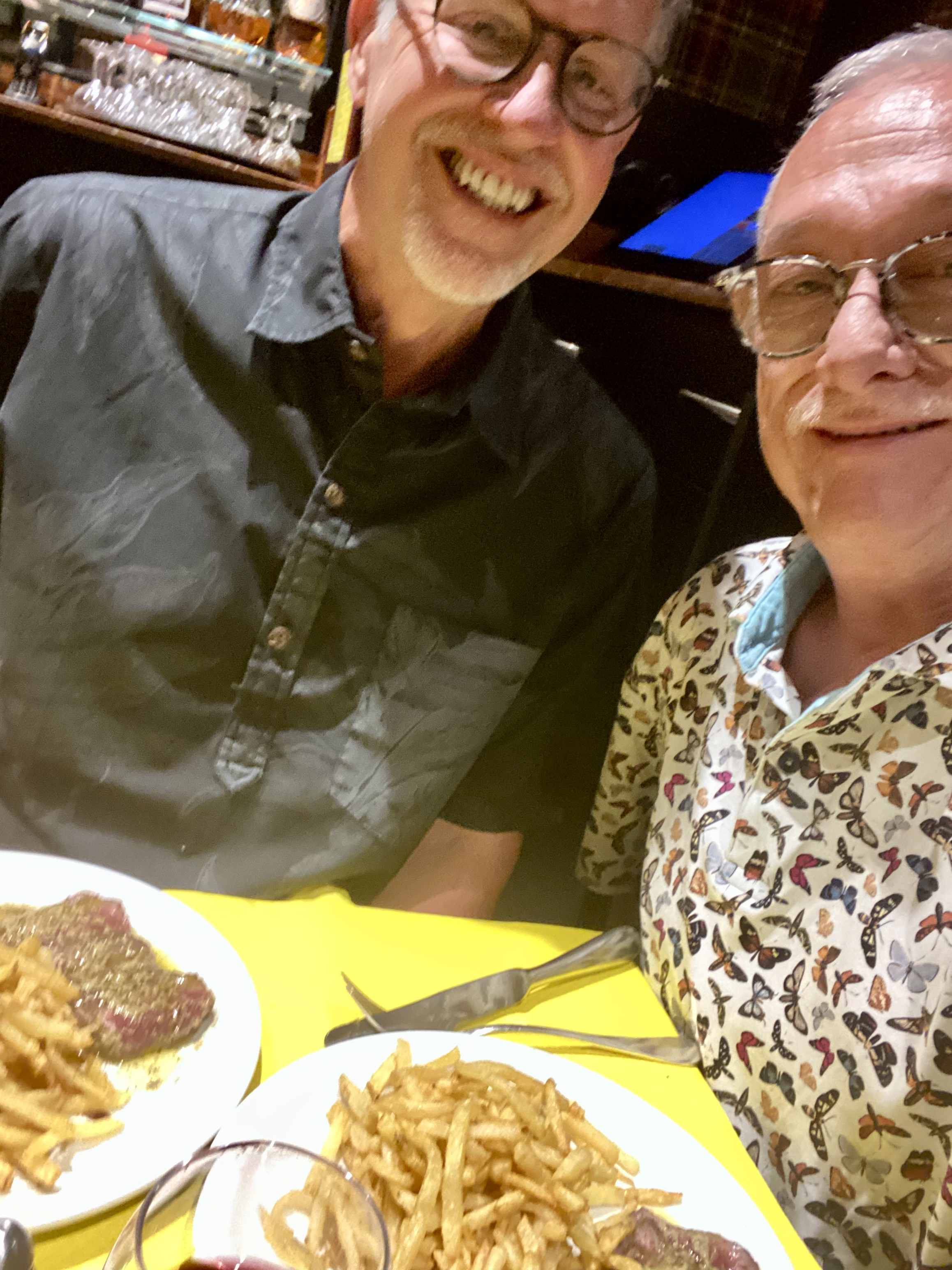 …and back to L’Entrecôte. We had both noticed earlier in the day that the last service in the restaurant was at 10:30 pm. We hadn’t eaten dinner because French dining hours exactly overlap with French performance hours. Hungry, and still obsessed with our favorite steak and frites, we hustled through the esplanade and the Place de la Comédie to the restaurant. Even at 10:15, there was a short line waiting for tables. With evil eyes, we tried to evict the diners who insisted on lingering over their cups of coffee. At 10:27, the hostess showed us to our table. Even this late in the evening, we giddily savored every slice of entrecôte and every hot frite. Admittedly, we both had the weirdest dreams that night.