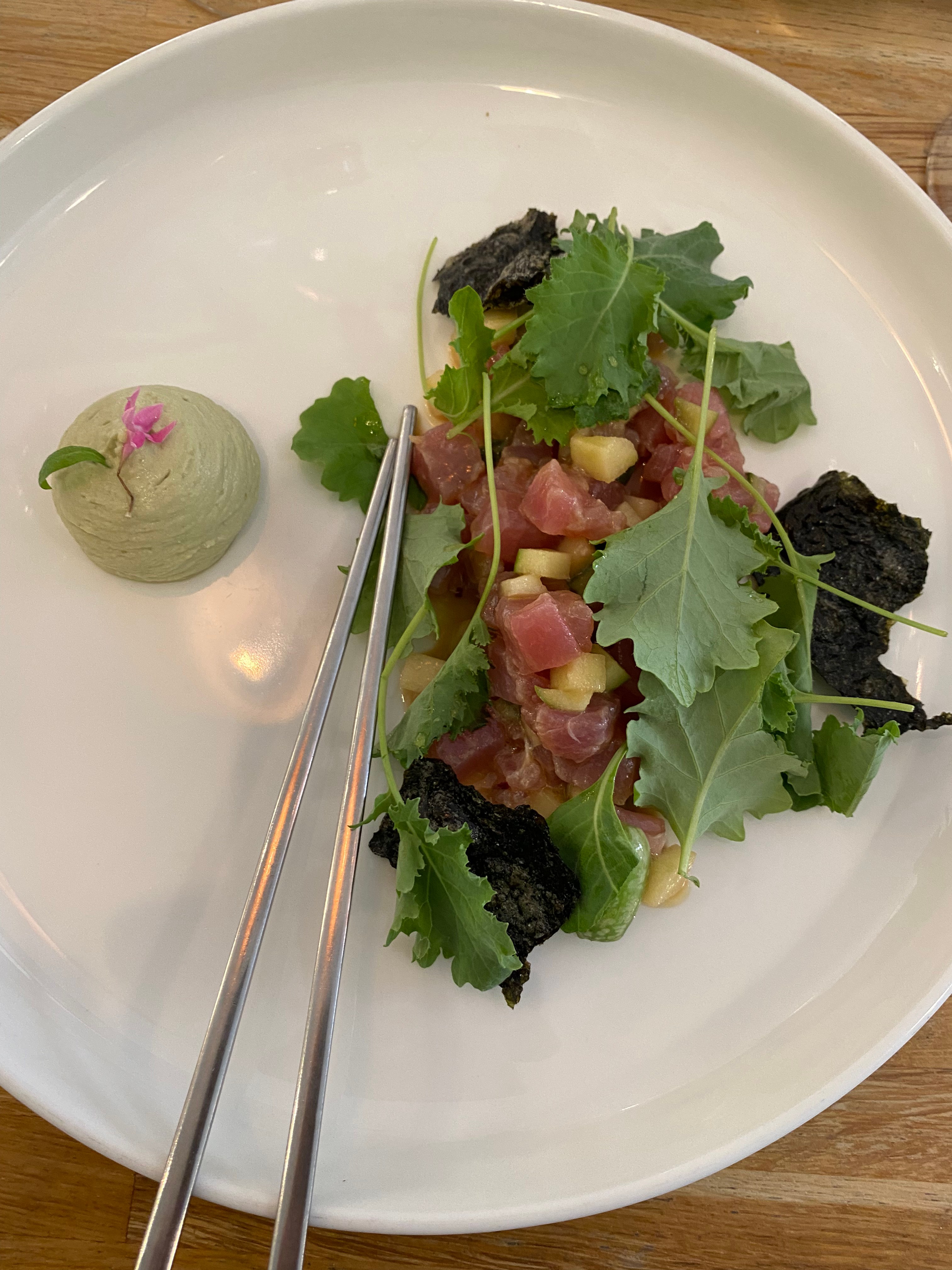 starter of tuna tartare and wasabi cream