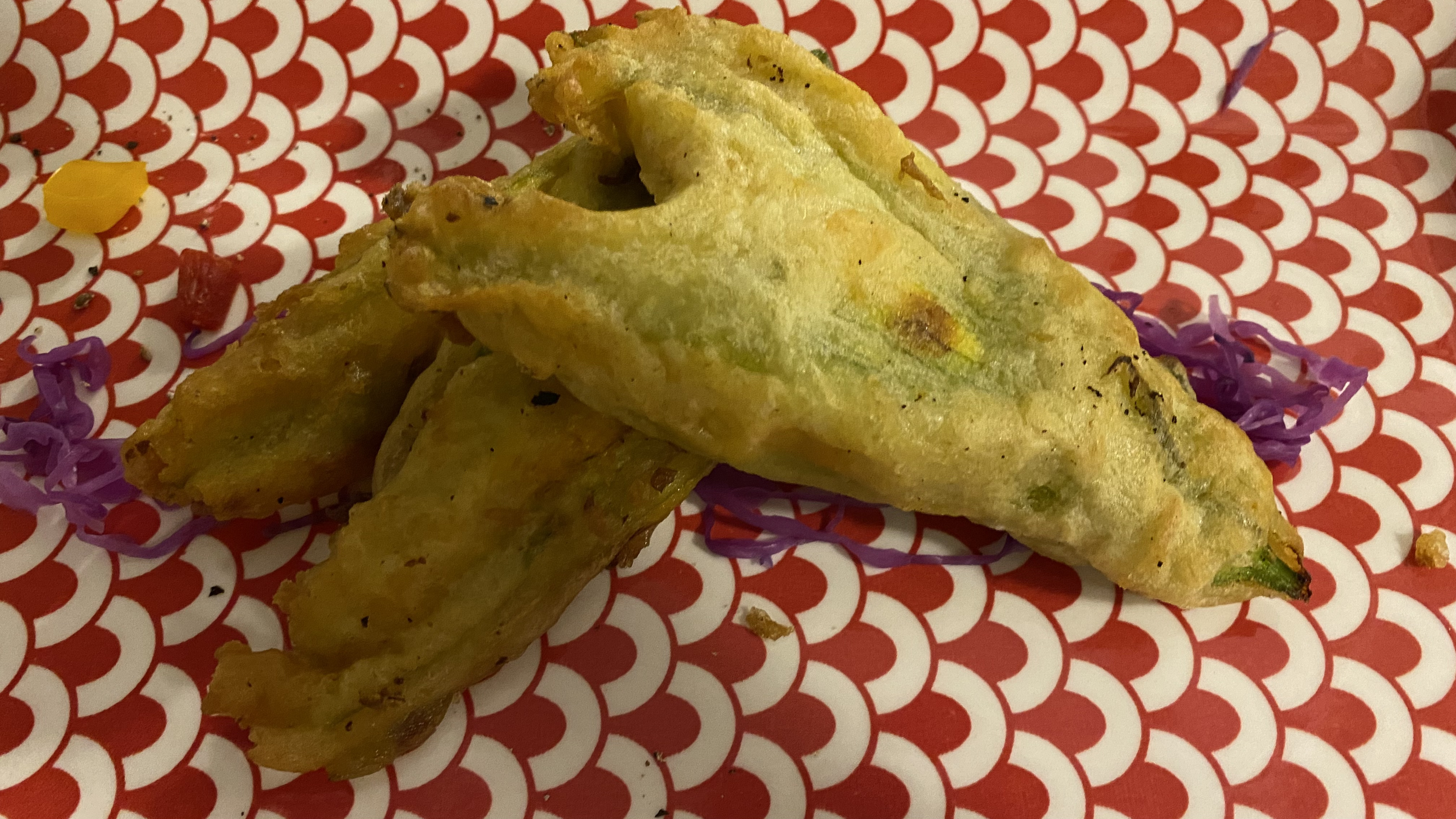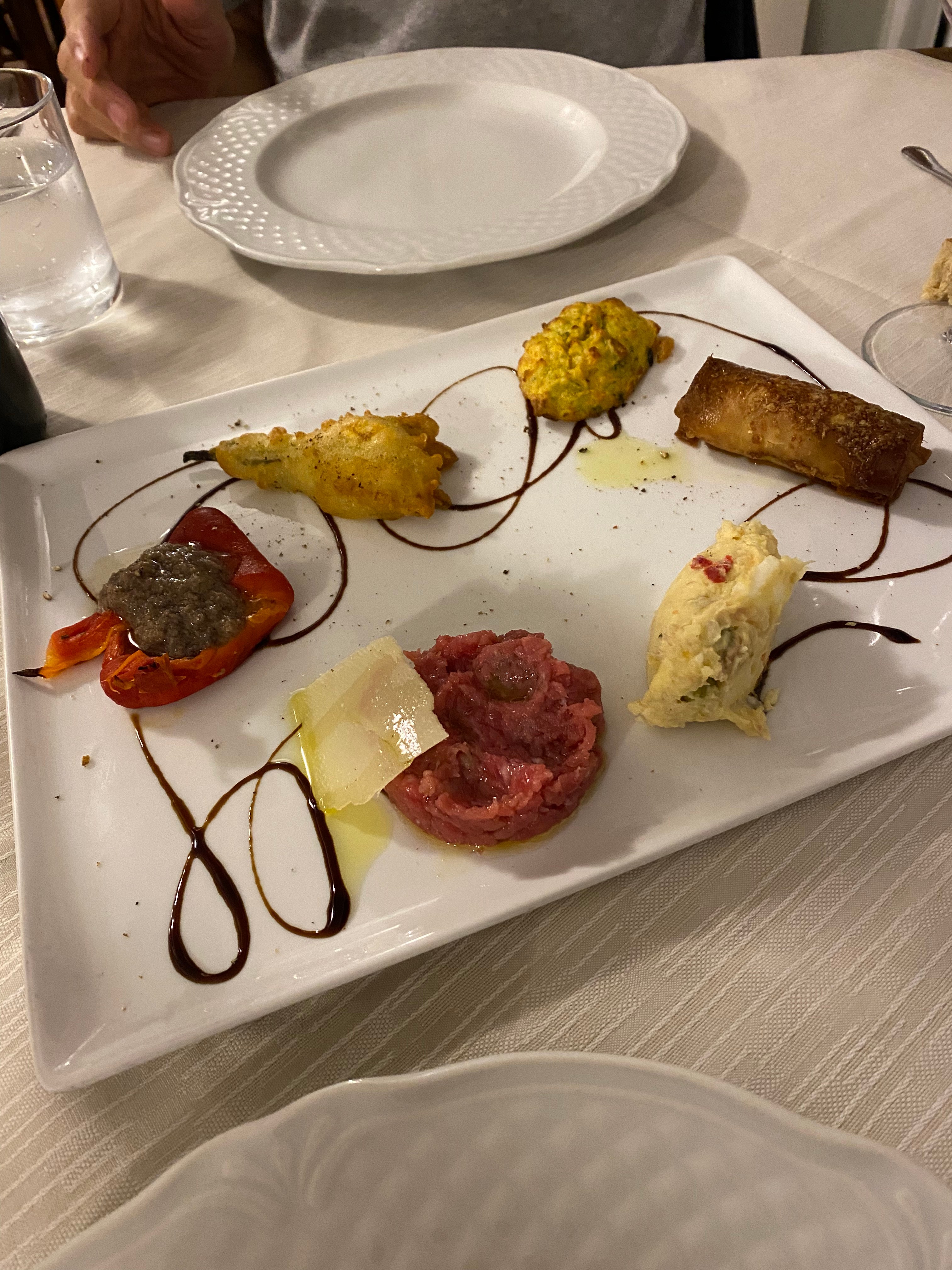 Shared antipasti plate: veal tartare with Parmesan, red pepper with anchovy, flan with pesto and cheese, fried zucchini blossom stuffed with cheese, fried pastry roll with meat, herb omelette