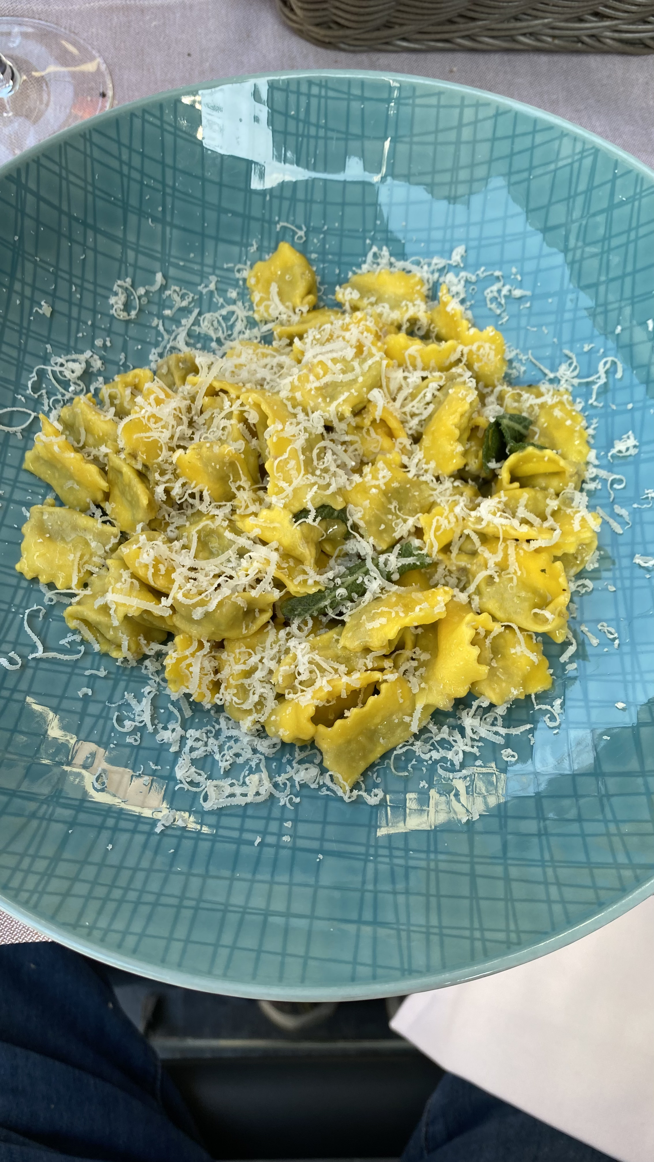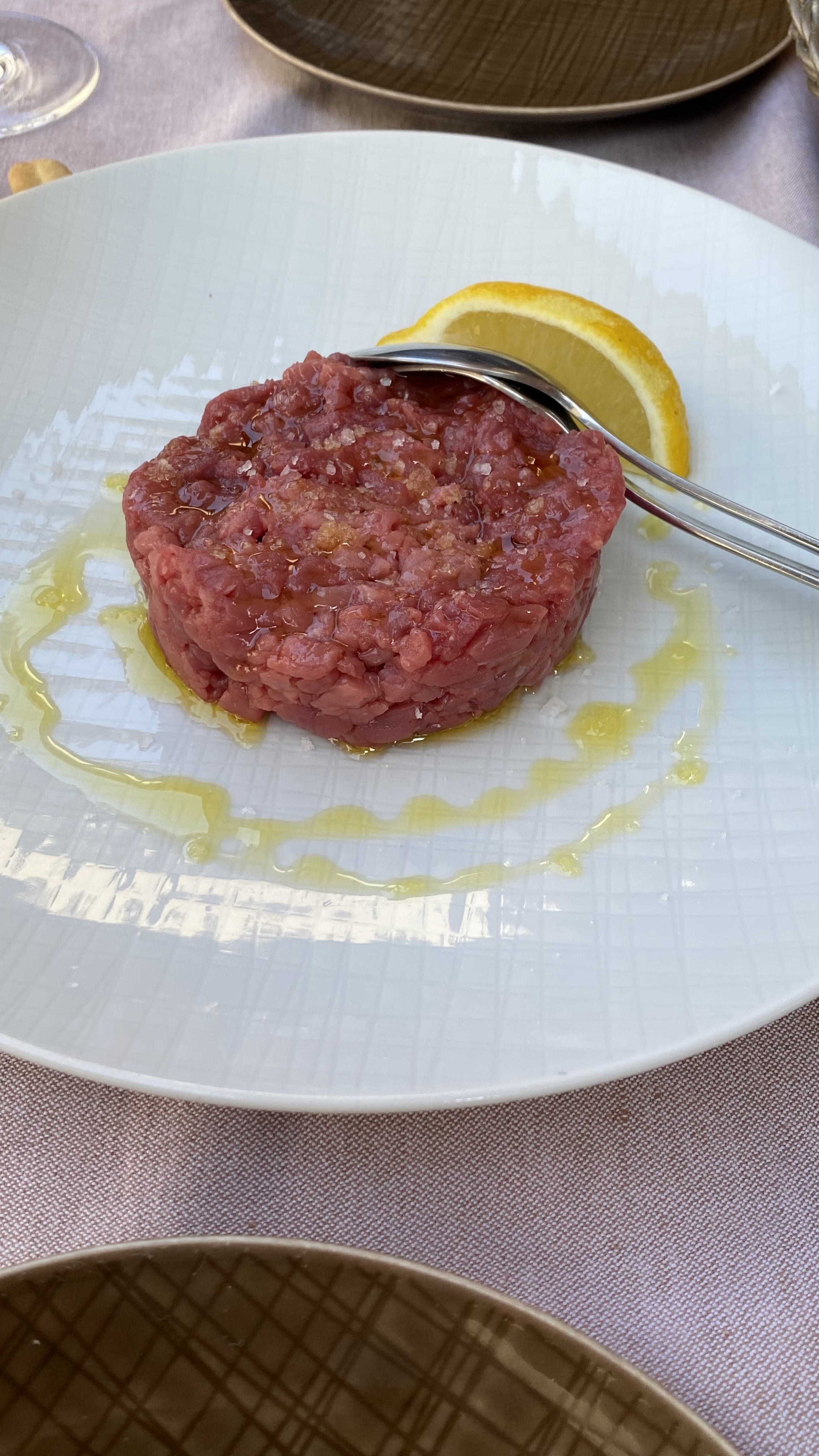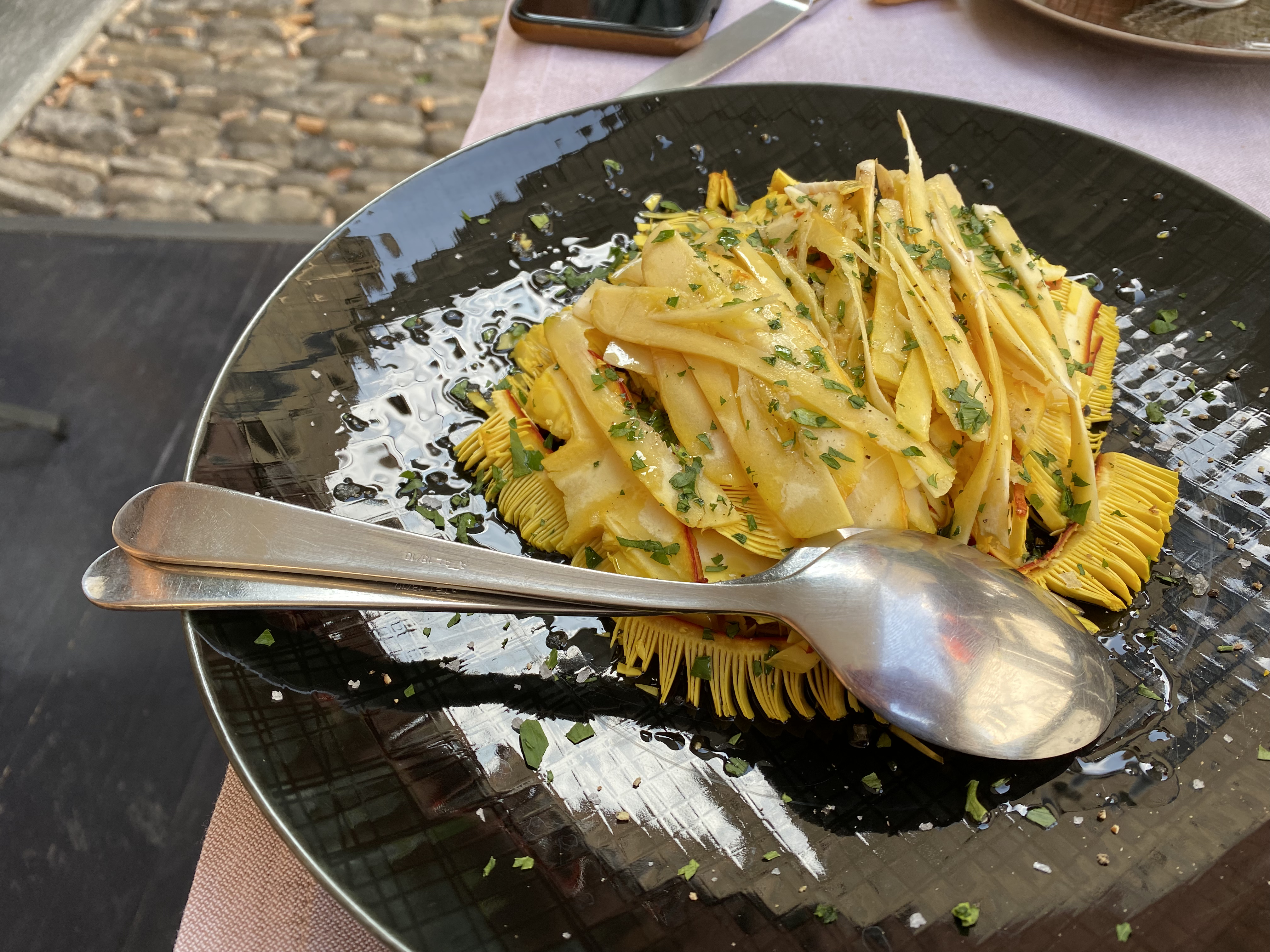 Osteria L’Oca Giuliva is our favorite stop in this area. It’s another Marco recommendation from our first visit. Down an unassuming street in the unassuming village, just before the disused train station, a little sign with a goose on it hints at the place. On our first trip, we enjoyed beautiful white truffles with veal tartare, pasta with butter, and a local melted cheese dish. Another revelation was absolutely delicious steaks. These are from young cows, not quite young enough to be veal. This is Fassona beef, a specialty of the Piemonte.
