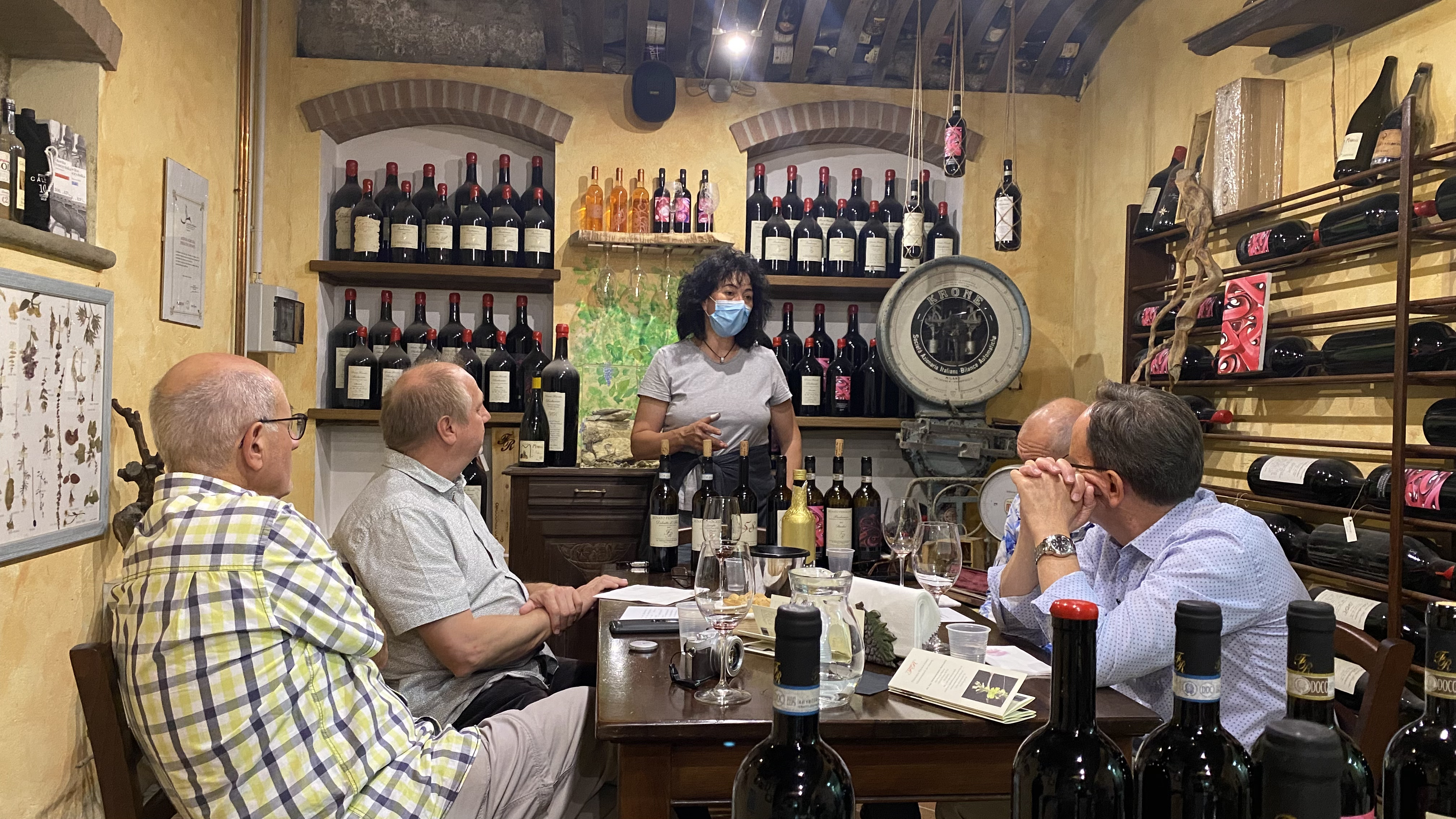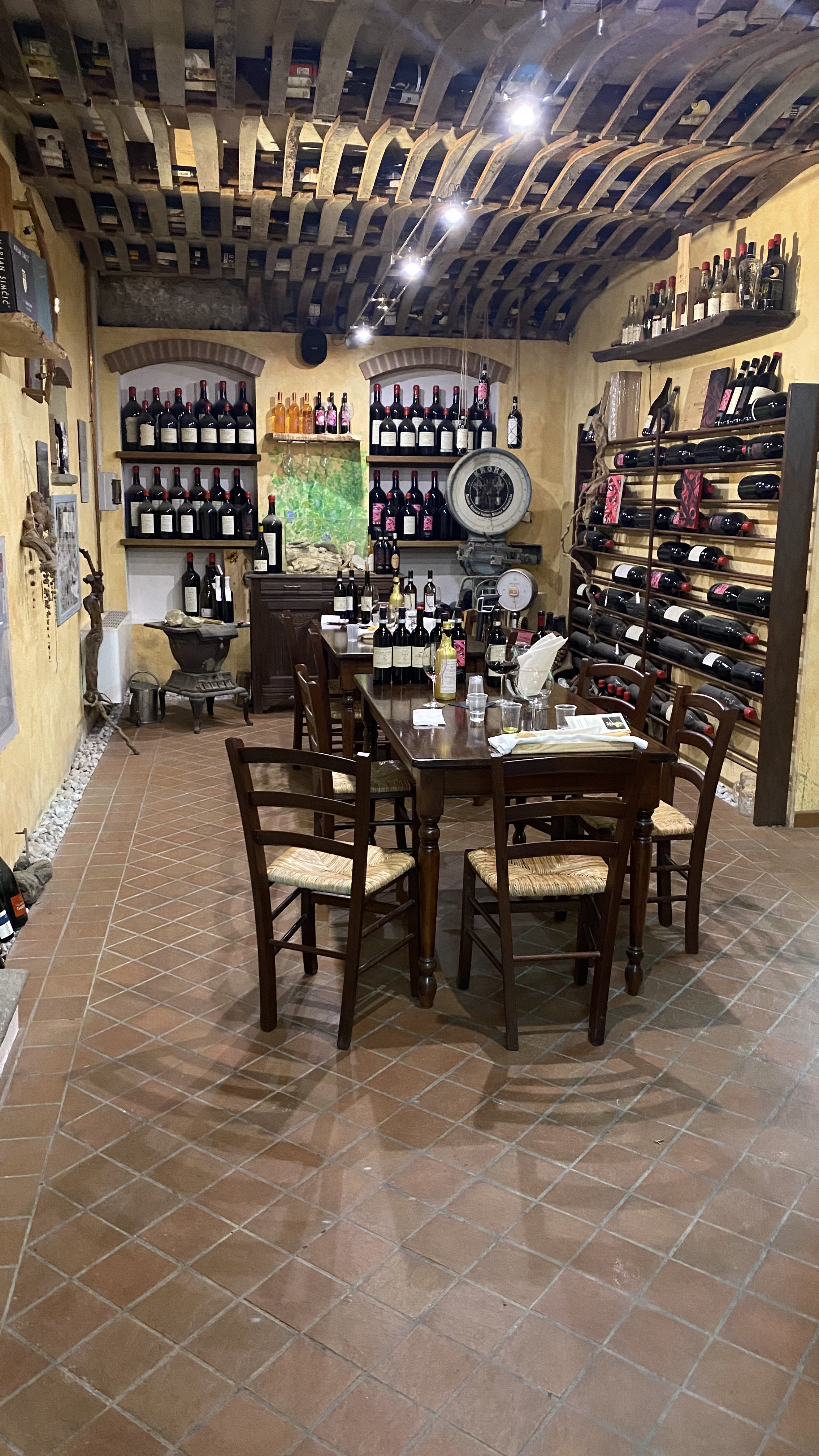 We enjoyed the red wines that we tasted — Barolo and Barbaresco (with our favorite Italian grape, the nebbiolo), and Barbera. This tasting took place before lunch. We find it a challenge to assess a wine so quickly, and without accompanying food, especially in the morning. Here at Pira, we found the wines we tasted a bit wan, not yet bursting with the aromas and tastes that we enjoy. A possible reason is that these are new wines; being a relatively small operation, they are able to sell all of each year’s vintage during that year, so we can only buy the latest wines. Which asks us to hold the wines in reserve for a few years to let them mature. Now, we are both too impatient and not sophisticated enough to get into holding wines in reserve. And we don’t have a cellar. But this time, we decided to buy a few bottles of their Barolo, with the intention of setting them aside for about five years, to see if they do indeed develop into rich and rewarding wines. Perhaps a blog post about this in 2026?