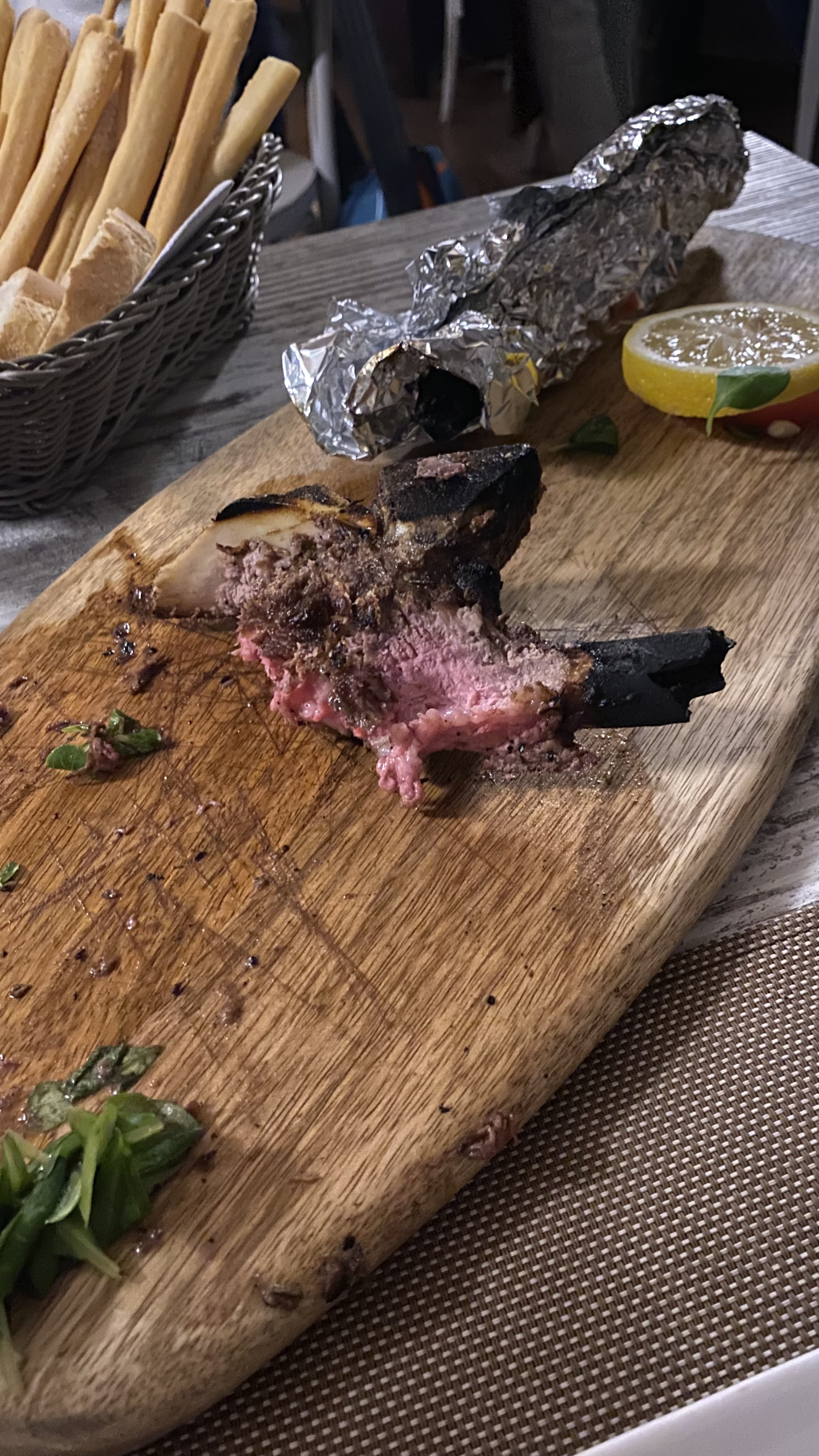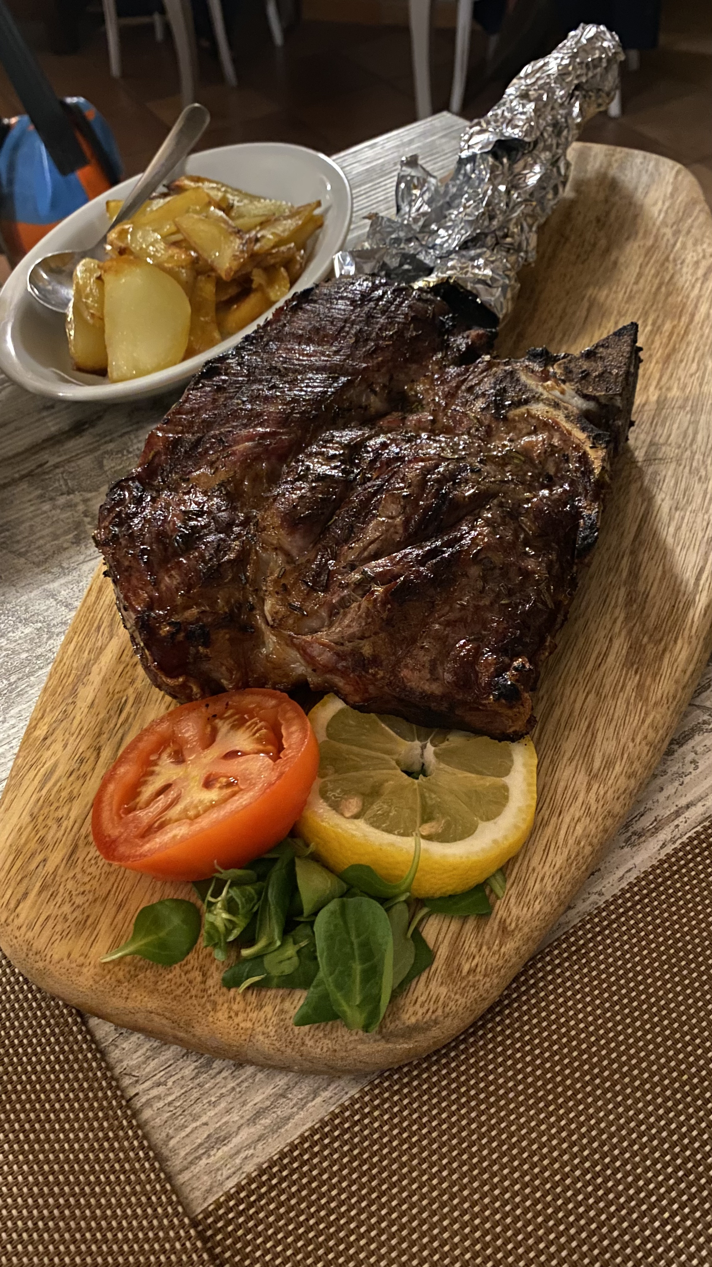 Beef: Tomahawk Fassone. Immense, yes; but for two, of course