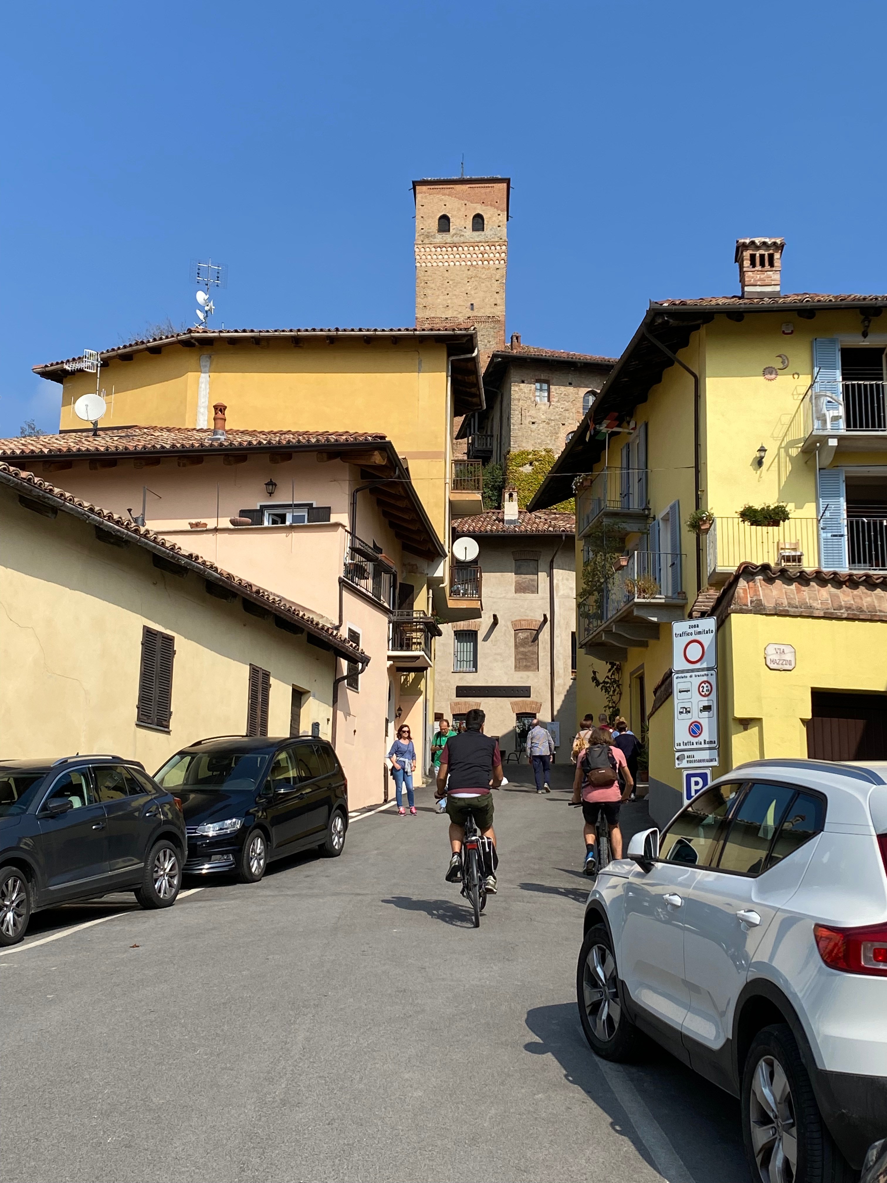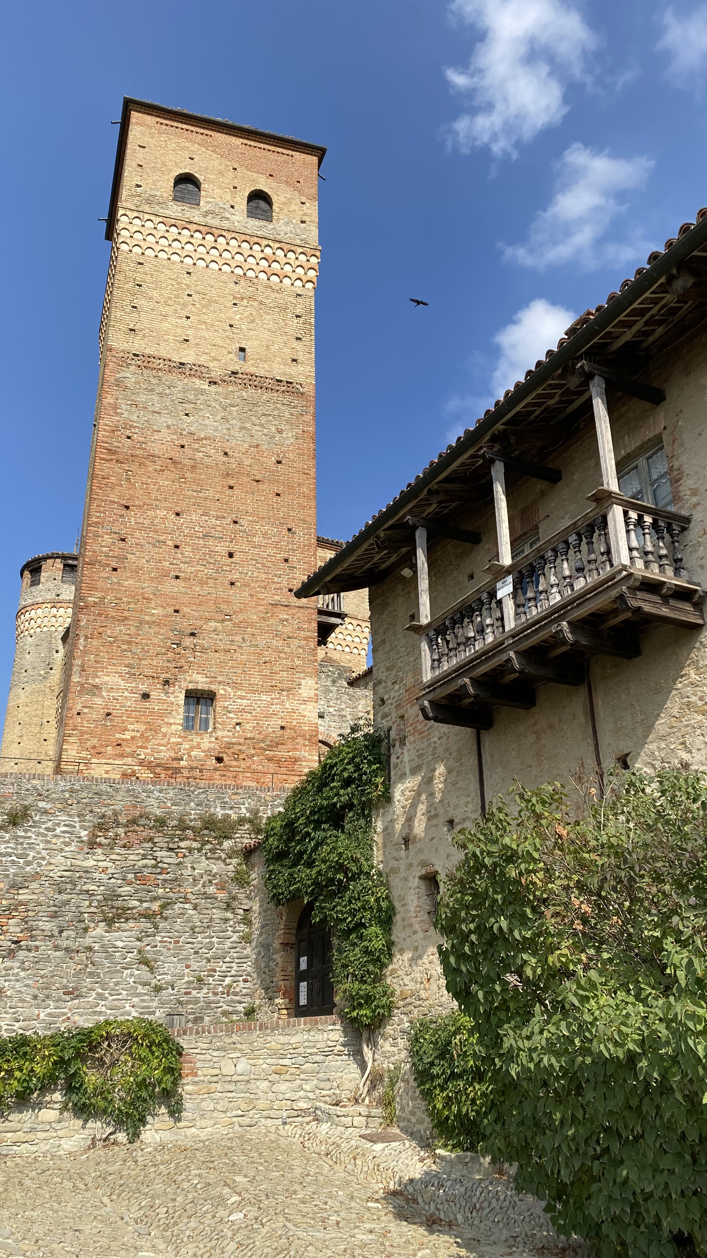 The village of Serralunga sits atop a conical hill. A single hoop of a street rings the hill. From the top of the hill, the castle’s sheer walls of brick and stone rise almost with disdain. Not put off, we climbed the hill to see what’s what up there.