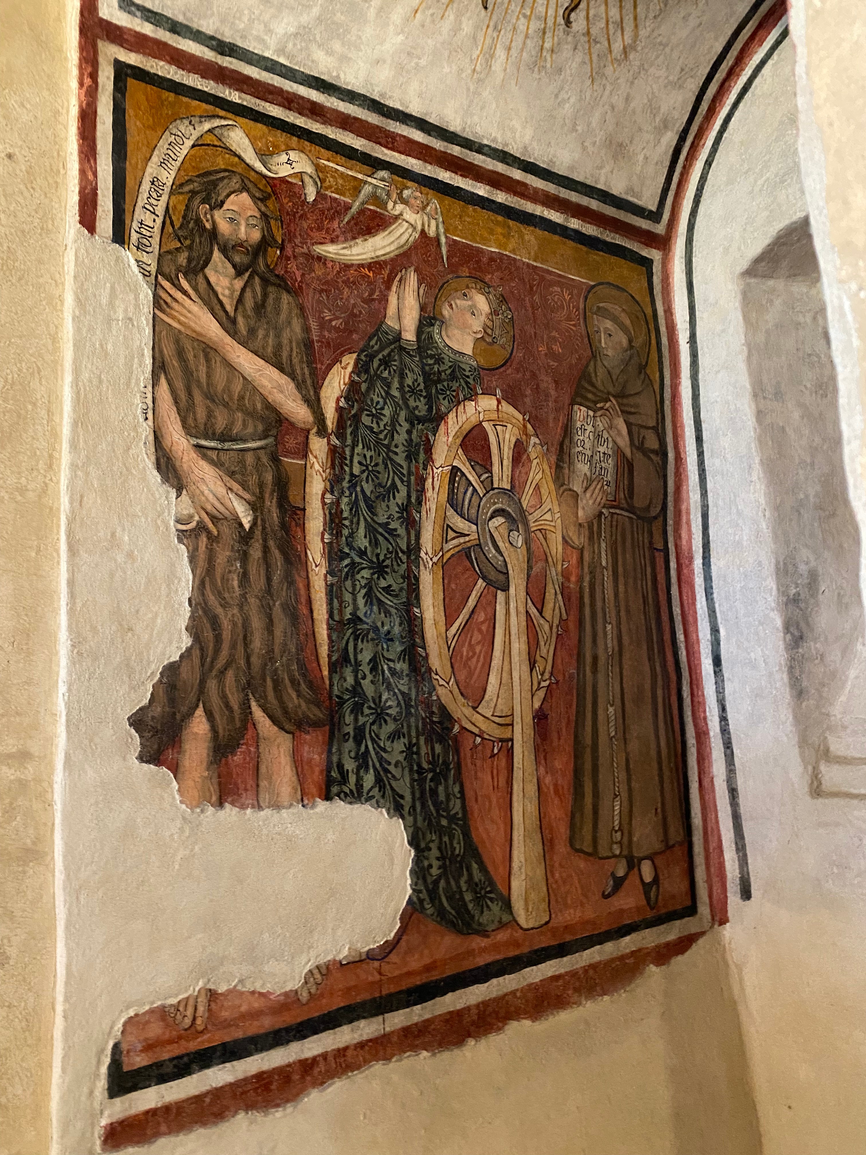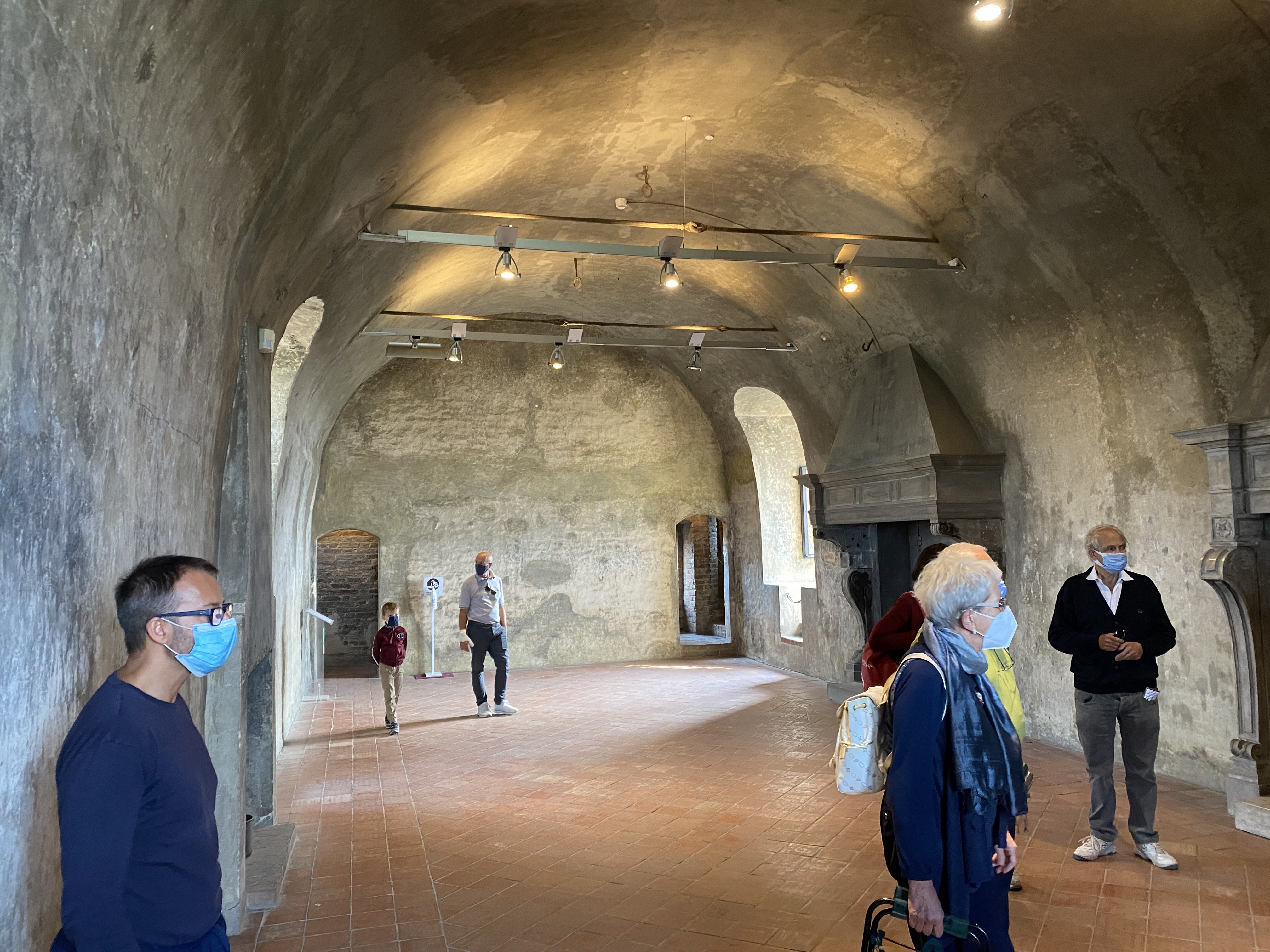 The ample area of the palacium at the courtyard level was the seat of public affairs where the lord of the castle administrated justice. The room is characterized with its wooden roof and the small votive chapel with frescoes from the 15th century.