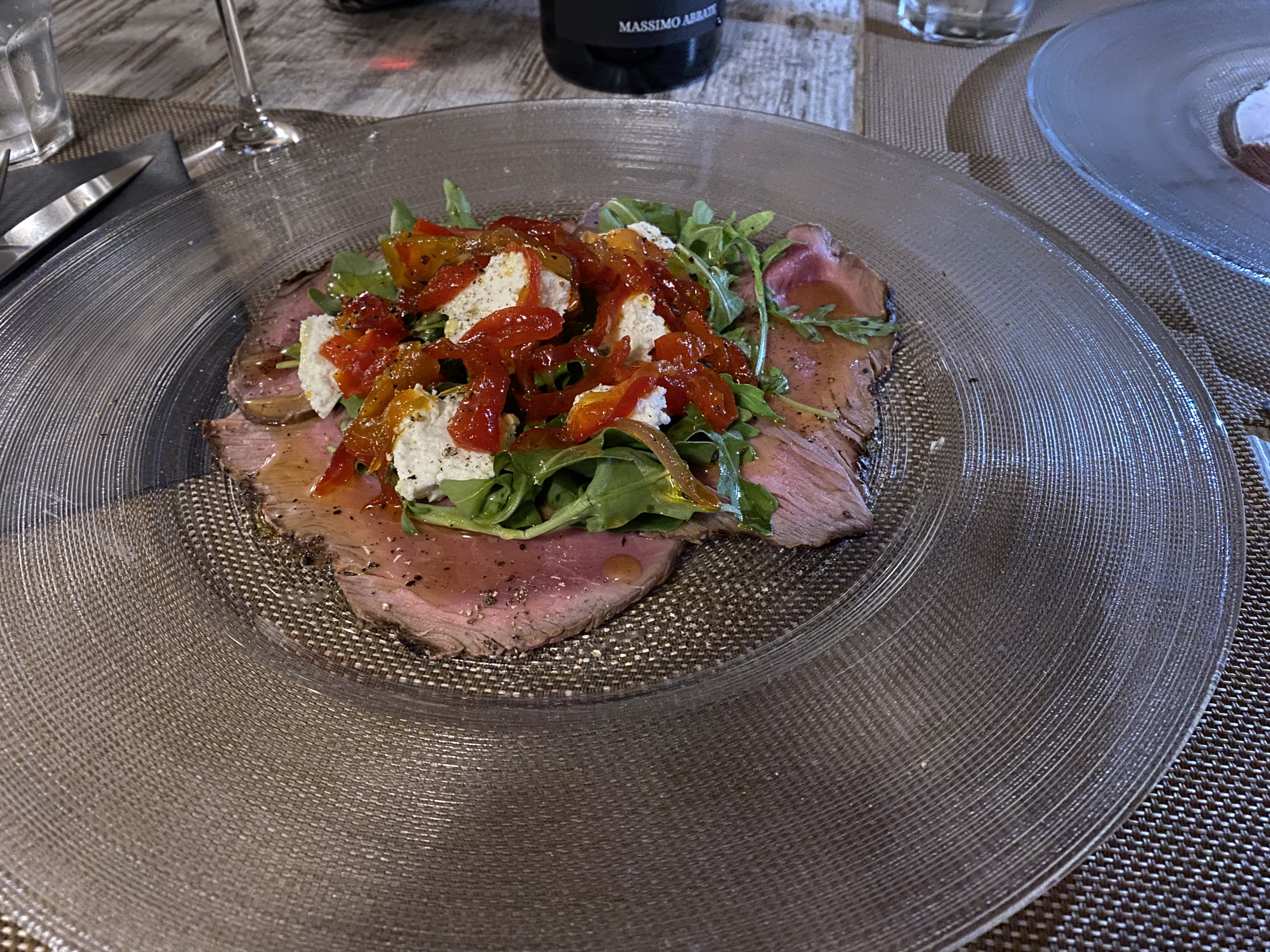 Thin beef, rocket, chèvre, roasted marinated red peppers, caramelized onions