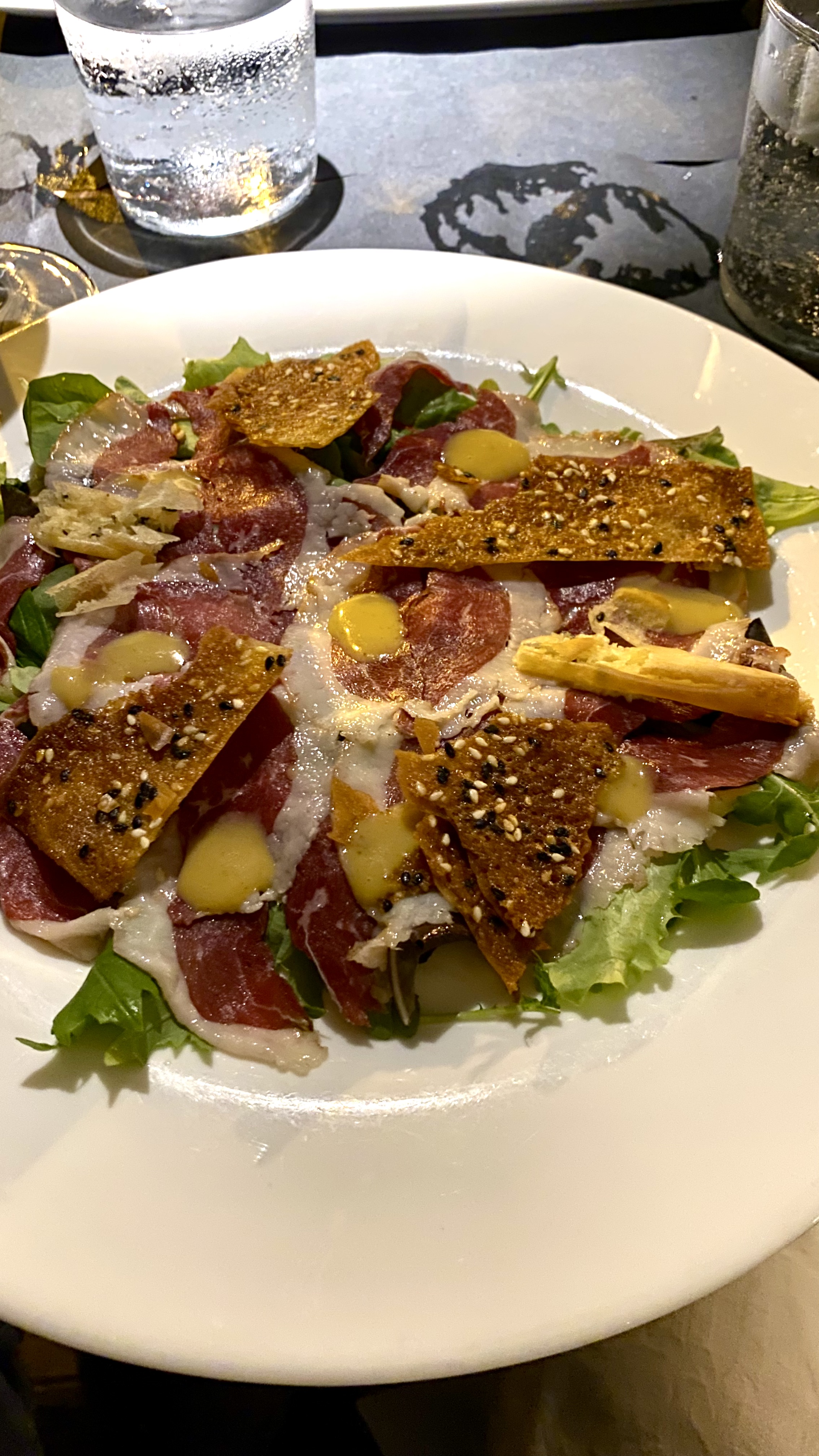Smoked carpaccio of goose, rocket, sesame honey crisps, honey mustard