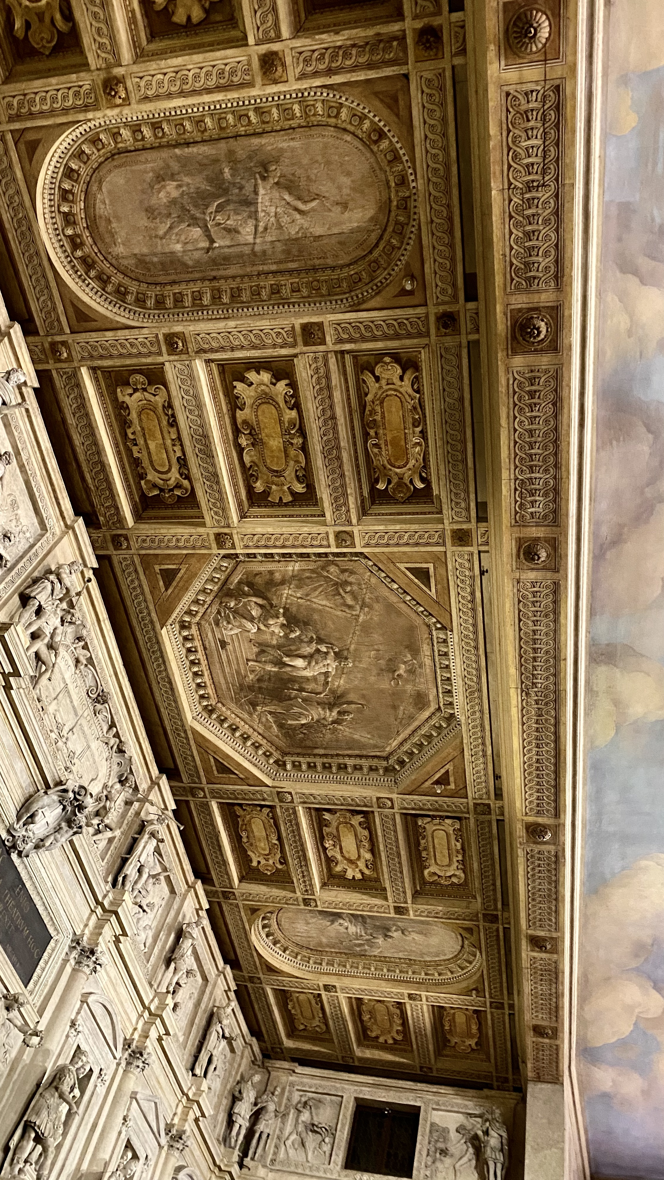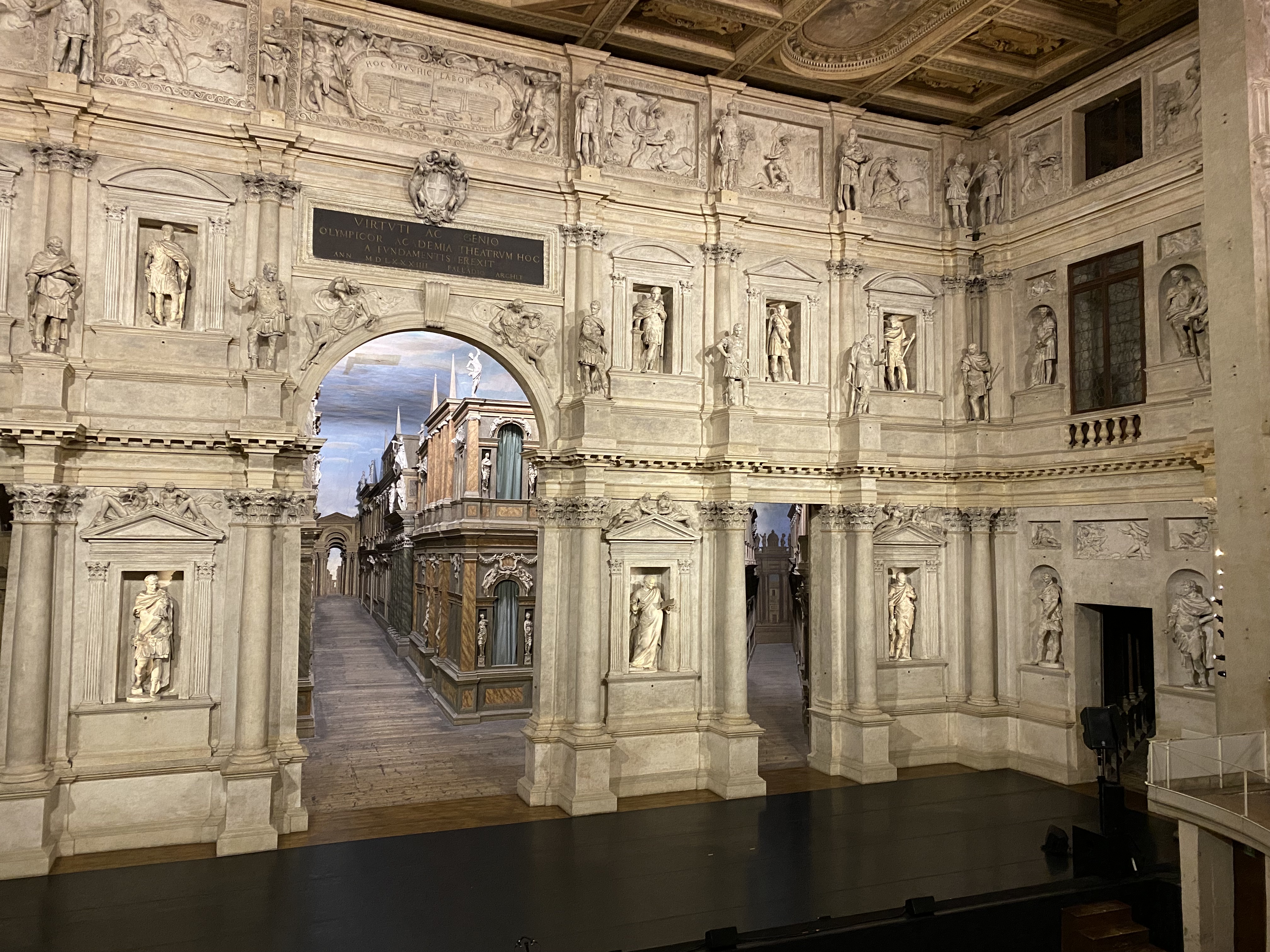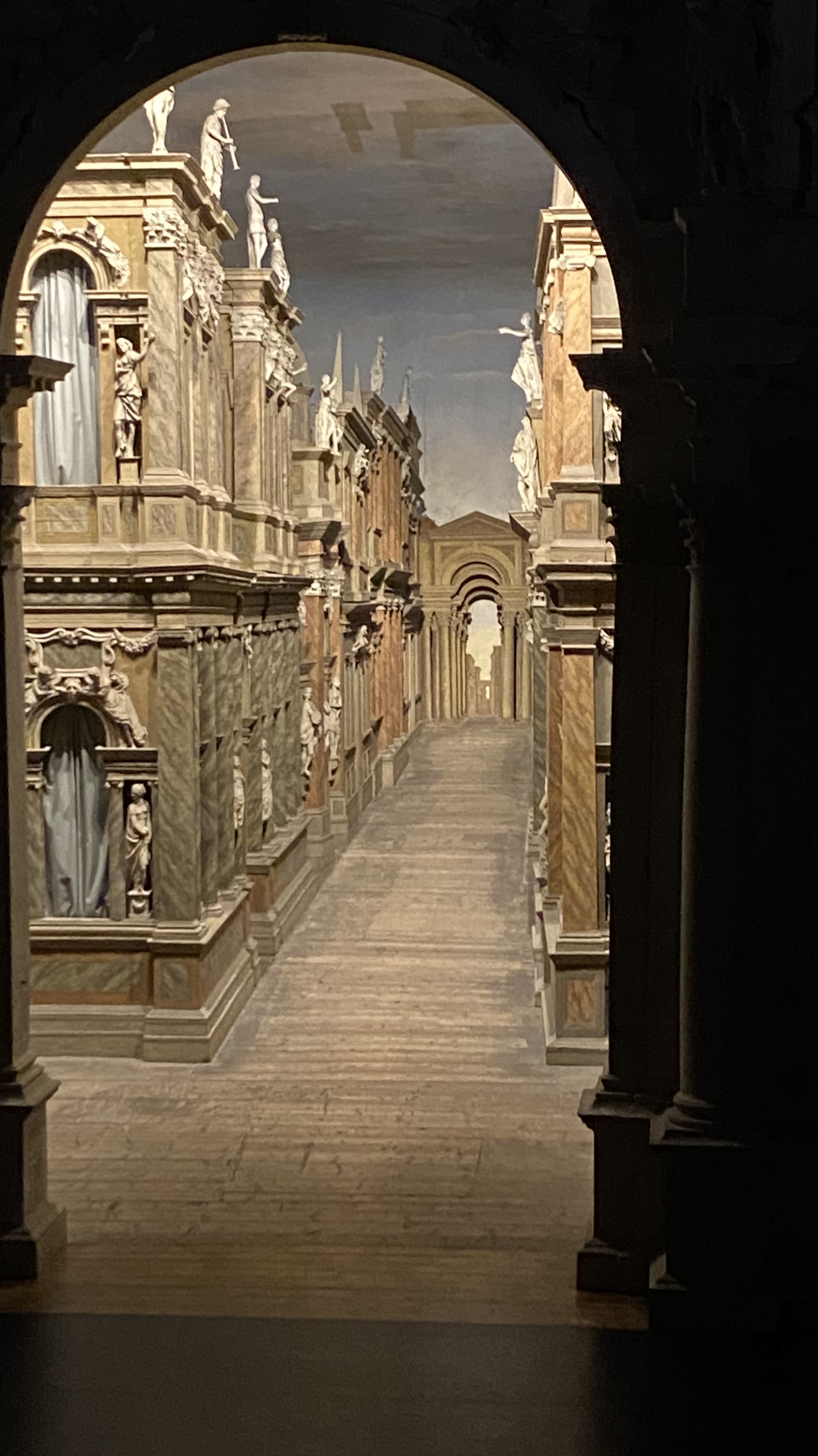 The theater space is beautiful: the semi-circle of the audience galleries, the faux sunset sky, the ranks of sculptures of Verona big-wigs around the curve (Palladio included), and the magical 500-year-old wooden stage city scape. We sat there for quite a while.