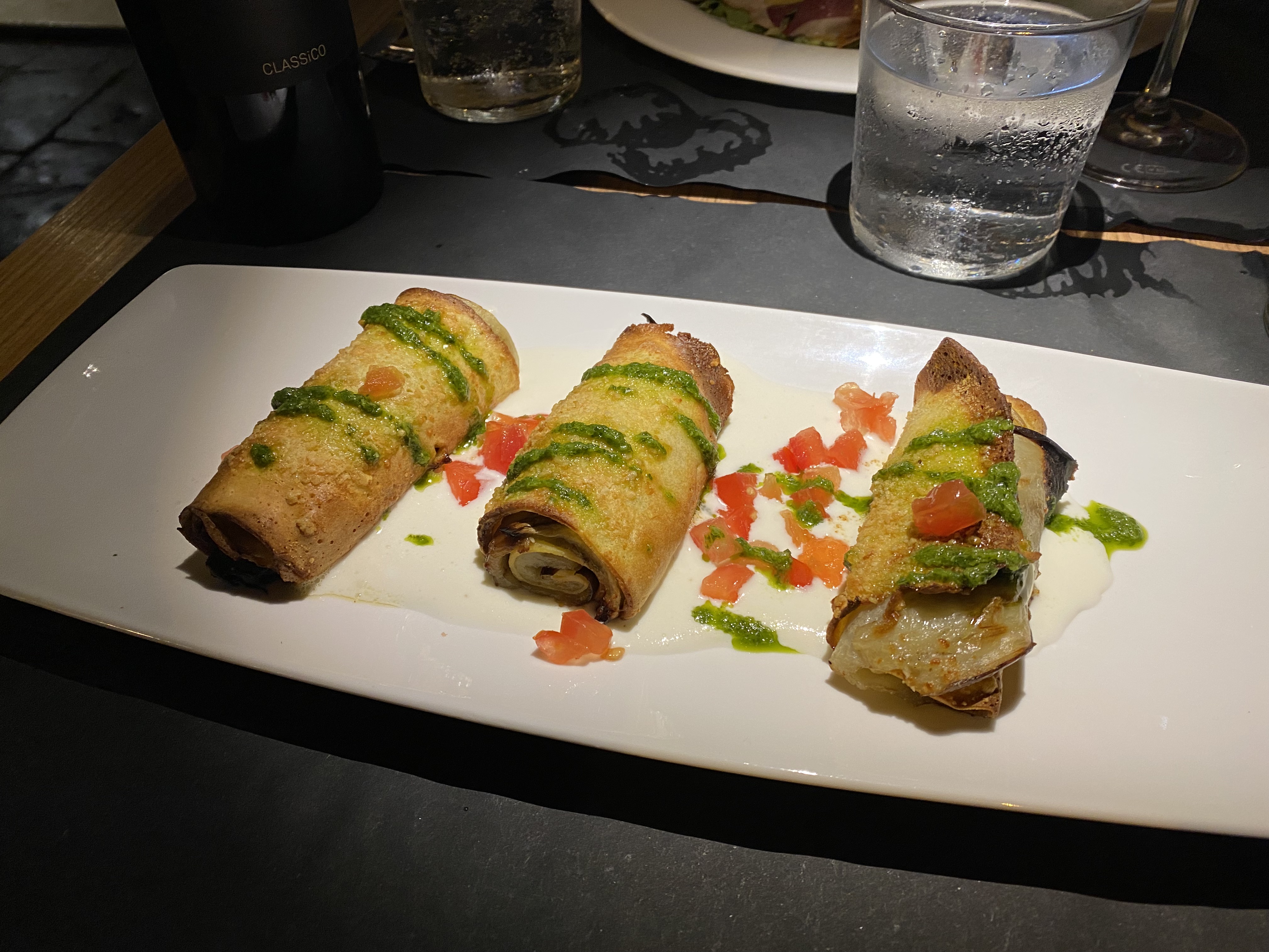 Aubergine crêpe with buffalo mozzarella, tomato, basil: rolled, fried with Parmesan cheese