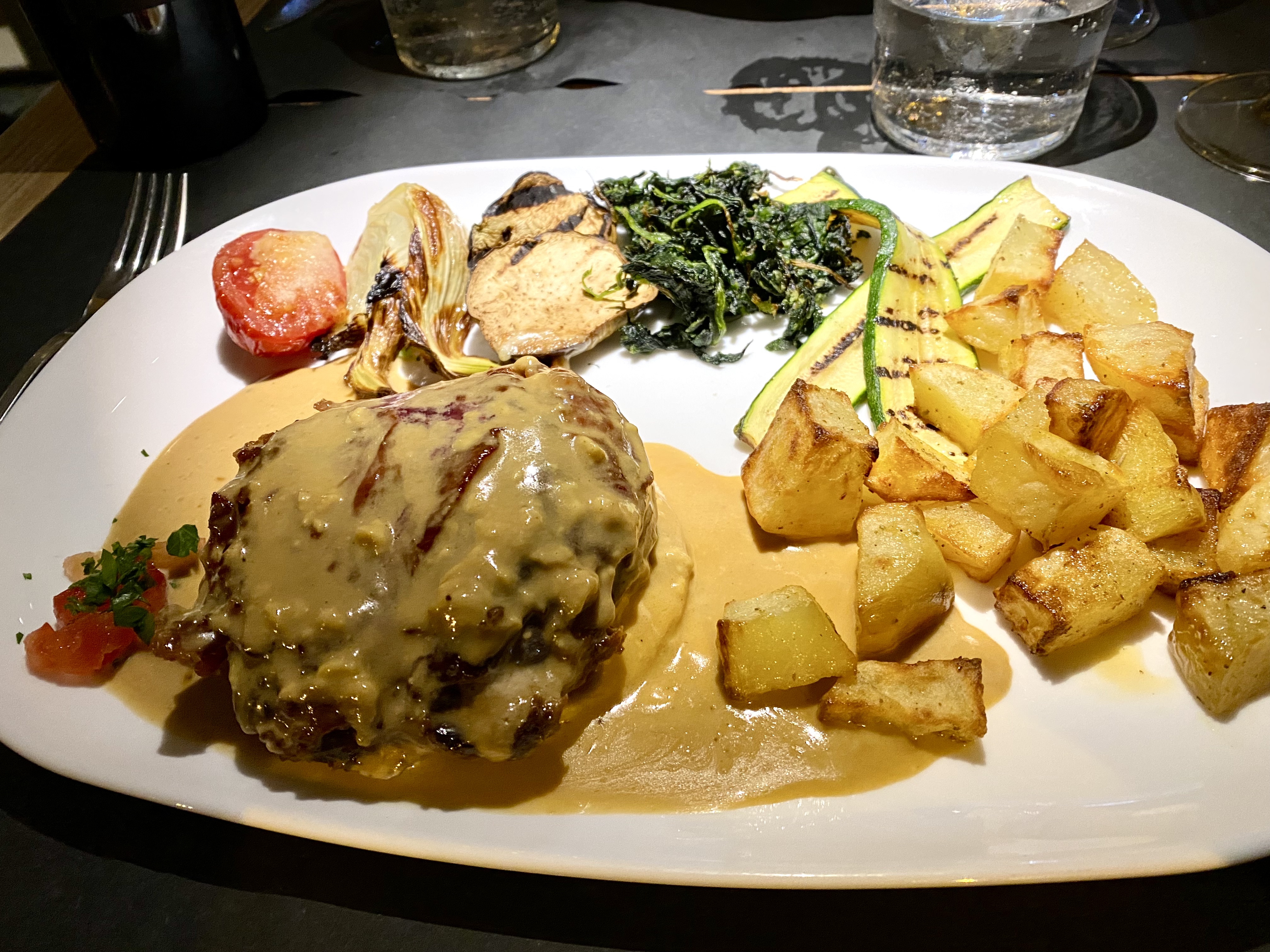 We’d arrived in Vicenza late in a Monday afternoon and just as the sky opened up. Most restaurants are closed on Mondays. But, fortunately, the woman at the front desk of our little hotel made a reservation for us at a restaurant right across the street. We weren’t particular about this night’s restaurant, as long as it wasn’t a long walk away in the rain. By the time we headed out for dinner, the rain had let up and the air was comfortably cool. We chose a table outside under the canopy in the nice night air. We discovered that the menu was full of international influences, not just standard pasta and meat dishes. We expected much less since this was a last minute option whose main attribute was proximity. Mike ask as we were eating our main courses, “How many days are we staying here? I want to come back!” Alas, just this evening. So we made sure to order desserts too.