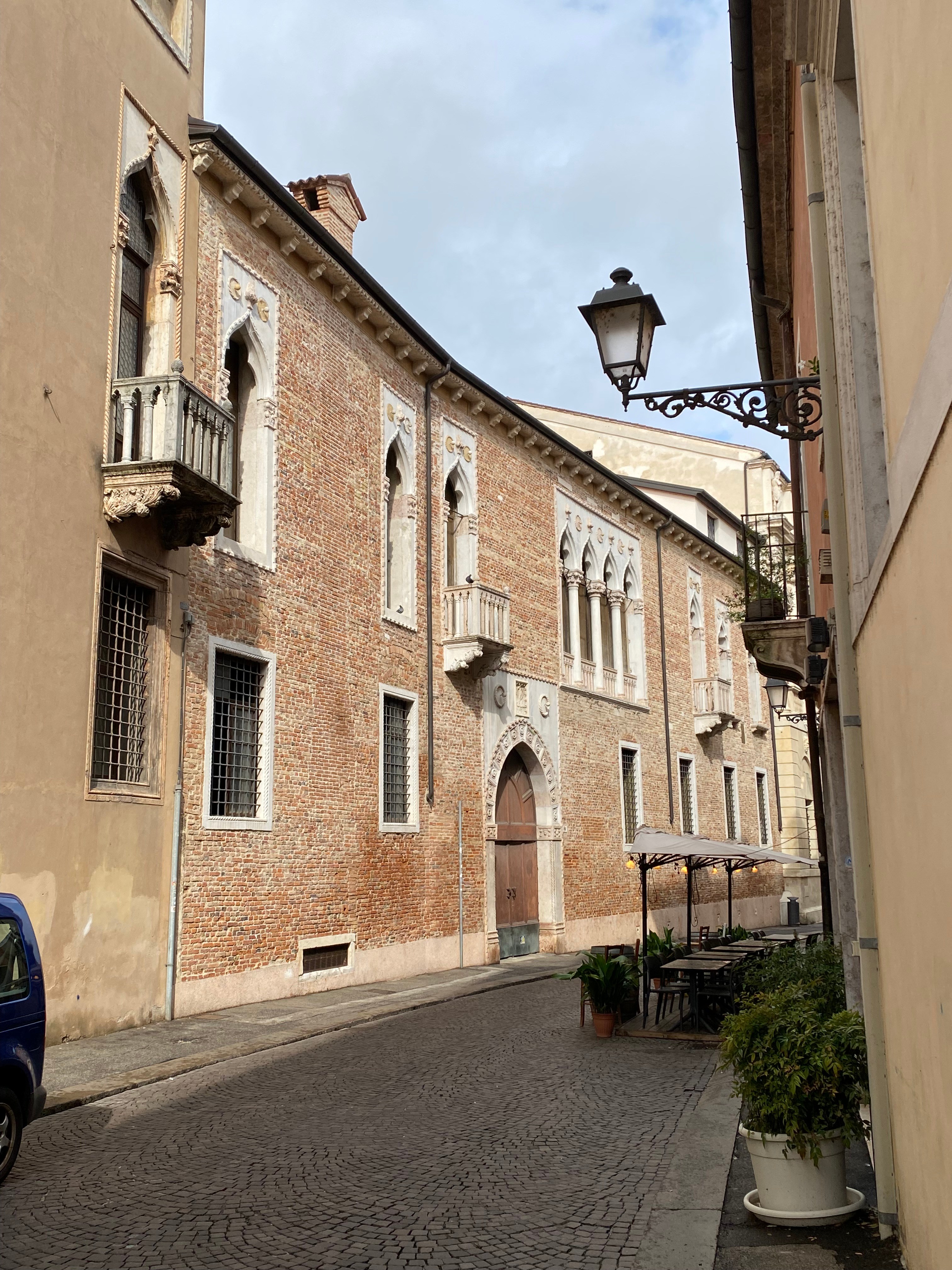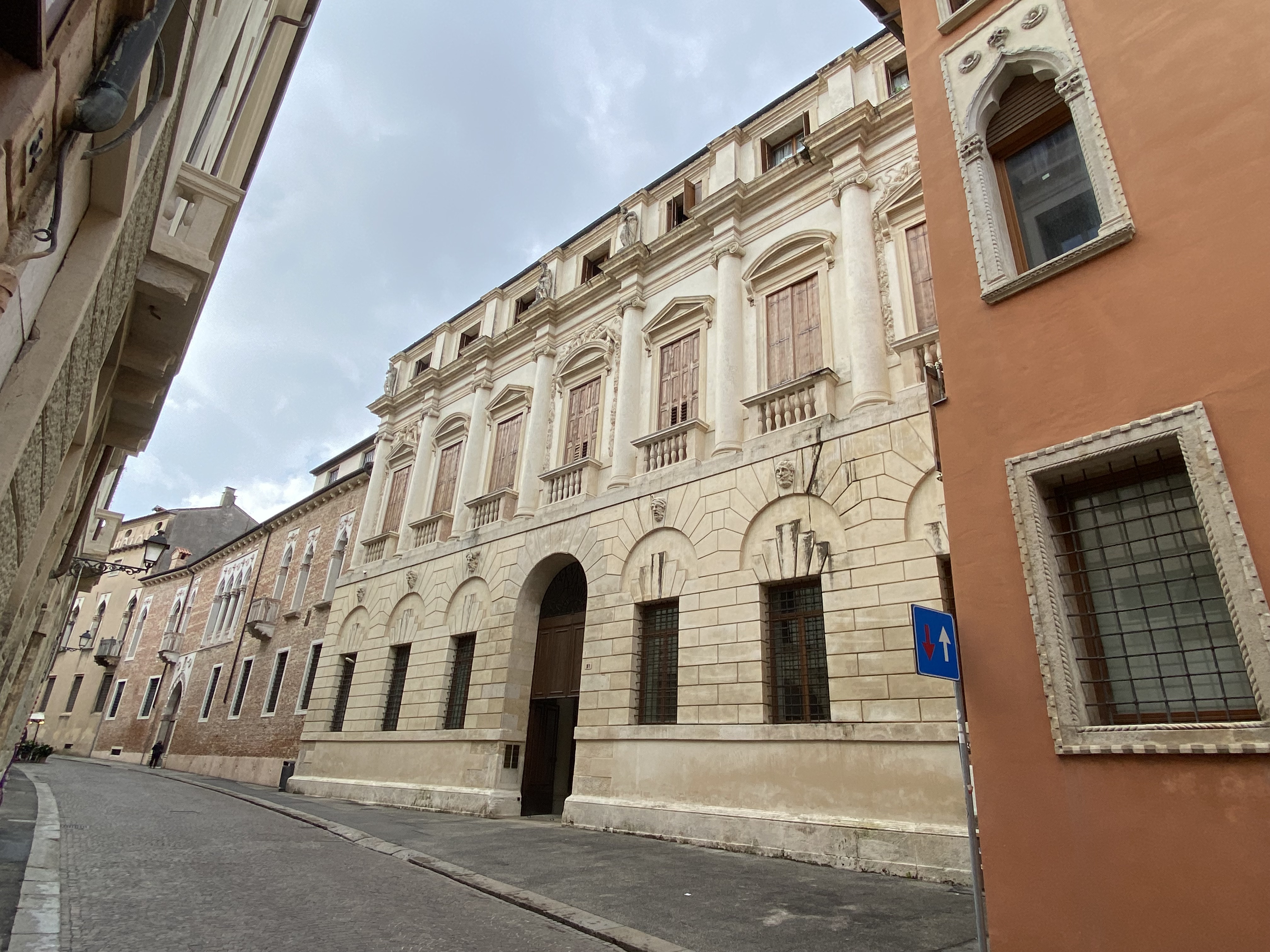 But we wanted to stroll through the historic center of the city. The tourist office at the Teatro Olimpico provided a map with a Palladio-themed walking route. Many of the buildings on the route were palaces of important patrons. Their serious classical details stand out amid their medieval and obviously Venetian neighbors (see the pointed and scalloped arches).