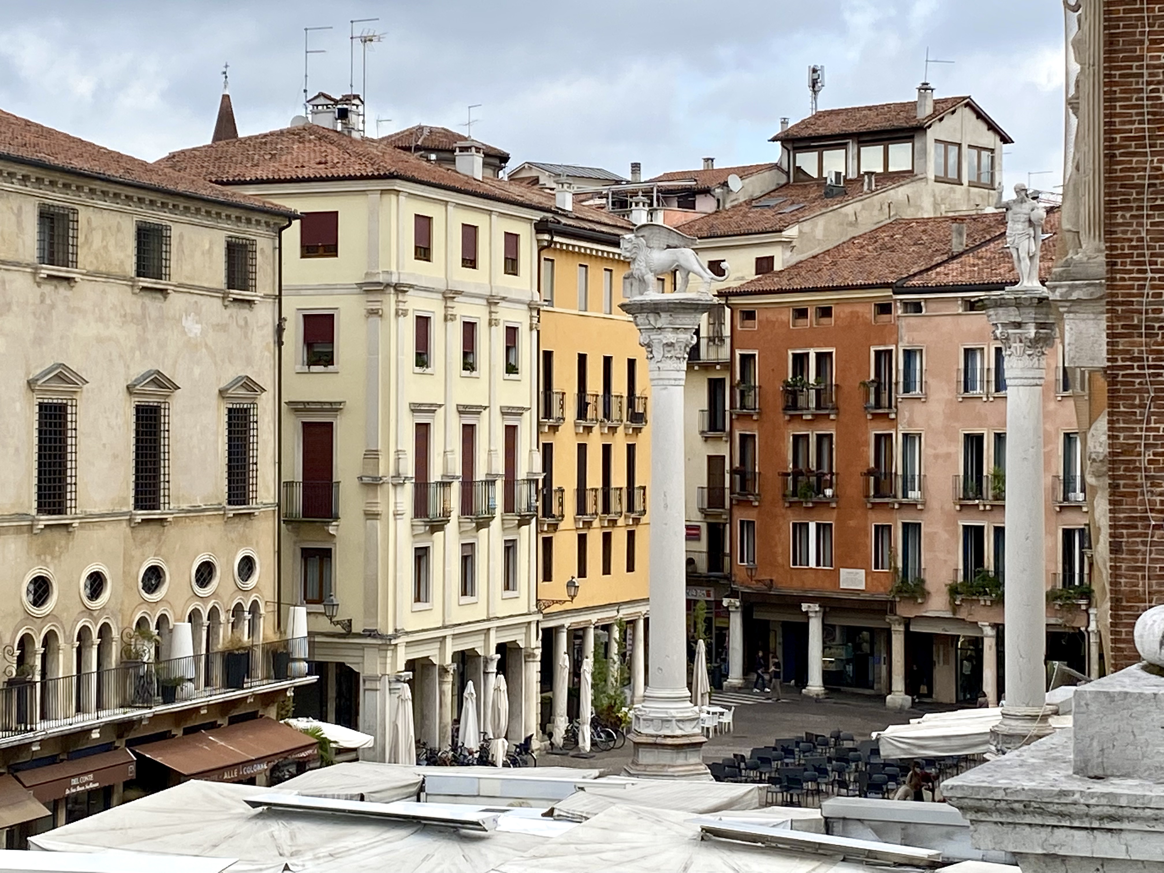 Two statues atop grand columns: one from 1464 with the totem of the Venetian Republic, the winged lion of St. Mark; the other from 1640 with a statue of Christ the Redeemer to honor Vicenza.