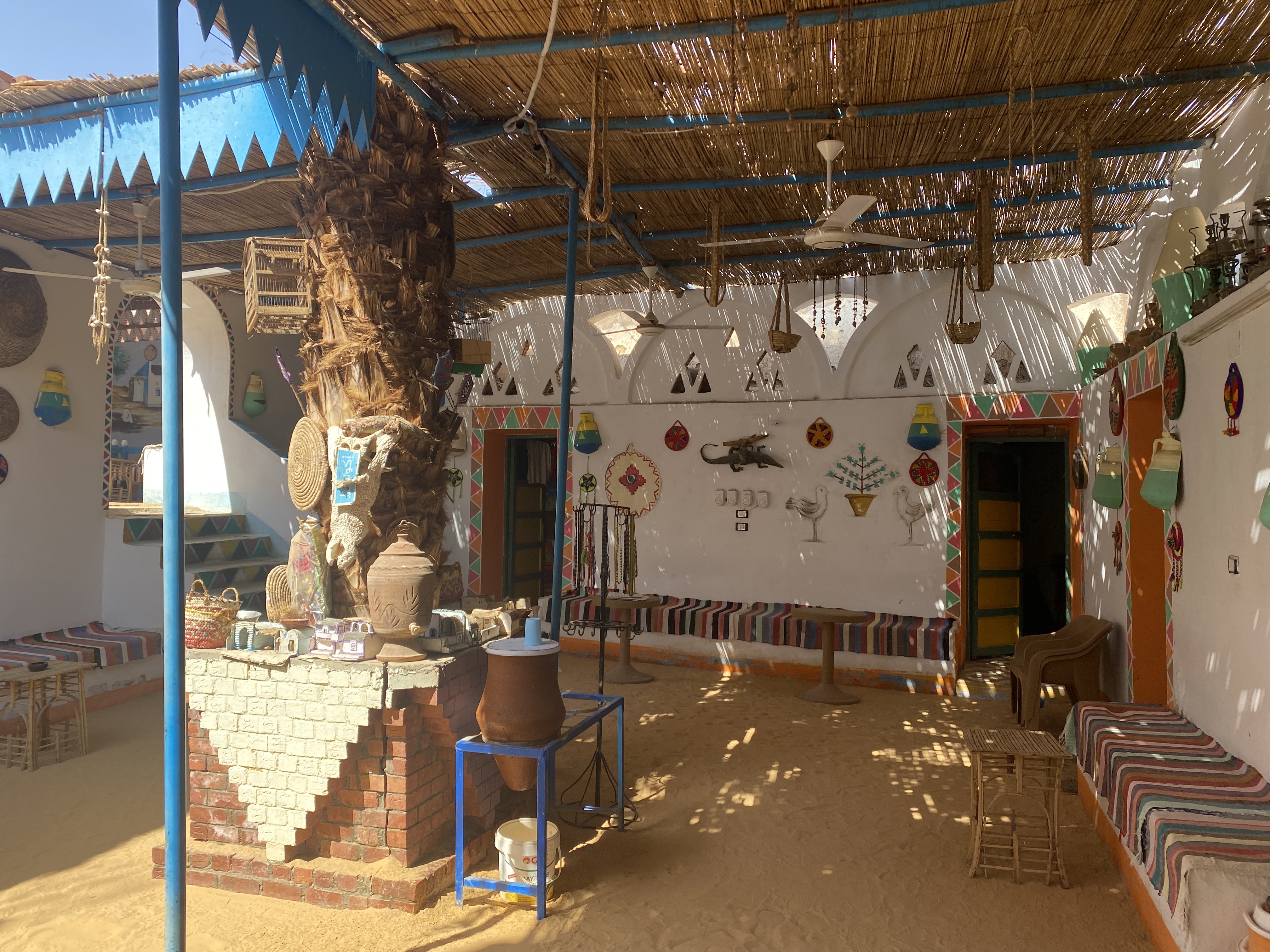 He proudly showed us what he called a typical extended family house. The amount of colorful decoration as well as the tidiness of this house contrasted a lot with the other Egyptian house we had visited. Our host told us that rain is extremely rare here, perhaps falling once every 4-5 years. Mid-summer temperatures reach over 50 degrees C or 122 degrees F. Because of these harsh conditions, Nubian houses are composed of tall domed chambers. This form lets the hot air rise, which keeps the air moving.