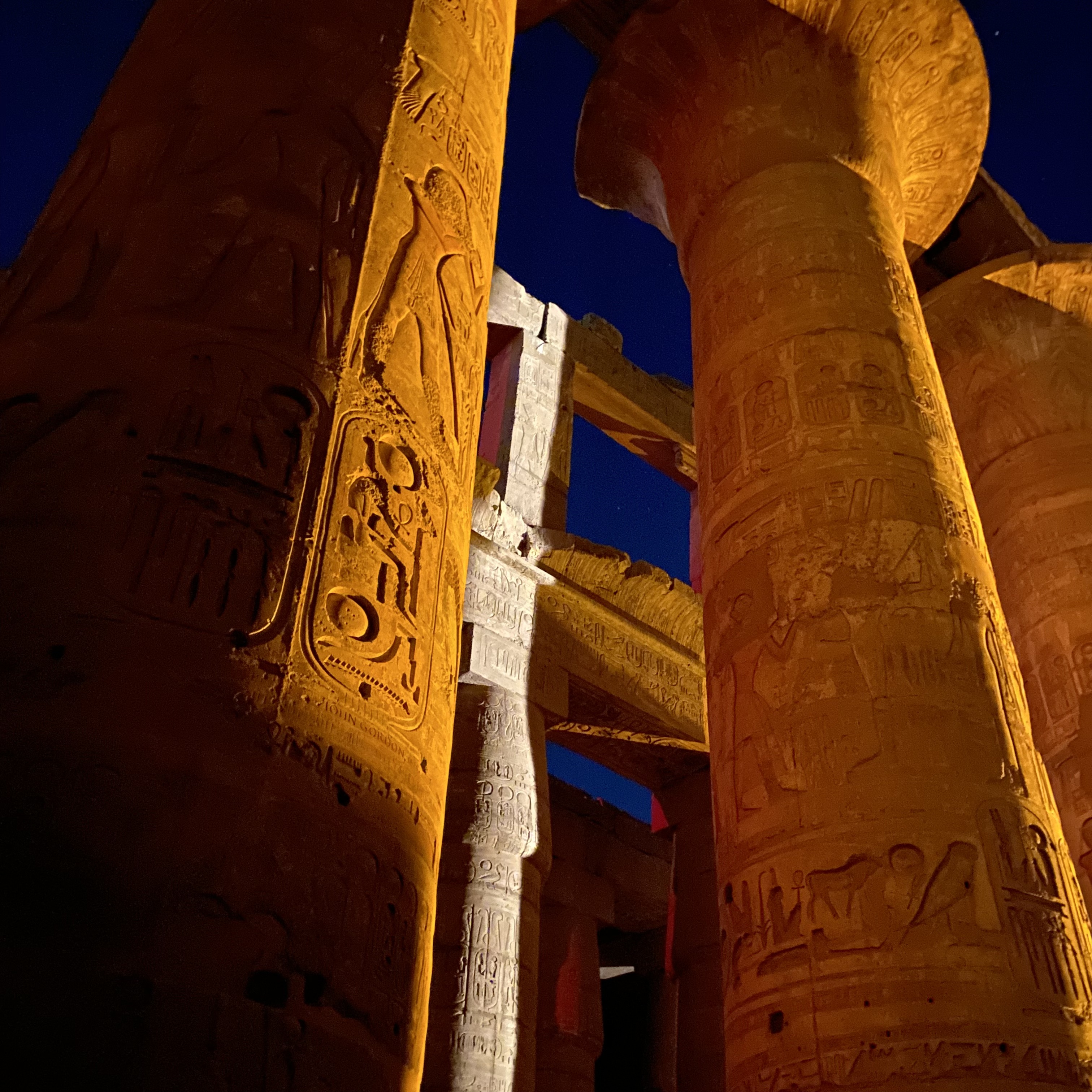 During the daytime, one of the awesome pleasures of a visit to the temple of Karnak is to walk and explore amid the gargantuan decorated columns. One of the best parts is the hypostyle hall, which means a hall composed of massive columns laid out in a grid, like the trees of an orchard. At the time of construction, when the ancient Egyptians didn’t have the technology of the arch, they were limited to wood or stone beams to span between columns. For stone beams and slabs, which was their choice here, the spans possible were short compared to the awe-inspiring expressive columns that the pharaohs and priests required. The result is a mystical stone grove that dwarfs us mere mortals. For the nighttime Sound and Light show, we looked forward to walking amid the columns, in semi-darkness, with projected lights and images and a transporting soundtrack.