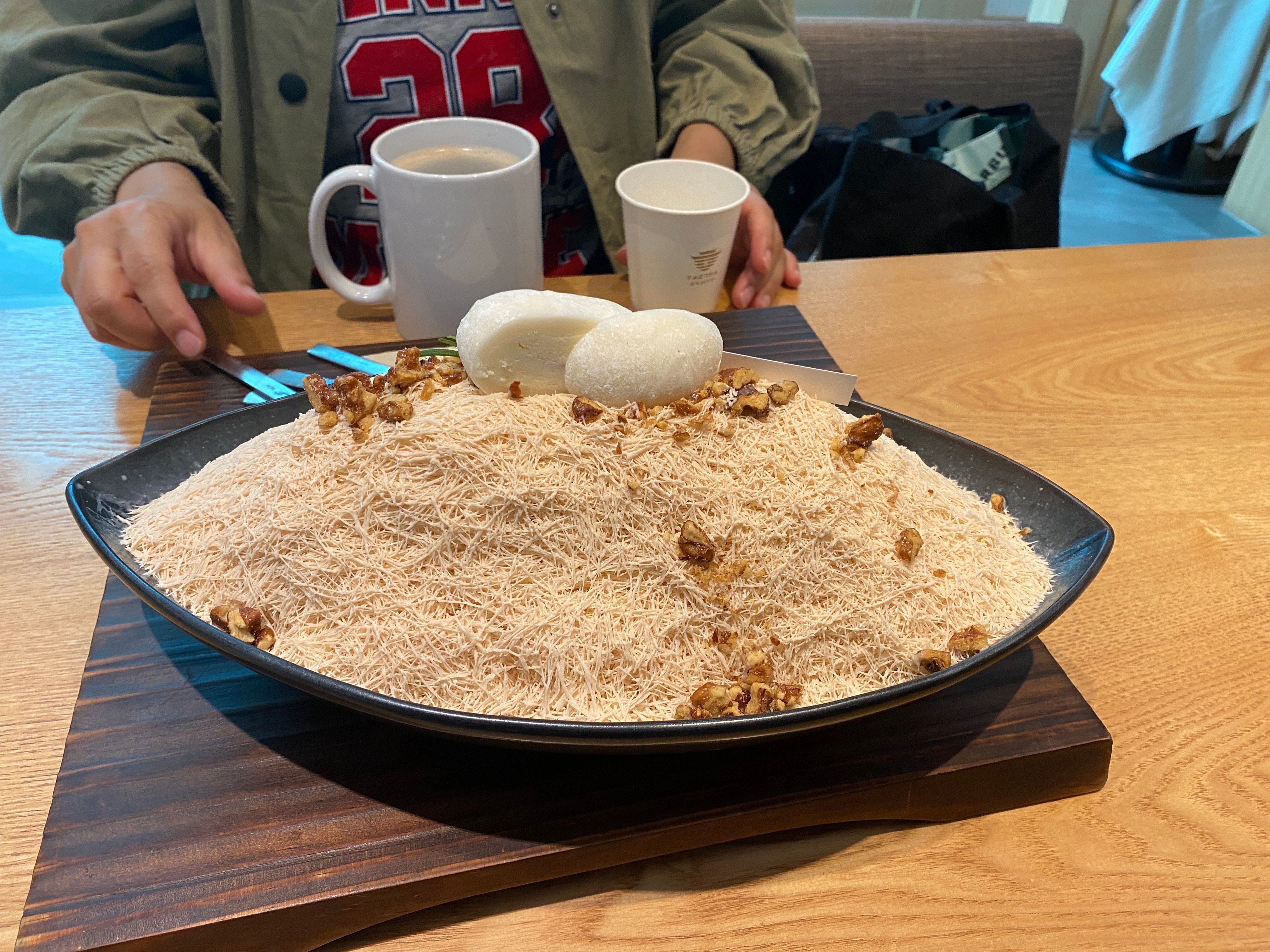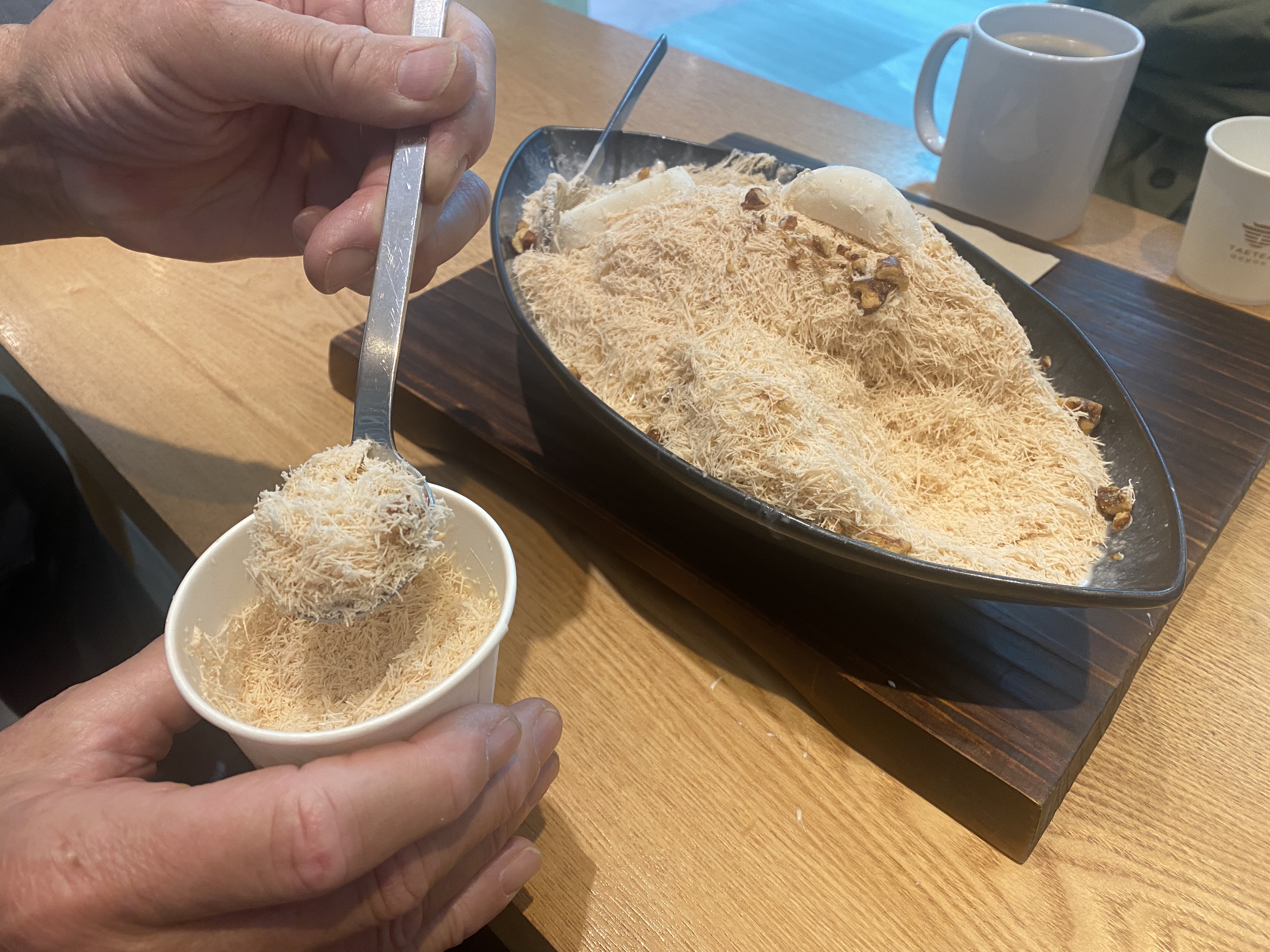 Milk-tea shaved ice: This is a store famous for fine old Chinese teas. A famous summer treat is frozen milk tea, shaved into fine fine ice needles. (We visited on one of the last days of the season for the frozen delight.) The dish looks like a pile of tiny dry filaments. Then in mouth: fluffy, very light, followed by the delicate chill of the ice, then melting into sweet milk tea. Amazing!