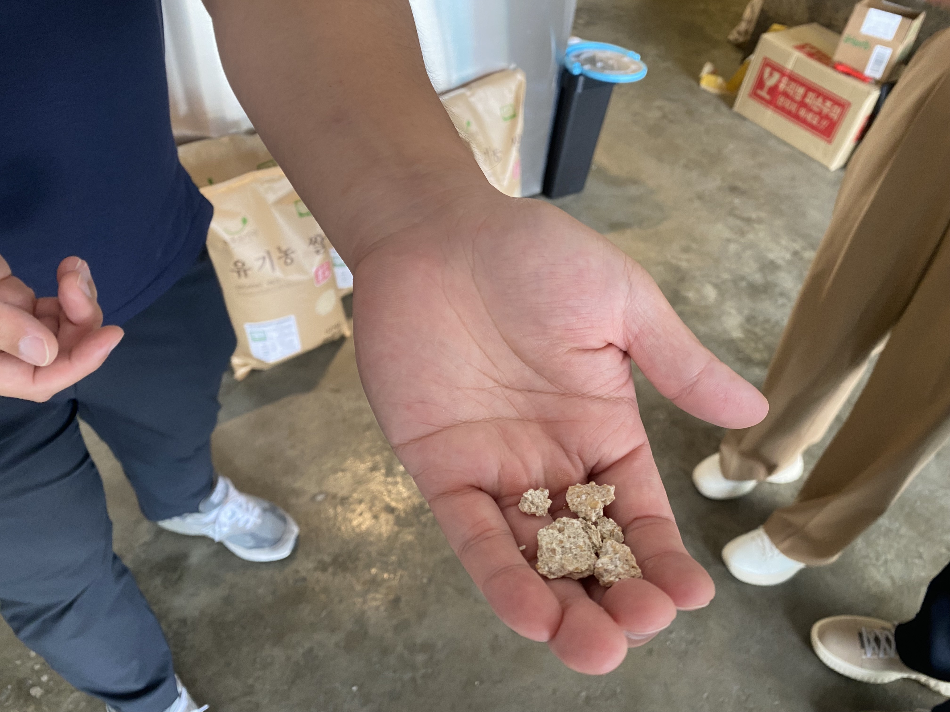 The ingredients are simple: short grain rice (high in the carbs whose sugars become alcohol), water, and natural yeasts. The natural yeasts come from the environment, not from manufactured packages. While environmental yeasts are important, for a bigger production and for consistency, the brewers use concentrated yeasts and microbes; they come from wood, and look like chips of limestone. These yeasts, and other microbes, are the big variable, determining the taste of each run of makgeolli.