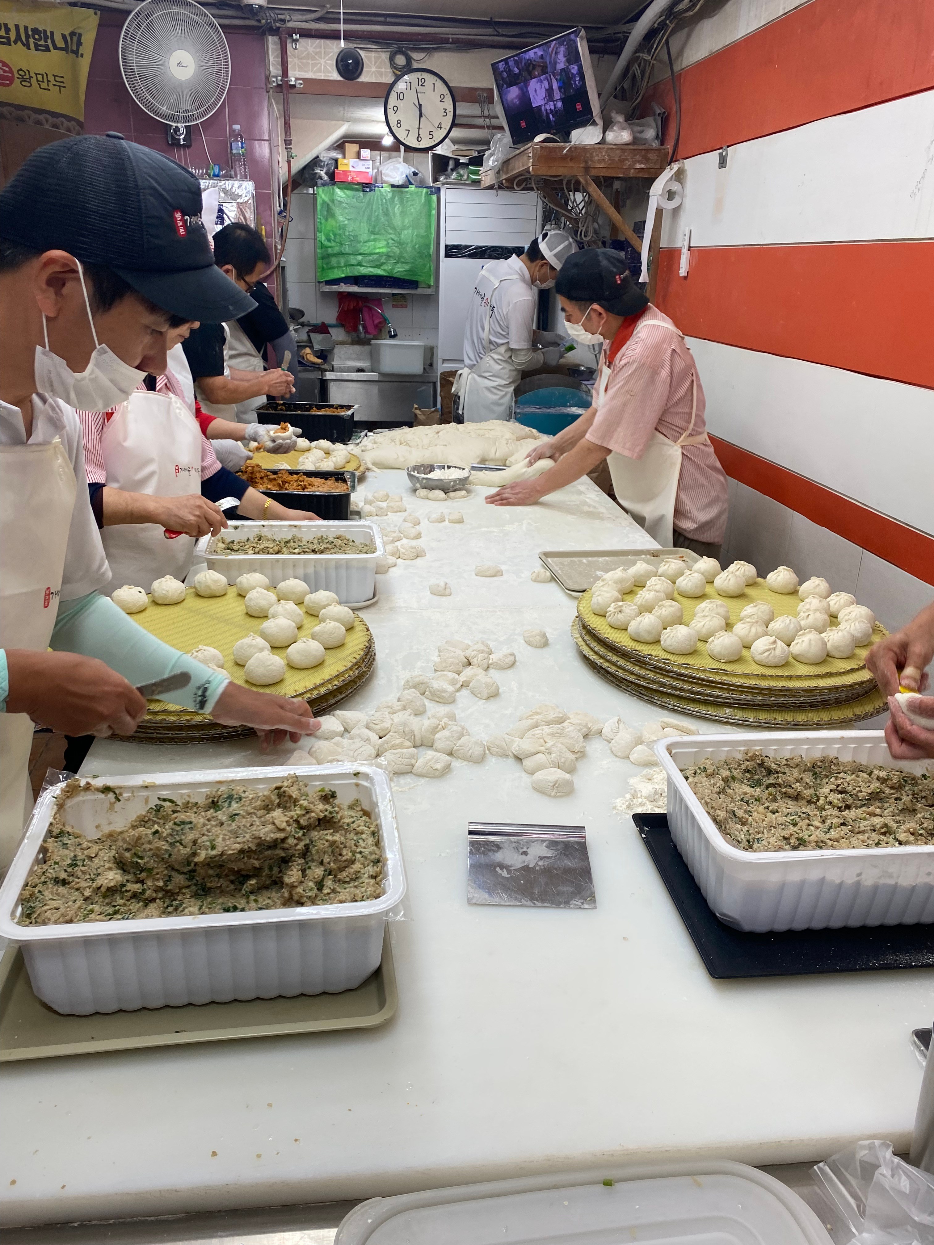 The stuffed dumplings being made inside the storefront.
