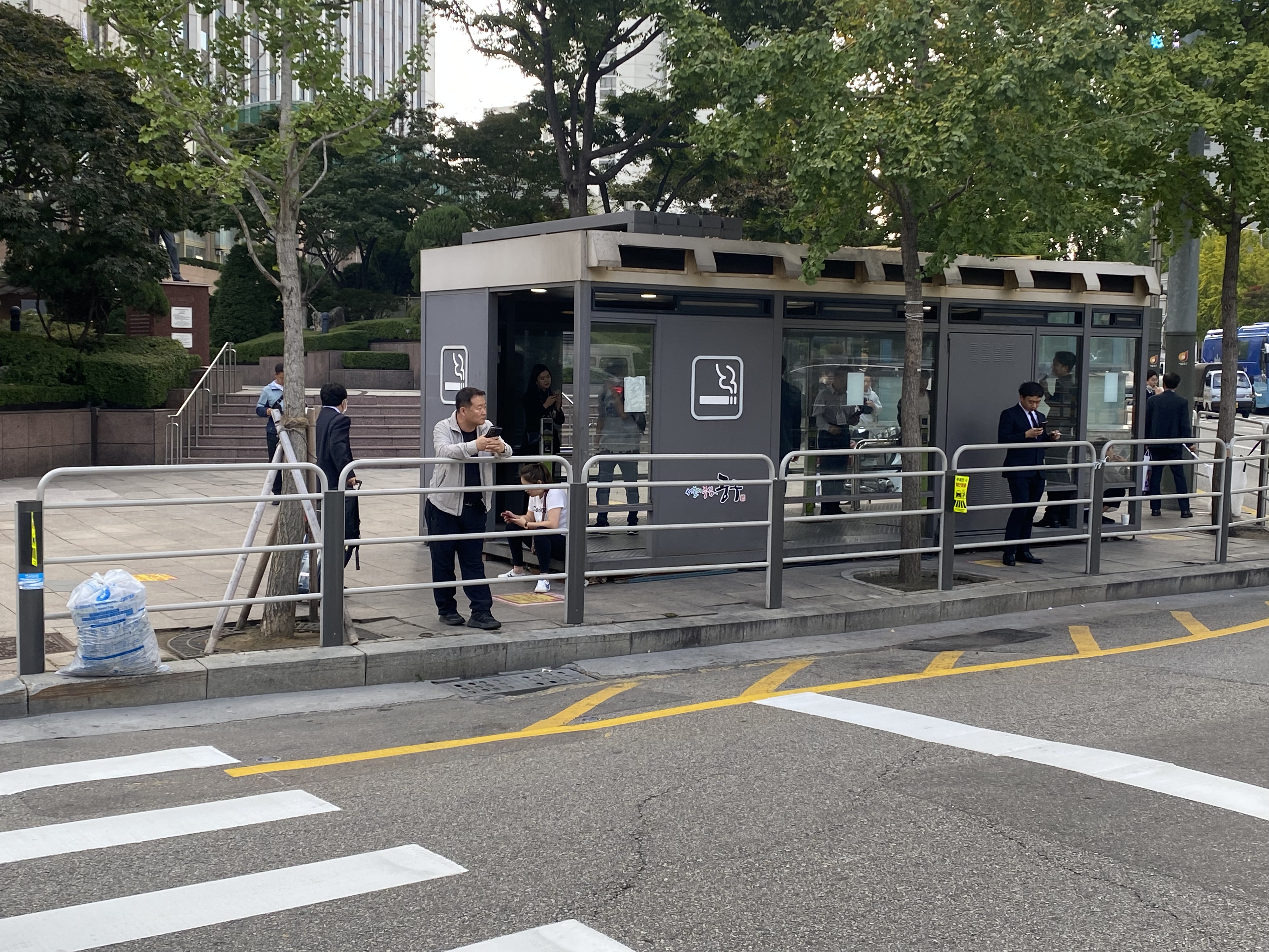 We were impressed to find No Smoking signs on the sidewalks. No Smoking even outside. But if you have to smoke, there are prominently placed pavilions for you; like the smoking rooms in airports, but outside on street corners.