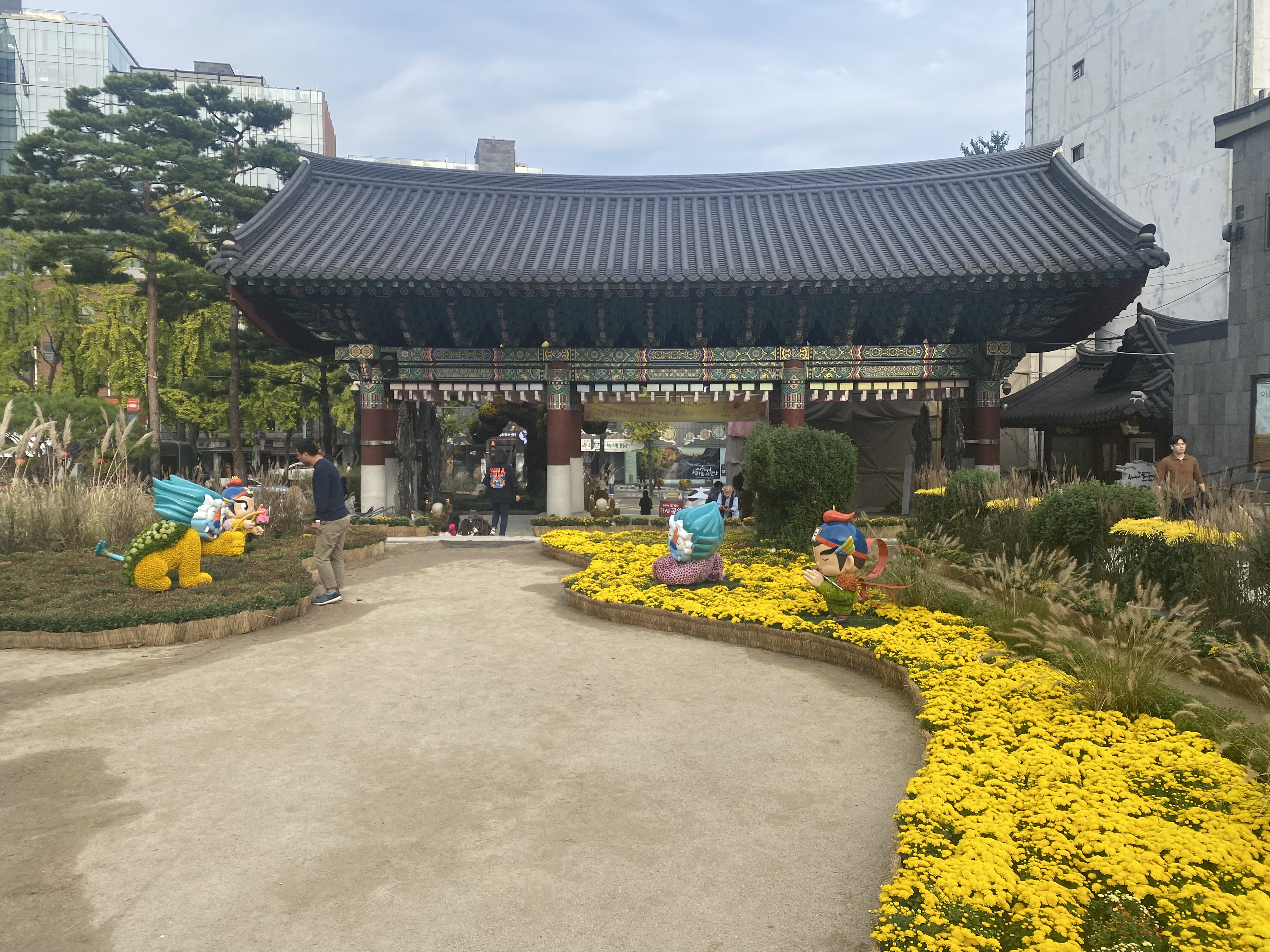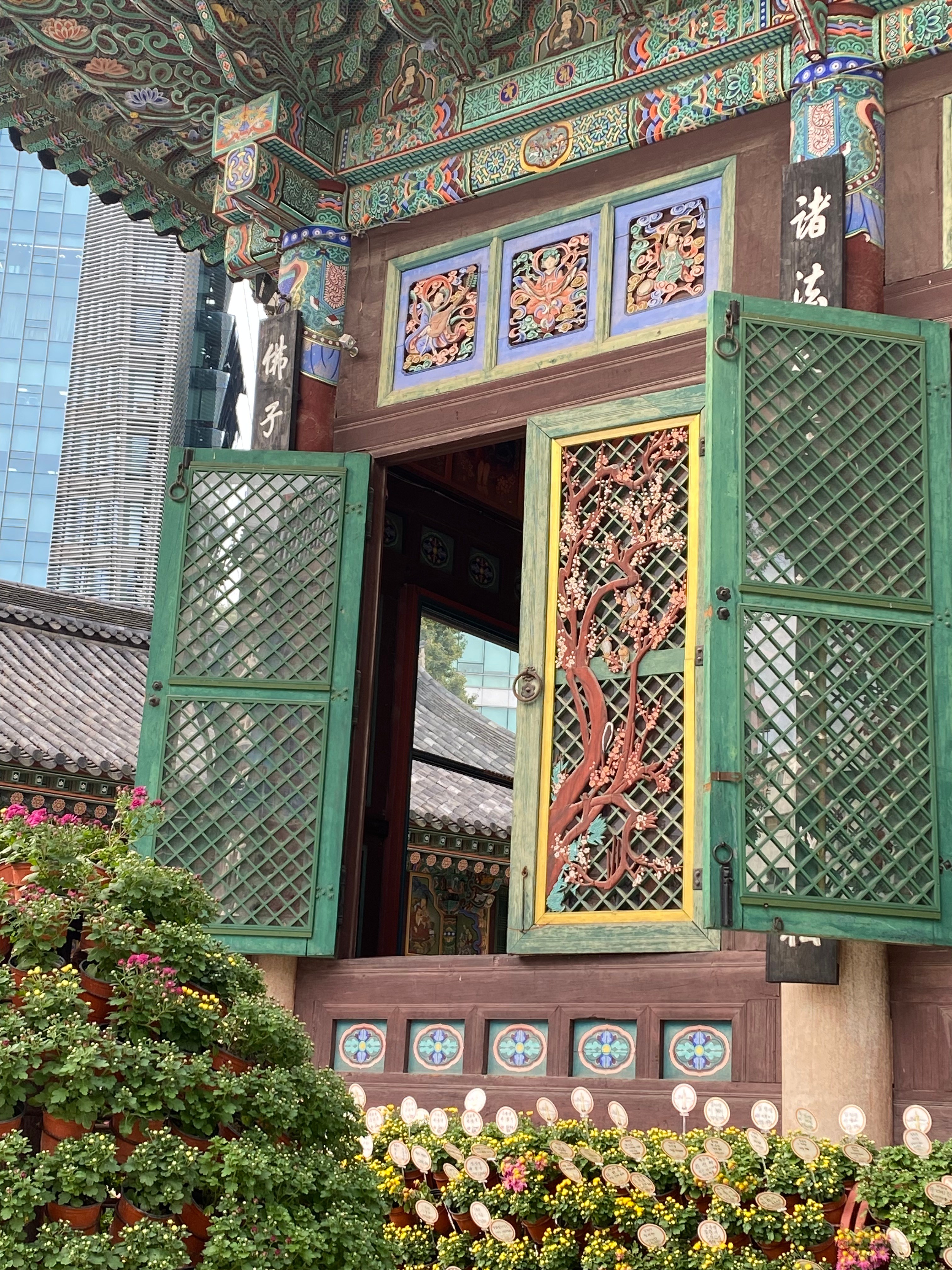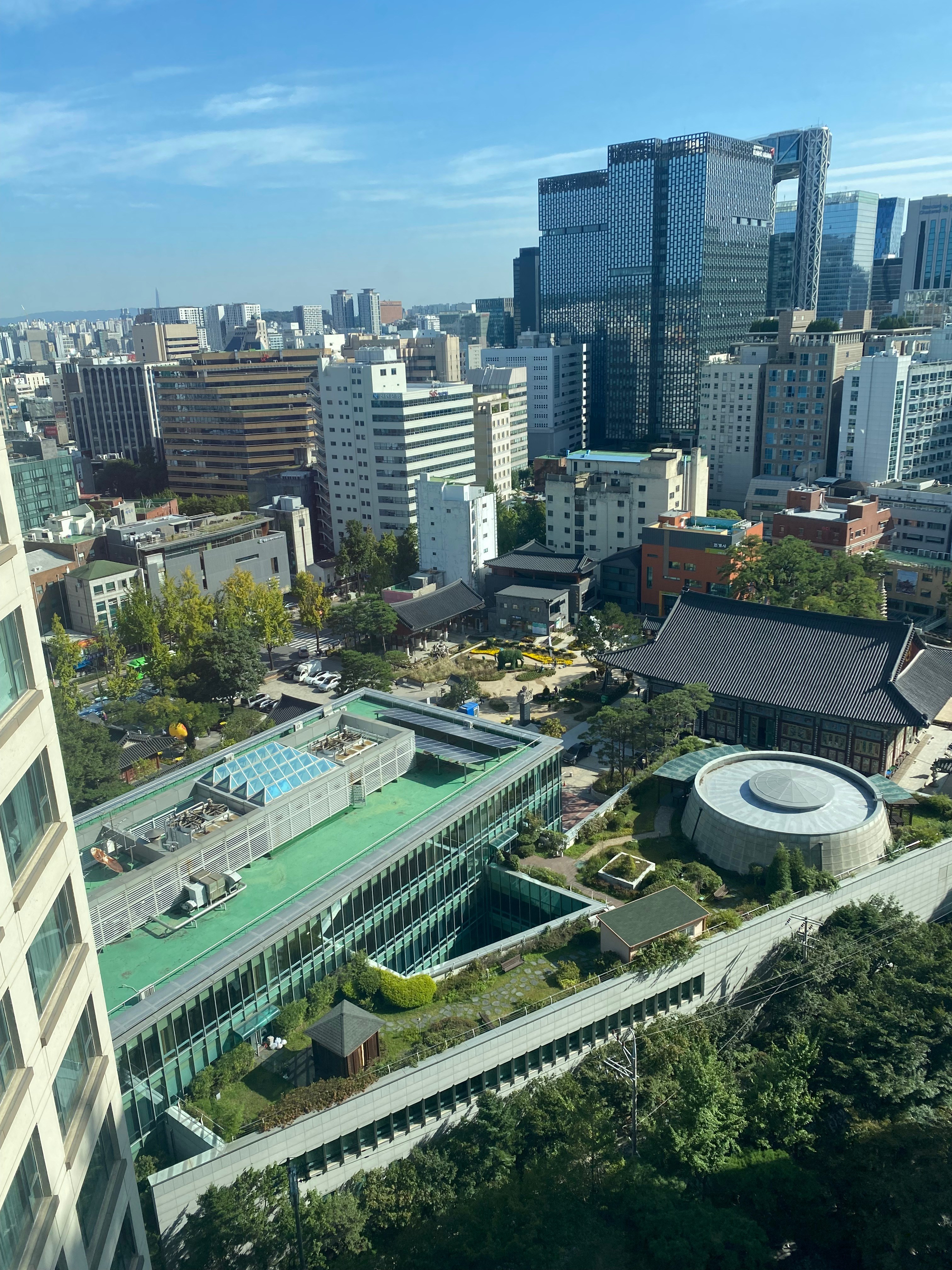 A collection of traditional-looking buildings, flowers and trees lay right below our hotel window in Seoul. The open space and the distinctive roofs stood out amid the hyper-modernity of the surrounding city.
