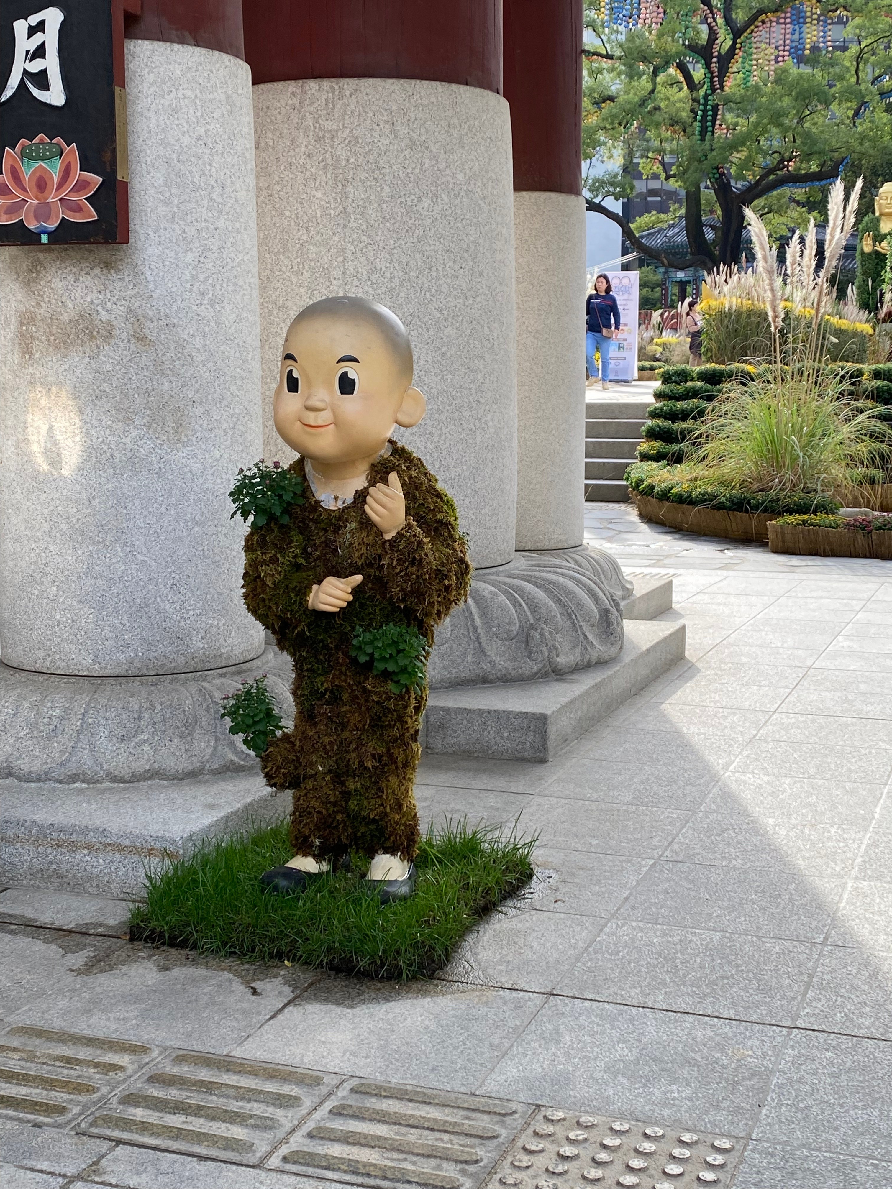 When you walk around the plazas and gardens, you are never alone. We don’t just mean fellow visitors. There are sculpted figures everywhere. Some are obvious and serious: a happy baby Buddha, a protective lion.