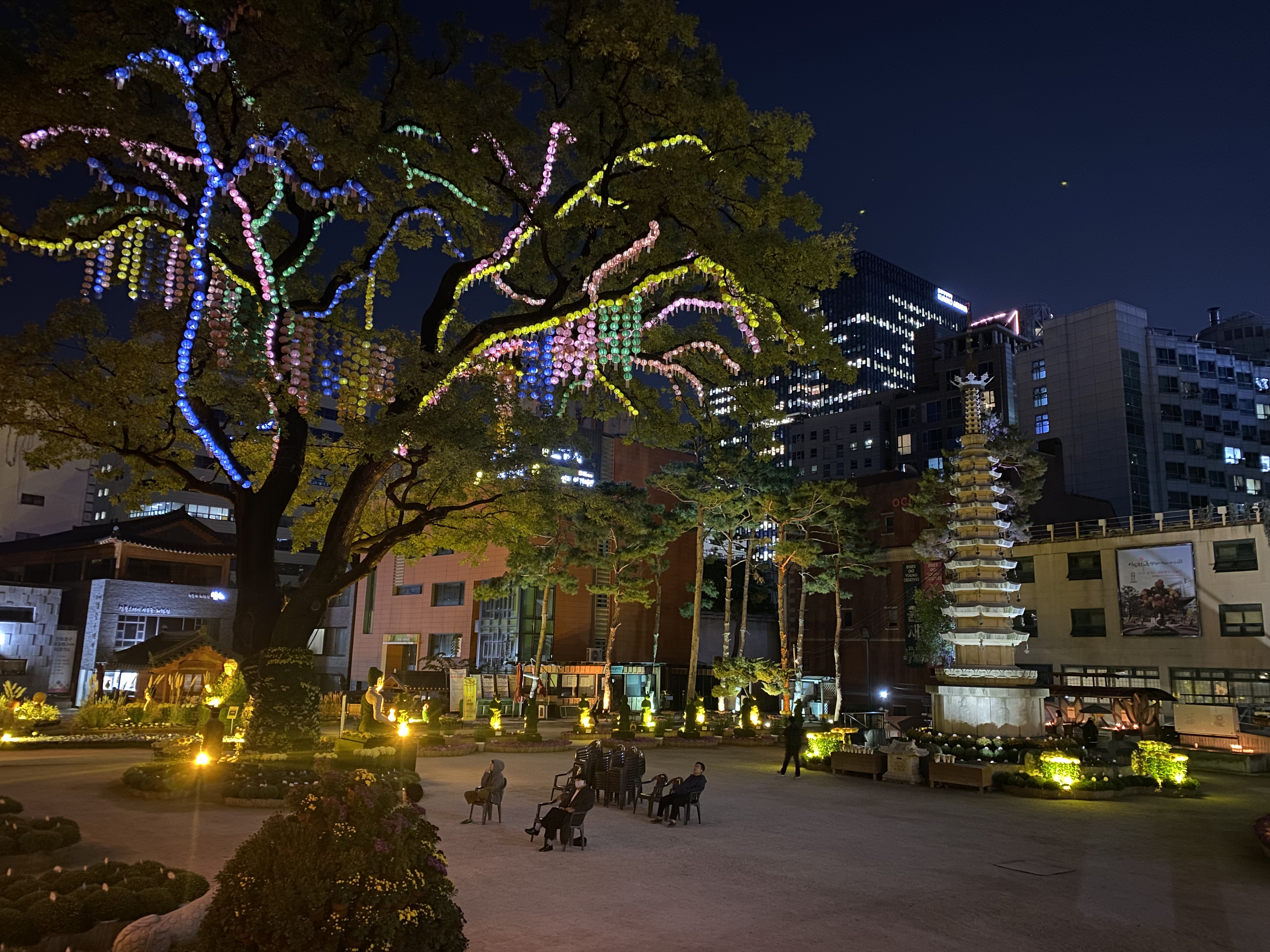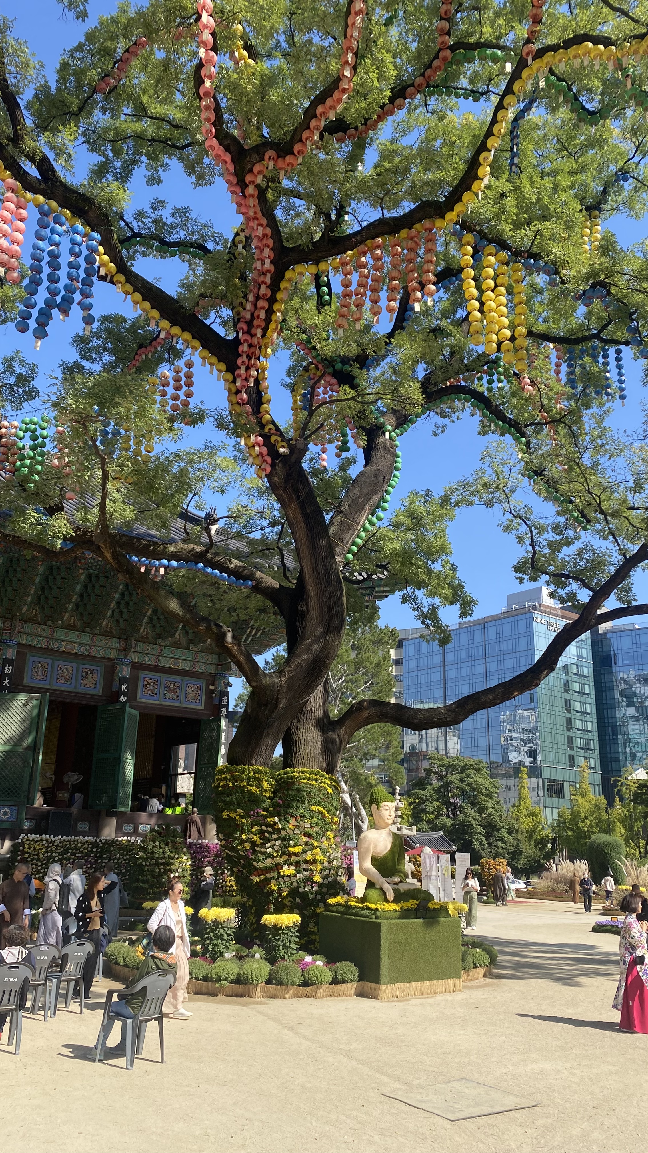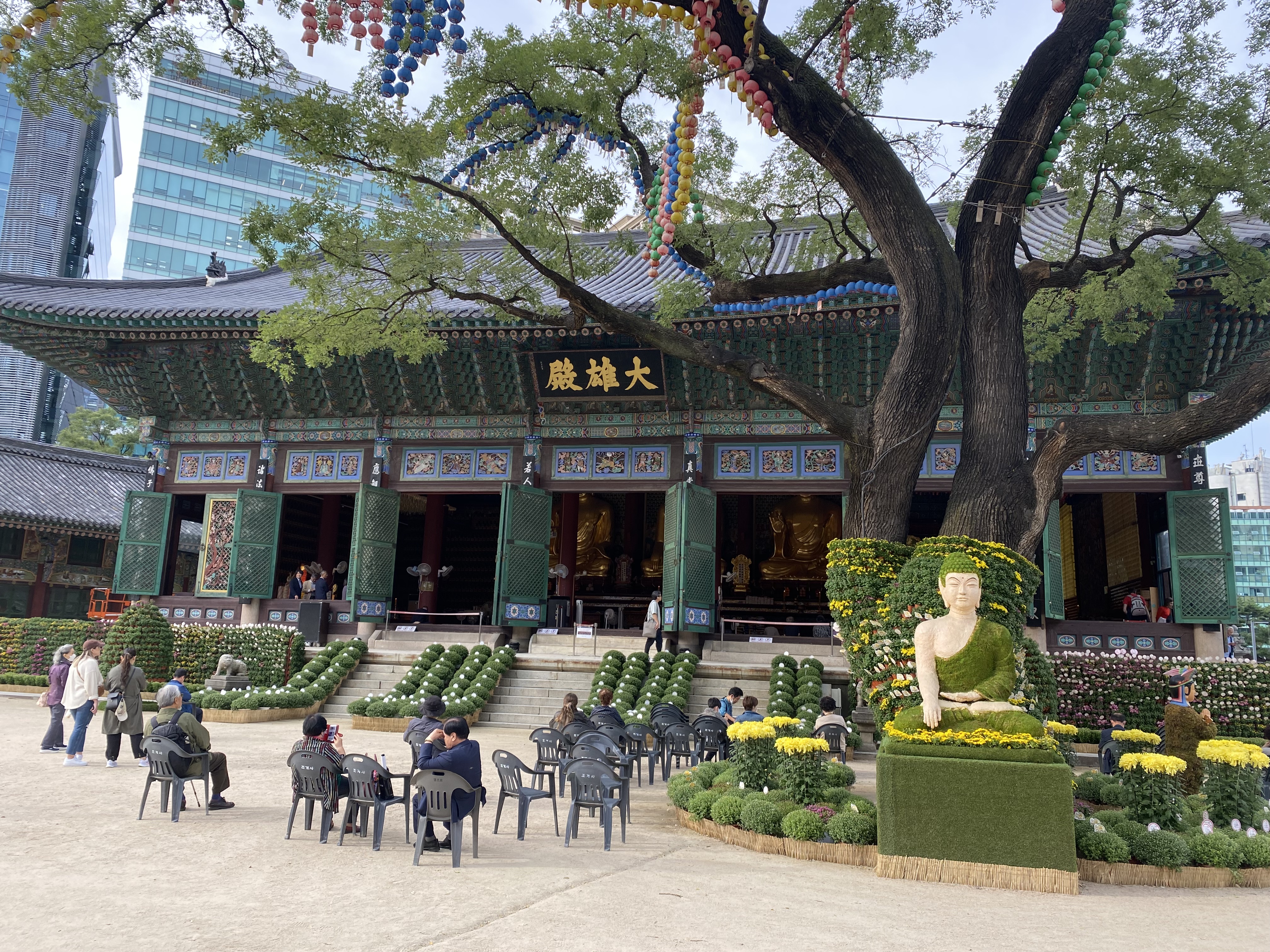 Every time we visited the Jogyesa (we stopped by multiple times to and from the hotel), we remarked on the folks who were casually sitting around under the Chinese Scholar tree in front of the Daeungjeon main hall. Some seemed devotional, some seemed to be resting, some checking their text messages. Very relaxed and open place.