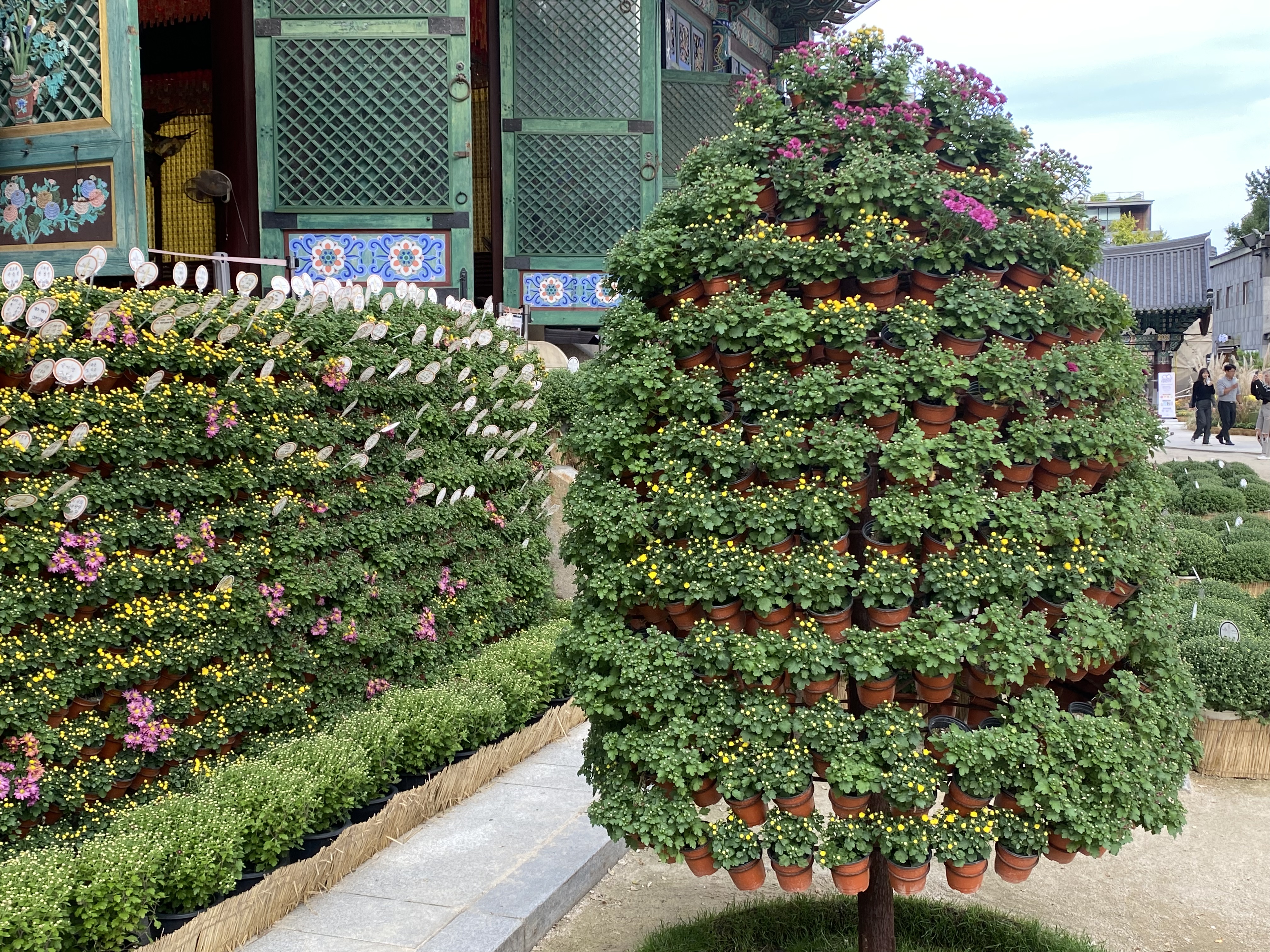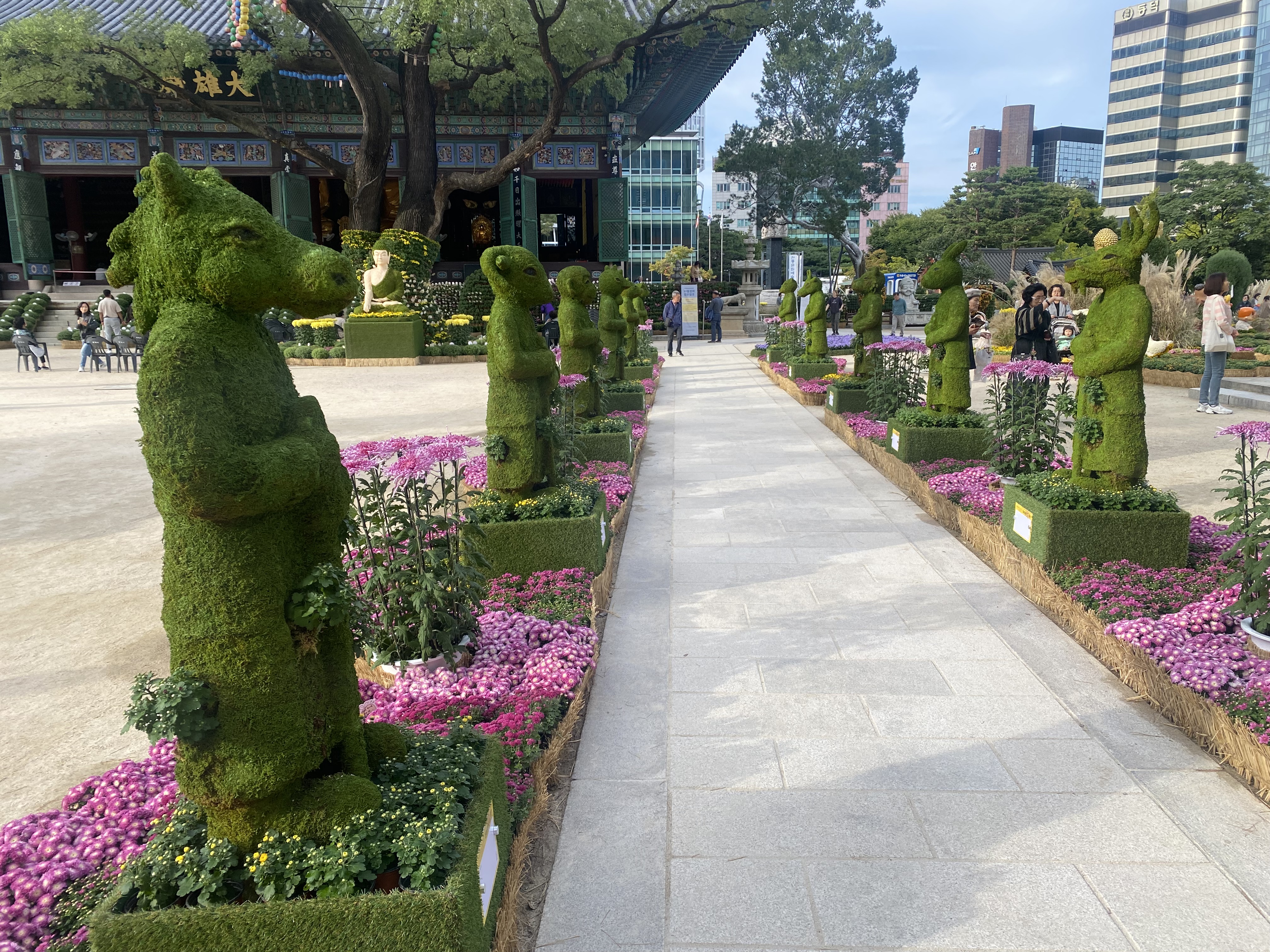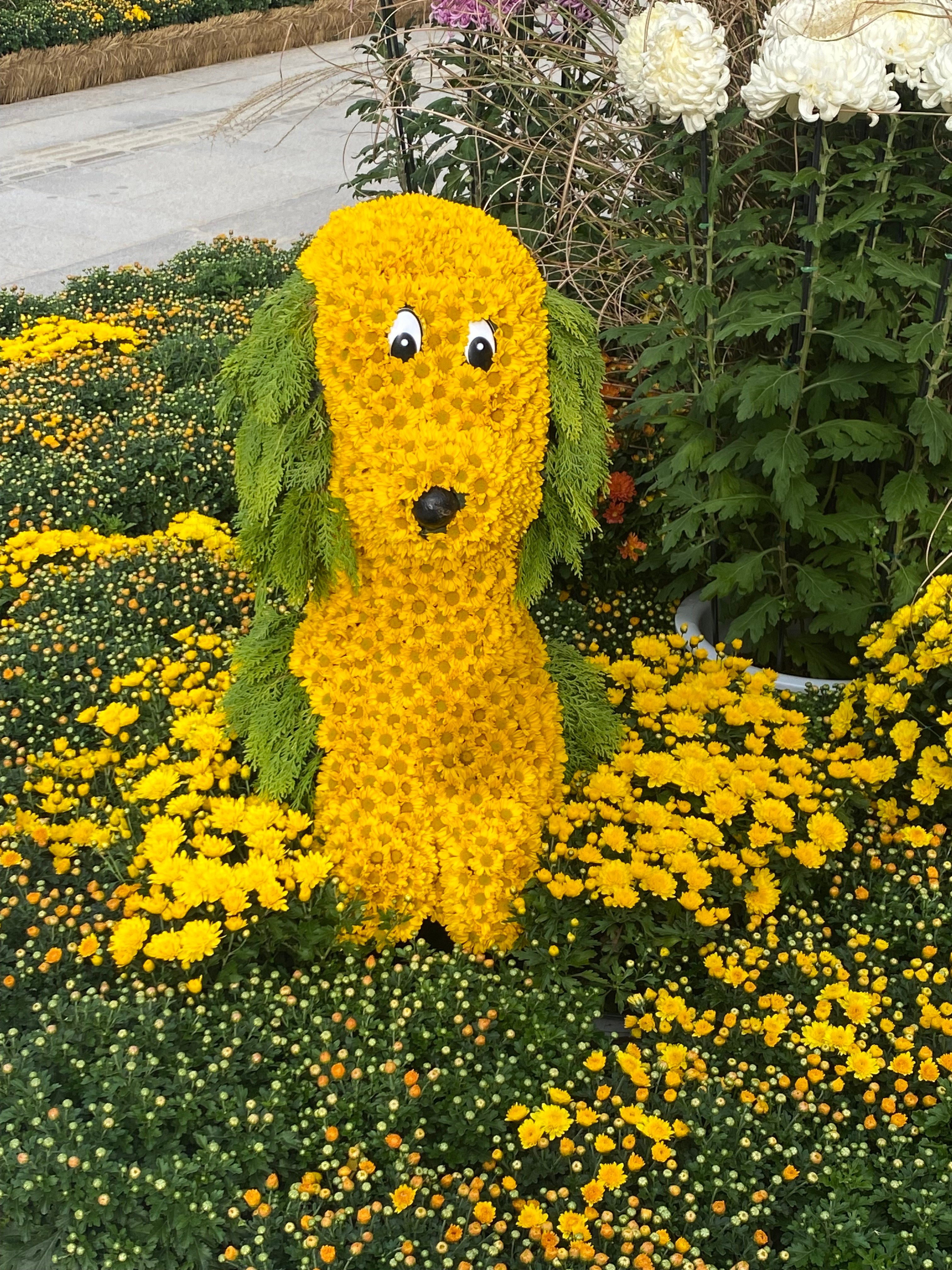 We happened to be visiting during the month-long fall Chrysanthemum Festival. Potted chrysanthemum plants were everywhere, turned into sculptures, cartoon trees, elephants and green walls.