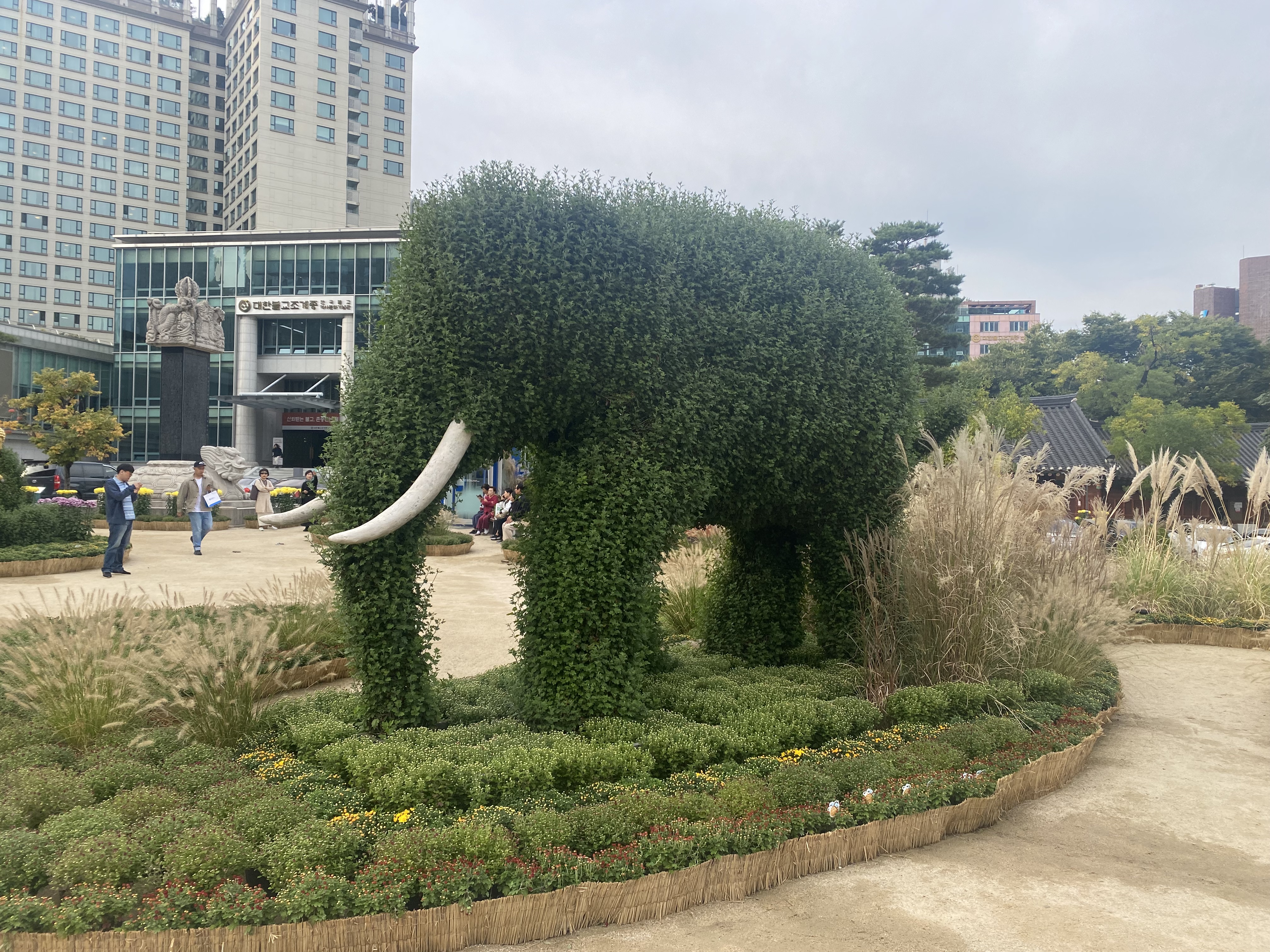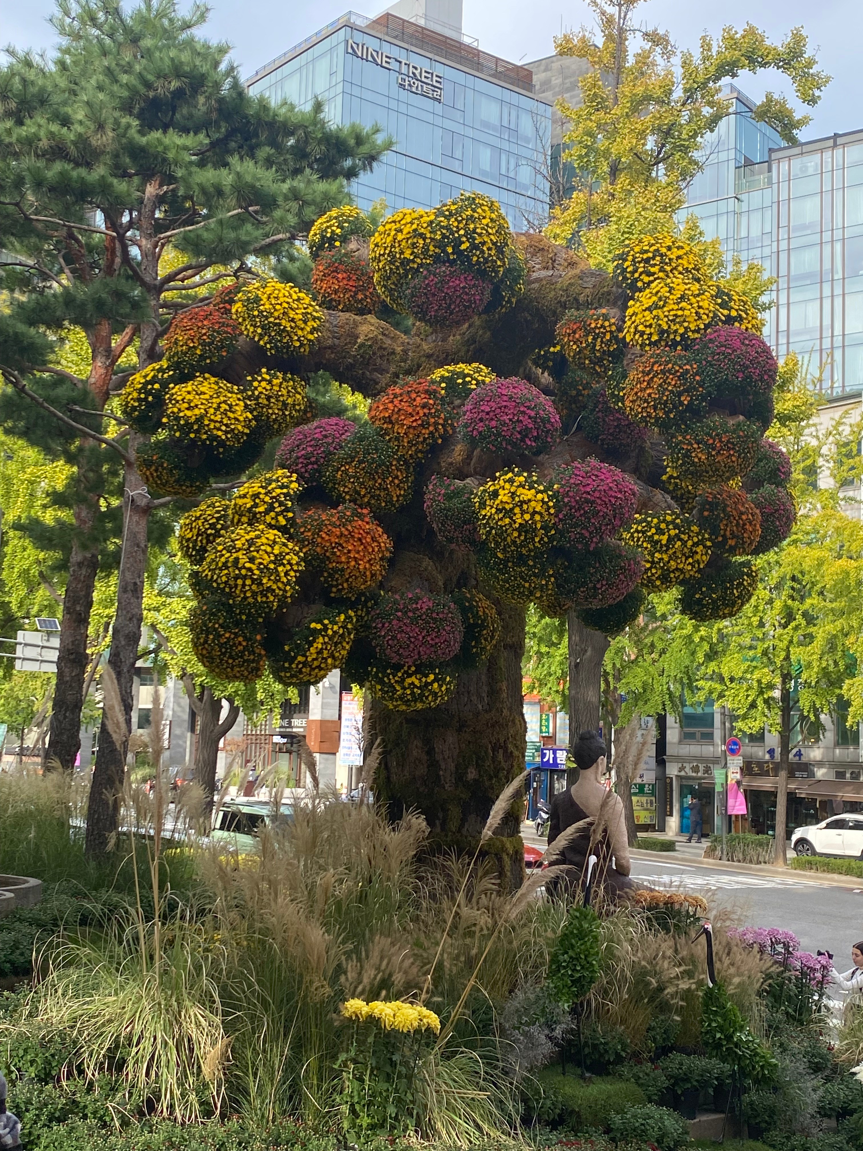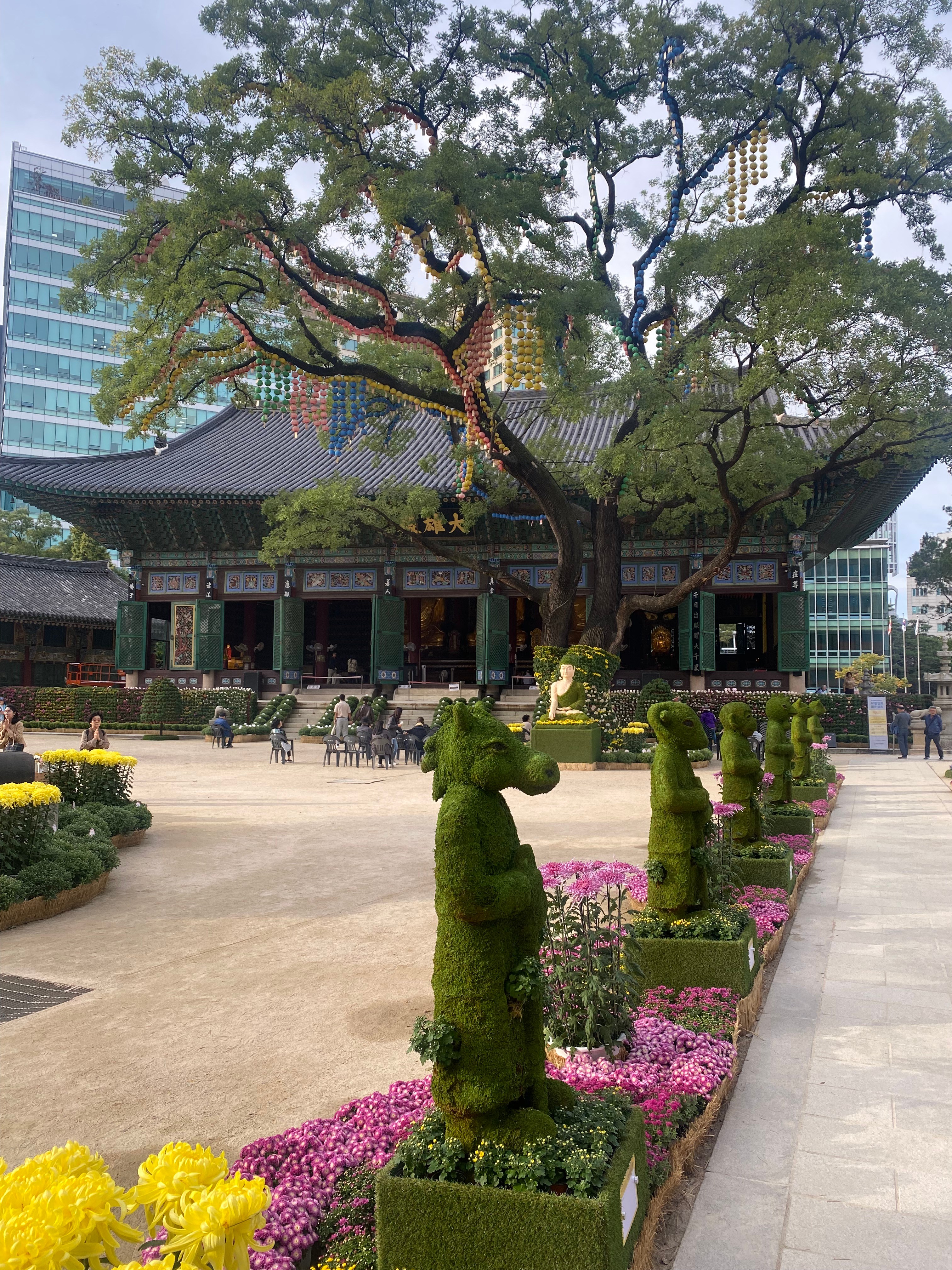 We happened to be visiting during the month-long fall Chrysanthemum Festival. Potted chrysanthemum plants were everywhere, turned into sculptures, cartoon trees, elephants and green walls.