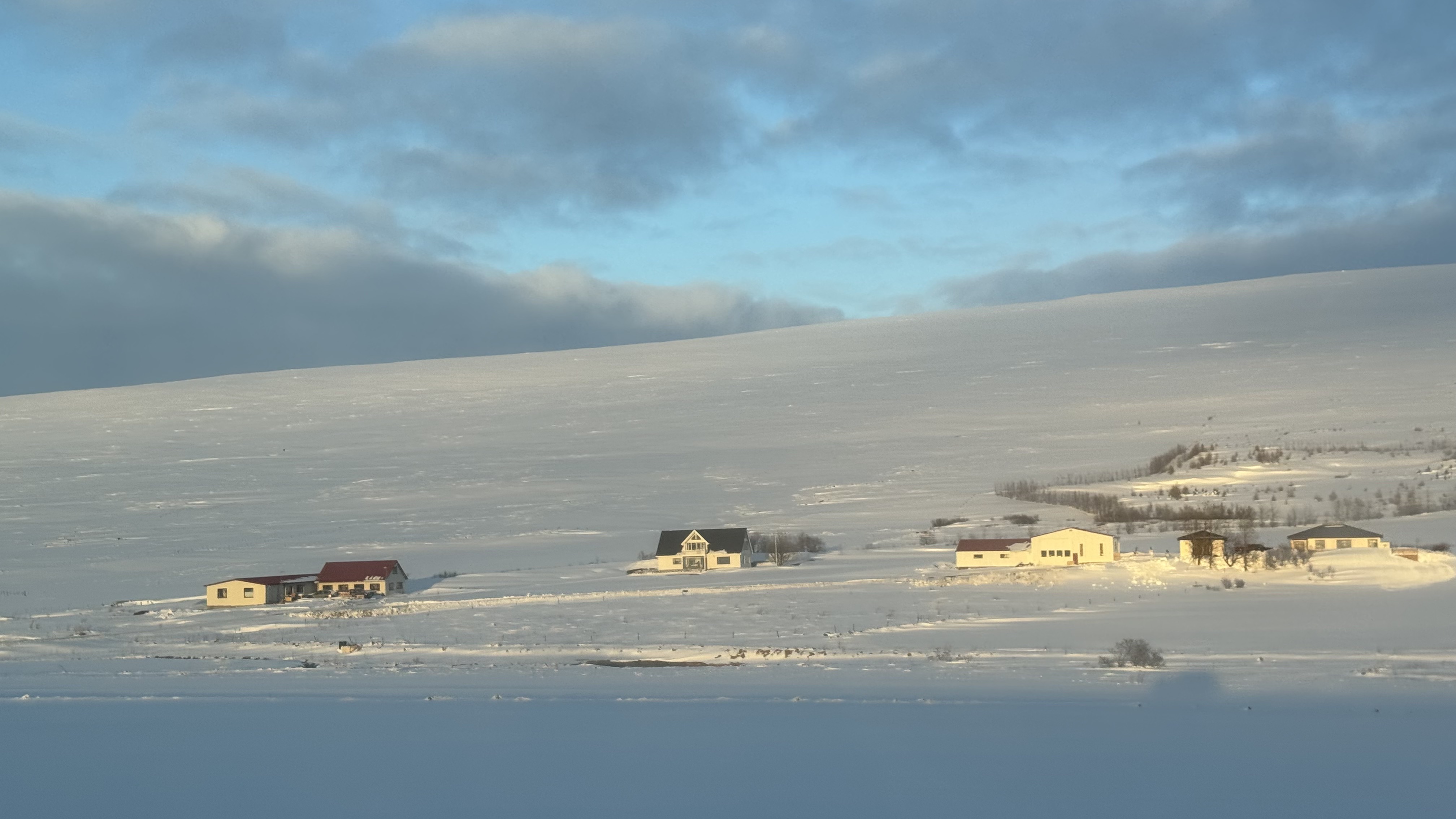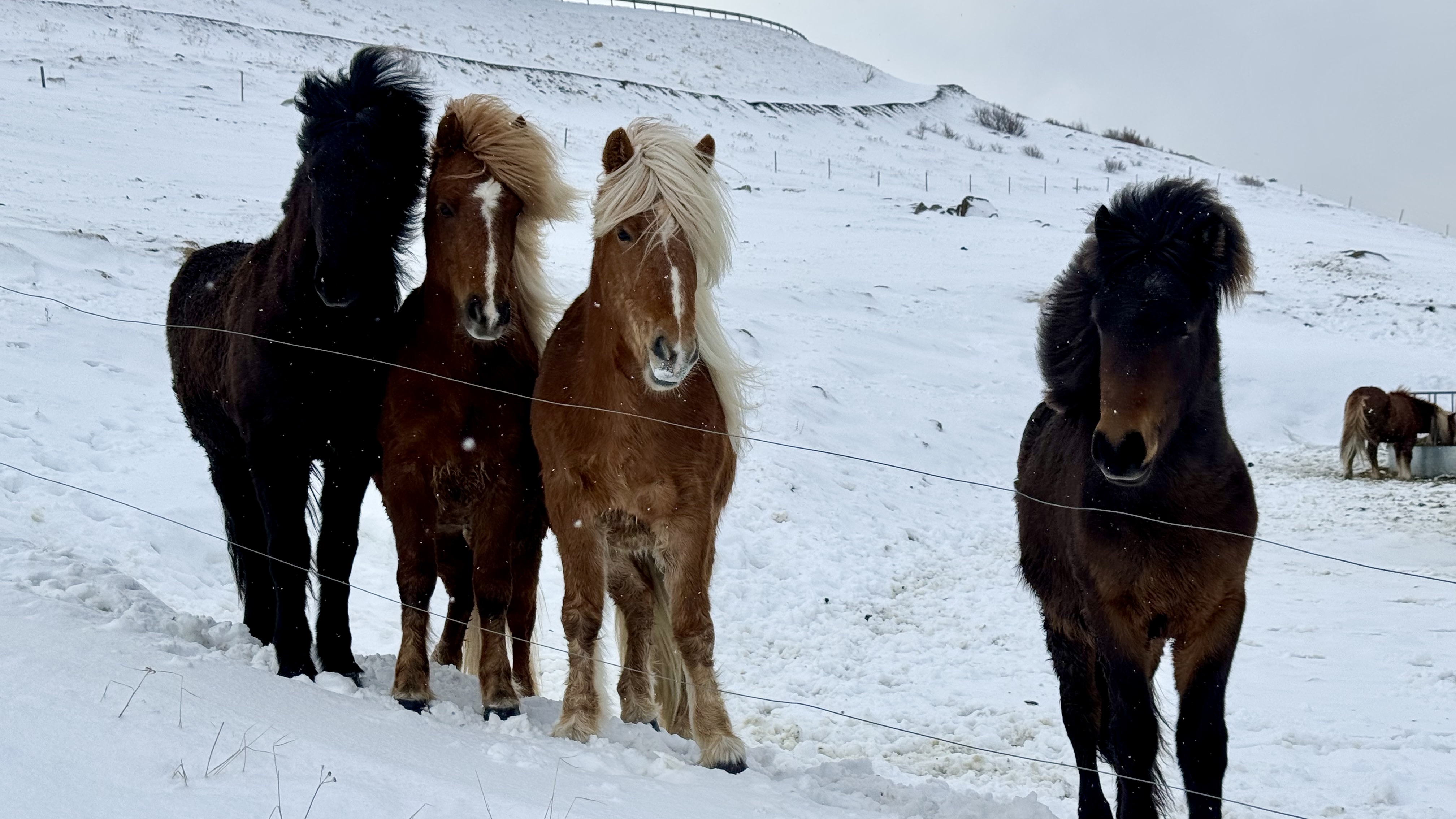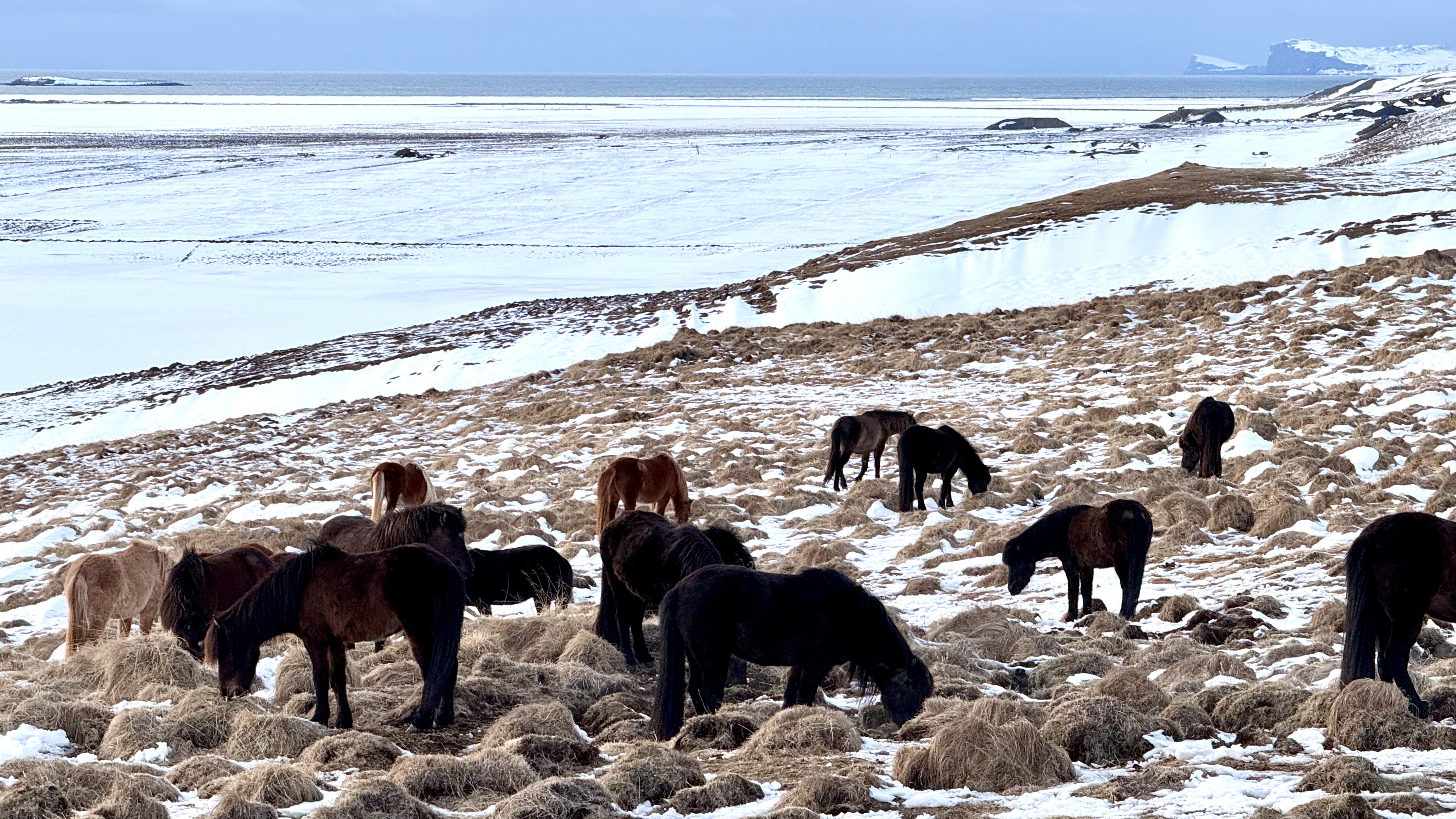 We saw clusters of Iceland horses grazing on piles of hay. Iceland horses insist on staying outside, no matter the weather.