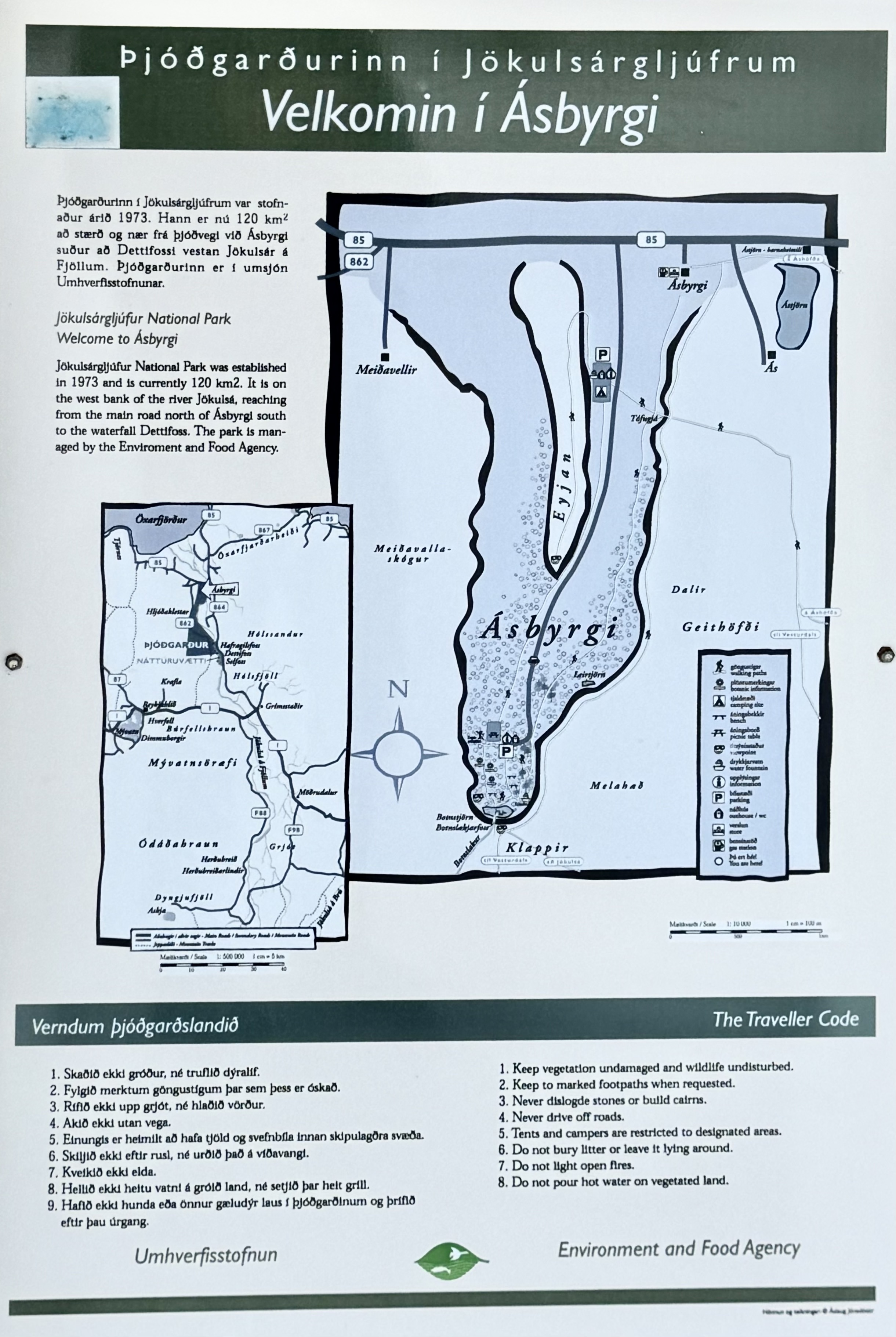 At one point, Gunnar headed off the main road inland and into the open end of a unique canyon called Ásbyrgis. From the air, you would see a long triangular cut from the sea into the highlands, with a long stubborn mesa in the middle — a bit like a horseshoe. Of course, there are Icelandic myths to explain this place. Perhaps it was Sleipnir, Odin’s flying horse that touched the ground here with one of his eight great hooves. Perhaps. But it is more likely that between two and five thousand years ago, a volcanic eruption released great glacial lakes inland. The vast amounts of water crashed through the land and into the sea in a matter of only a day or two.