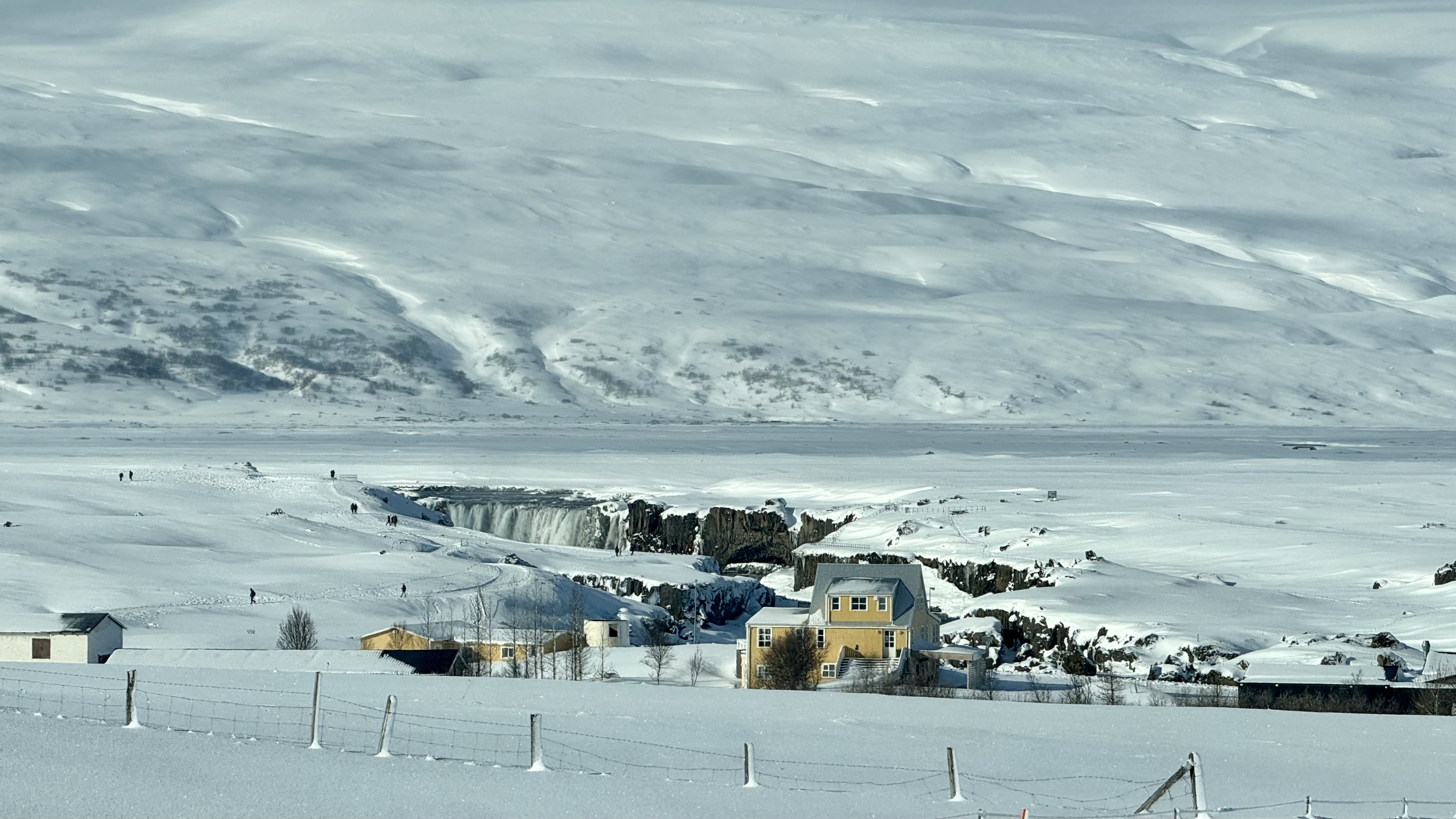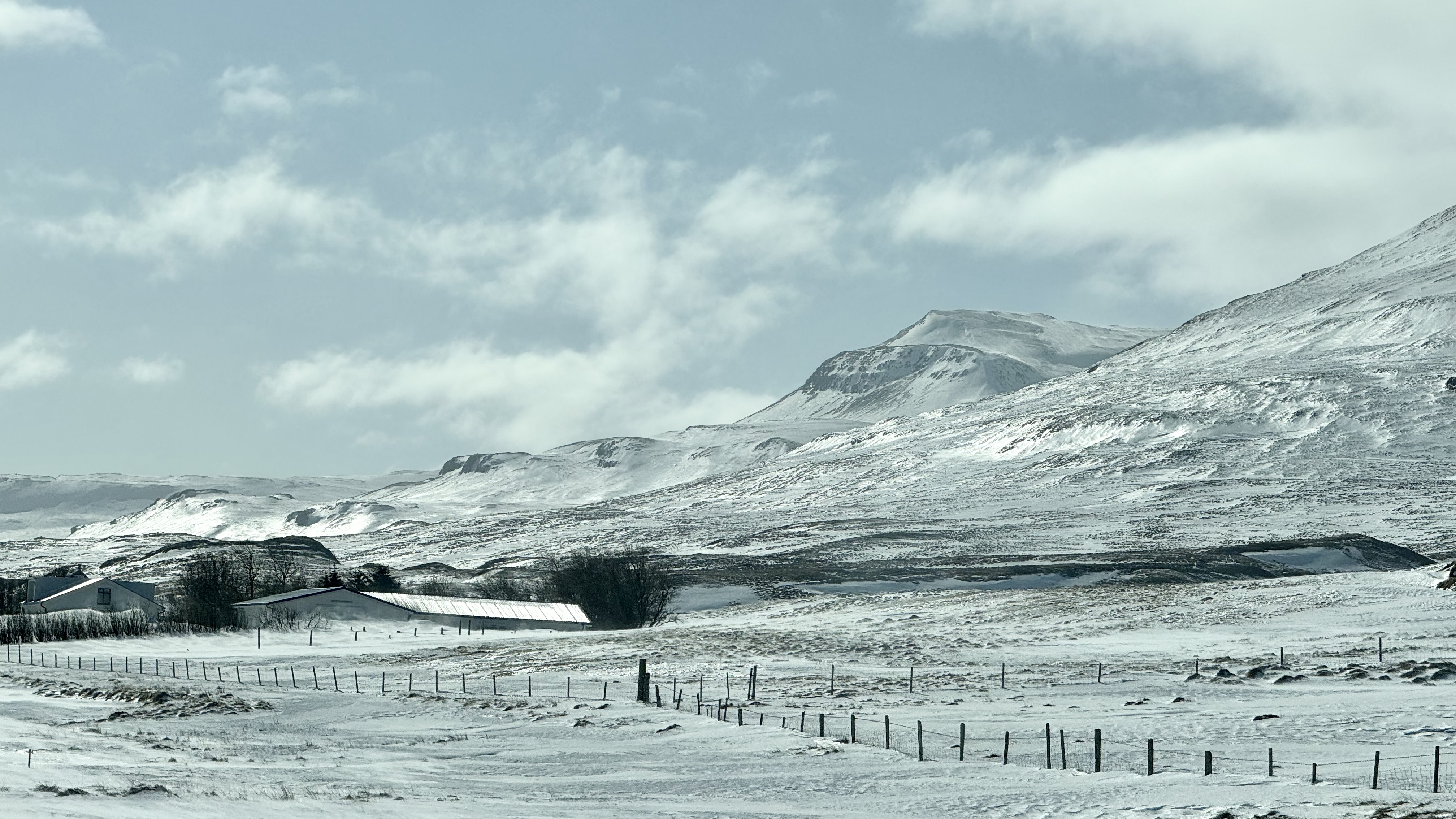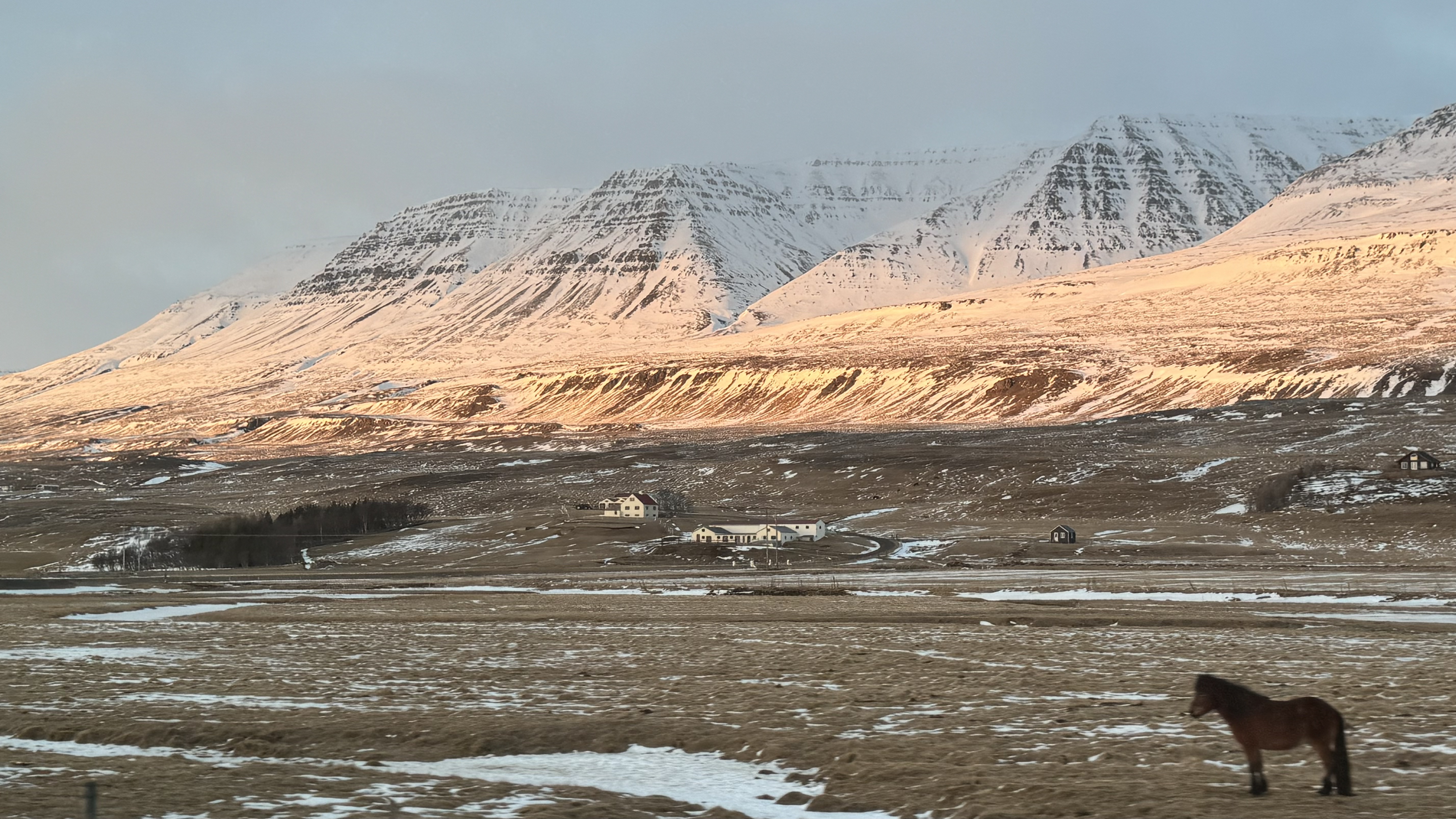 Our base for two other nights was an isolated guest house upslope from a broad fjord. (Icelandic fjords are much wider and shallower than Norwegian or New Zealand fjords.) Snowy expanses, mountain vistas and even Icelandic horses were our only neighbors out there.