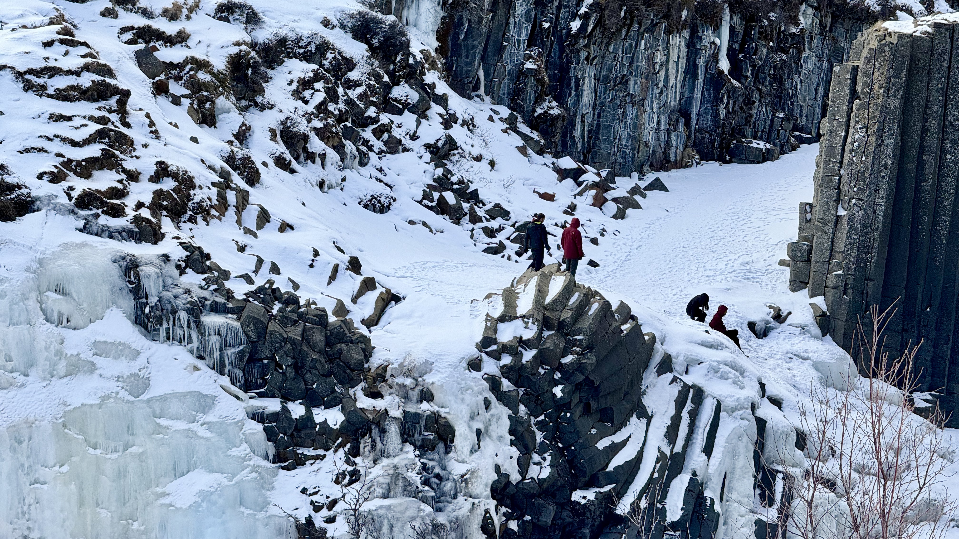 All that science and myth is interesting. But the best part was a quiet walk in the winter forest, framed by the black cliffs. Quiet, except for the crunch of our boots on the icy snow.